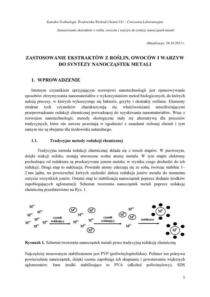 Katedra Technologii Środowiska Wydział Chemii UG – Ćwiczenia Laboratoryjne Zastosowanie ekstraktów z roślin, owoców i warzyw do syntezy nanocząstek metali Aktualizacja: 20.10.2015 r. ZASTOSOWANIE EKSTRAKTÓW Z ROŚLIN, OWOCÓW I WARZYW DO SYNTEZY NANOCZĄSTEK METALI 1. WPROWADZENIE Istotnym czynnikiem sprzyjającym rozwojowi nanotechnologii jest opracowywanie sposobów otrzymywania nanomateriałów z wykorzystaniem metod biologicznych, do których należą procesy, w których wykorzystuje się bakterie, grzyby i ekstrakty roślinne. Elementy struktur tych czynników charakteryzują się właściwościami umożliwiającymi przeprowadzanie redukcji chemicznej prowadzącej do uzyskiwania nanomateriałów. Wraz z rozwojem nanotechnologii, metody ekologiczne stały się alternatywą dla procesów tradycyjnych, które nie zawsze pozostają w zgodności z zasadami zielonej chemii i tym samym nie są obojętne dla środowiska naturalnego. 1.1. Tradycyjne metody redukcji chemicznej Tradycyjna metoda redukcji chemicznej składa się z trzech etapów. W pierwszym, dzięki reakcji redoks, zostają utworzone wolne atomy metalu. W tym etapie elektrony pochodzące od reduktora są przekazywane jonom metalu, w wyniku czego dochodzi do ich redukcji. Drugi etap to nukleacja. Powstałe atomy zderzają się ze sobą, tworząc stabilne 1– 2 nm jądra, na powierzchni których zachodzi dalsza redukcja jonów metalu do momentu zużycia wszystkich jonów. Ostatni etap to stabilizacja nanocząstek poprzez dodanie środków zapobiegających aglomeracji. Schemat tworzenia nanocząstek metali poprzez redukcję chemiczną przedstawiono na Rys. 1. Rysunek 1. Schemat tworzenia nanocząstek metali przez tradycyjną redukcję chemiczną Najczęściej stosowanym stabilizatorem jest PVP (poliwinylopirolidon). Polimer ten pokrywa powierzchnię nanocząstek, dzięki czemu zapobiega ich skupianiu i powstawaniu większych aglomeratów. Inne środki stabilizujące to PVA (alkohol poliwinylowy), SDS 1 Katedra Technologii Środowiska Wydział Chemii UG – Ćwiczenia Laboratoryjne Zastosowanie ekstraktów z roślin, owoców i warzyw do syntezy nanocząstek metali (dodecylosiarczan sodu) i CTAB (bromek cetylotrimetyloamoniowy). W tradycyjnej metodzie chemicznej redukcji zazwyczaj stosuje się reduktory które są toksyczne, niebezpieczne dla środowiska oraz drogie (borowodorek sodu, hydrazyna, formaldehyd). 1.2. Metody biologiczne syntezy nanocząstek Istotną cechą metod proekologicznych jest możliwość ograniczenia stosowania w procesie substancji mogących stanowić potencjalne zagrożenie dla środowiska naturalnego. Dodatkowo warto odnotować niski koszt prowadzenia przebiegu redukcji jonów metali, gdyż proces bazujący na tych metodach nie wymaga zaangażowania wyspecjalizowanego sprzętu laboratoryjnego. Nie bez znaczenia jest również prostota sposobu postępowania; w większości przypadków proces opiera się jedynie na połączeniu substratów. Zastosowanie materiałów biologicznych w celu otrzymywania srebra nanocząsteczkowego stanowi interesującą alternatywę dla metod powszechnie stosowanych. W porównaniu z tradycyjnymi fizycznymi lub chemicznymi sposobami wytwarzania nanosrebra, zielone metody charakteryzują się znacznie większą liczbą korzyści. Ich podstawową zaletą jest brak negatywnego wpływu na środowisko, dzięki czemu są to metody, których idea jest zgodna z zasadami zielonej chemii. Brak konieczności stosowania syntetycznych odczynników sprawia, że koszt prowadzenia procesu jest mniejszy niż w przypadku realizacji tradycyjnych metod. Zaletą jest również łatwość realizacji procesu w skali przemysłowej. Łagodne warunki pracy, tj. ciśnienie atmosferyczne i temperatura nieprzekraczająca 100°C, pozwalają na zaklasyfikowanie tych procesów do grupy metod mało energo- i pracochłonnych. Realizacja zielonych syntez w przypadku stosowania roślin jest bardziej korzystna, gdyż nie ma konieczności przechowywania kultur bakterii w wymaganych przez nie warunkach. Otrzymane w wyniku biologicznych metod nanocząstki srebra mogą być z powodzeniem stosowane we wszystkich dziedzinach, które stanowią potencjalny cel aplikacyjny dla tradycyjnie wytwarzanego nanosrebra. Synteza nanocząstek metalicznych z wykorzystaniem ekstraktów roślinnych ma na celu całkowite wyeliminowanie lub minimalizację wytwarzanych odpadów oraz wdrożenie zrównoważonych procesów poprzez przyjęcie dwunastu podstawowych zasad zielonej chemii. Do redukcji jonów metali coraz częściej wykorzystuje się naturalne ekstrakty roślinne, olejki eteryczne, grzyby lub bakterie. Metody biologiczne są proste, stosunkowo tanie i przyjazne dla środowiska, gdyż bazują na naturalnych substancjach, nie wprowadzając toksycznych związków. Dzięki wykorzystaniu substancji ze źródeł odnawialnych eliminuje się zużycie środków chemicznych niebezpiecznych dla środowiska, takich jak formaldehyd lub borowodorek sodu, które w tradycyjnych metodach są stosowane jako reduktory. Ponadto, naturalne ekstrakty są najczęściej również efektywnymi stabilizatorami, dzięki czemu zostaje zmniejszone zużycie substancji poprzez stosowanie związków o właściwościach jednocześnie stabilizujących i redukujących. Ulegają one także biodegradacji. Nanocząstki srebra coraz częściej otrzymywane są metodą biochemiczną, która polega na redukcji jonów srebra przez reduktory naturalnego pochodzenia (naturalne ekstrakty roślinne otrzymywane m.in. z igieł sosny, trawy 2 Katedra Technologii Środowiska Wydział Chemii UG – Ćwiczenia Laboratoryjne Zastosowanie ekstraktów z roślin, owoców i warzyw do syntezy nanocząstek metali cytrynowej, liści aloesu, zielonej herbaty, czarnej herbaty, kauczuku naturalnego, tamaryndowca, komosy białej, geranium lub cynamonu oraz skrobi). Tabela 1. Przykłady ekstraktów roślinnych stosowanych w syntezie nanocząstek srebra Tabela 2. Przykłady ekstraktów ro
