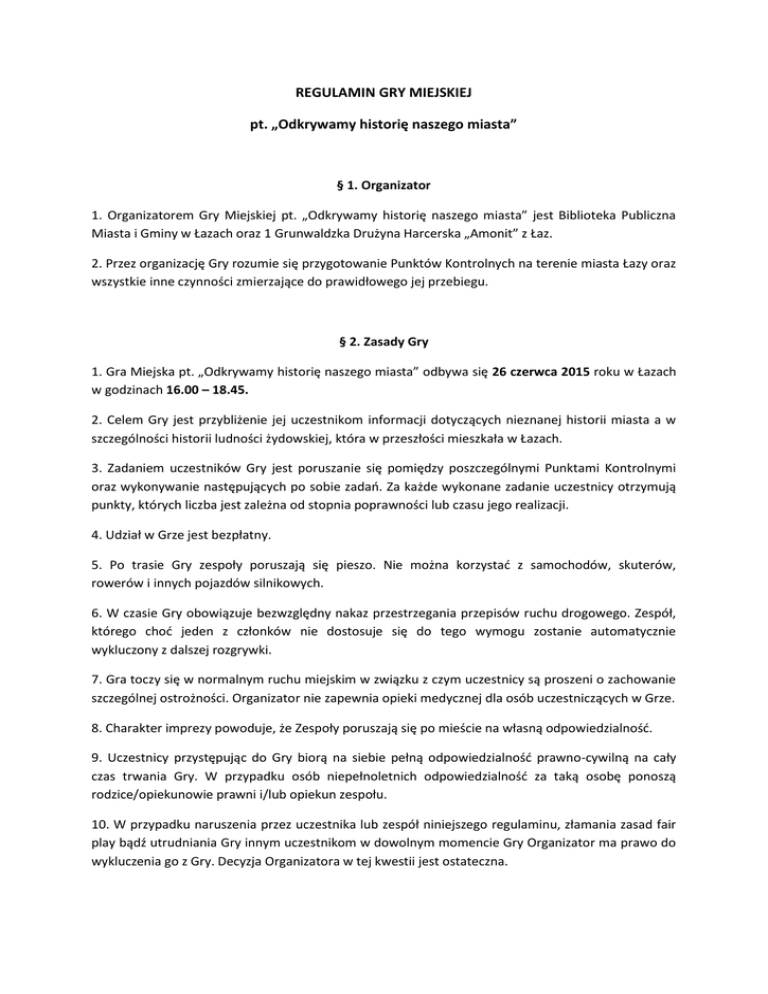 REGULAMIN GRY MIEJSKIEJ pt. „Odkrywamy historię naszego miasta” § 1. Organizator 1. Organizatorem Gry Miejskiej pt. „Odkrywamy historię naszego miasta” jest Biblioteka Publiczna Miasta i Gminy w Łazach oraz 1 Grunwaldzka Drużyna Harcerska „Amonit” z Łaz. 2. Przez organizację Gry rozumie się przygotowanie Punktów Kontrolnych na terenie miasta Łazy oraz wszystkie inne czynności zmierzające do prawidłowego jej przebiegu. § 2. Zasady Gry 1. Gra Miejska pt. „Odkrywamy historię naszego miasta” odbywa się 26 czerwca 2015 roku w Łazach w godzinach 16.00 – 18.45. 2. Celem Gry jest przybliżenie jej uczestnikom informacji dotyczących nieznanej historii miasta a w szczególności historii ludności żydowskiej, która w przeszłości mieszkała w Łazach. 3. Zadaniem uczestników Gry jest poruszanie się pomiędzy poszczególnymi Punktami Kontrolnymi oraz wykonywanie następujących po sobie zadań. Za każde wykonane zadanie uczestnicy otrzymują punkty, których liczba jest zależna od stopnia poprawności lub czasu jego realizacji. 4. Udział w Grze jest bezpłatny. 5. Po trasie Gry zespoły poruszają się pieszo. Nie można korzystać z samochodów, skuterów, rowerów i innych pojazdów silnikowych. 6. W czasie Gry obowiązuje bezwzględny nakaz przestrzegania przepisów ruchu drogowego. Zespół, którego choć jeden z członków nie dostosuje się do tego wymogu zostanie automatycznie wykluczony z dalszej rozgrywki. 7. Gra toczy się w normalnym ruchu miejskim w związku z czym uczestnicy są proszeni o zachowanie szczególnej ostrożności. Organizator nie zapewnia opieki medycznej dla osób uczestniczących w Grze. 8. Charakter imprezy powoduje, że Zespoły poruszają się po mieście na własną odpowiedzialność. 9. Uczestnicy przystępując do Gry biorą na siebie pełną odpowiedzialność prawno-cywilną na cały czas trwania Gry. W przypadku osób niepełnoletnich odpowiedzialność za taką osobę ponoszą rodzice/opiekunowie prawni i/lub opiekun zespołu. 10. W przypadku naruszenia przez uczestnika lub zespół niniejszego regulaminu, złamania zasad fair play bądź utrudniania Gry innym uczestnikom w dowolnym momencie Gry Organizator ma prawo do wykluczenia go z Gry. Decyzja Organizatora w tej kwestii jest ostateczna. 11. Organizator może nie wyrazić zgody na start uczestnika w Grze jeśli stwierdzi, iż ten jest pod wpływem alkoholu lub innych środków odurzających. 12. Organizator nie ponosi odpowiedzialności za zachowania uczestników Gry mogące naruszyć porządek publiczny lub dobra osobiste osób trzecich. 13. Organizator nie jest stroną między uczestnikami, a osobami trzecimi, których dobra mogą być naruszone w czasie Gry. § 3. Uczestnicy Gry i Zgłoszenia 1. Warunkiem uczestnictwa w Grze jest zgłoszenie oraz rejestracja Zespołu liczącego od 3 do 7 osób. 2. Zgłoszenia dokonać można osobiście w Bibliotece Publicznej Miasta i Gminy Łazy lub drogą mailową na adres [email protected] do dnia 18.06.2015r. 3. W dniu Gry (26.06) do godz. 15:45 należy potwierdzić udział w Grze w punkcie startowym znajdującym się przy budynku Biblioteki Publicznej Miasta i Gminy Łazy. 4. W dniu Gry o godz. 15:45 odbędzie się odprawa uczestników (tj. wyjaśnienie zasad gry, sposobu oceniania, itp.) 5. Członkiem każdego z Zespołów musi być przynajmniej jedna osoba pełnoletnia. Osoby niepełnoletnie mogą brać udział w Grze tylko pod opieką osób dorosłych. Jeśli opiekunem osób niepełnoletnich nie jest ich rodzic lub prawny opiekun muszą one posiadać pisemną zgodę rodziców/prawnych opiekunów na udział w Grze. Odpowiednią zgodę należy dostarczyć wraz ze zgłoszeniem lub w dzień Gry. 6. Każda z osób biorących udział w Grze powinna być w dobrym stanie zdrowia, umożliwiającym udział w Grze. 7. Poprzez rejestrację i udział w Grze uczestnik wyraża zgodę na: - wzięcie udziału w Grze na warunkach określonych w niniejszym regulaminie; - przetwarzanie przez Organizatora danych osobowych uczestników w zakresie niezbędnym dla przeprowadzenia Gry (zgodnie z ustawą o ochronie danych osobowych z dnia 29.09.1997 roku Dz. U. Nr 133 poz. 883); - opublikowanie przez Organizatora na łamach stron internetowych, portali społecznościowych oraz w informacjach medialnych wizerunku uczestnika, oraz w uzasadnionym przypadku, imienia i nazwiska uczestnika. 8. W trakcie Gry członkowie poszczególnych Zespołów nie mogą się rozdzielać. Liczba członków Zespołu będzie weryfikowana w poszczególnych Punktach Kontrolnych. W razie niezgodności Zespół będzie mógł przystąpić do realizacji danego zdania dopiero wtedy, kiedy wszyscy jego członkowie znajdą się w Punkcie Kontrolnym. § 4. Zwycięzcy Gry 1. Zwycięzcy Gry zostaną wyłonieni po jej zakończeniu około godziny 19.00. Zespoły, które do tego czasu nie zakończą Gry, nie będą brane pod uwagę w procesie wyłaniania zwycięzców. Wyłonienie zwycięzców nastąpi w ostatnim Punkcie Kontrolnym oznaczony jako „Meta”. 2. Zwycięzcy Gry zostaną wyłonieni po podliczeniu wszystkich punktów, które otrzymali oni wykonując zadania w poszczególnych Punktach Kontrolnych. Zwycięzcą Gry zostanie Zespół, który łącznie otrzyma największą liczbę punktów. W przypadku, gdy dwa lub więcej Zespołów otrzyma równą liczbę punktów przystąpią one do dodatkowego zadania rozstrzygającego, które w ostateczny sposób wyłoni zwycięzców. § 5. Postanowienia końcowe 1. Regulamin znajduje się do wglądu na stronie internetowej Organizatora. 2. W kwestiach dotyczących przebiegu Gry, nieprzewidzianych niniejszym regulaminem, głos rozstrzygający należy do Organizatora. 3. Organizator zastrzega sobie prawo przesunięcia, przedłużenia lub przerwania Gry z ważnych przyczyn. 4. Organizator zastrzega sobie prawo wprowadzania zmian w regulaminie.