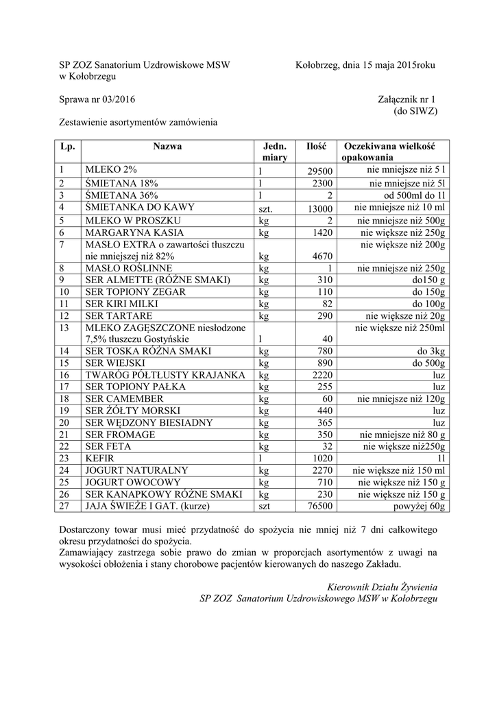 Kołobrzeg, dnia 15 maja 2015roku SP ZOZ Sanatorium Uzdrowiskowe MSW w Kołobrzegu Załącznik nr 1 (do SIWZ) Sprawa nr 03/2016 Zestawienie asortymentów zamówienia Lp. 1 2 3 4 5 6 7 8 9 10 11 12 13 14 15 16 17 18 19 20 21 22 23 24 25 26 27 Nazwa Jedn. miary MLEKO 2% ŚMIETANA 18% ŚMIETANA 36% ŚMIETANKA DO KAWY MLEKO W PROSZKU MARGARYNA KASIA MASŁO EXTRA o zawartości tłuszczu nie mniejszej niż 82% MASŁO ROŚLINNE SER ALMETTE (RÓŻNE SMAKI) SER TOPIONY ZEGAR SER KIRI MILKI SER TARTARE MLEKO ZAGĘSZCZONE niesłodzone 7,5% tłuszczu Gostyńskie SER TOSKA RÓŻNA SMAKI SER WIEJSKI TWARÓG PÓŁTŁUSTY KRAJANKA SER TOPIONY PAŁKA SER CAMEMBER SER ŻÓŁTY MORSKI SER WĘDZONY BIESIADNY SER FROMAGE SER FETA KEFIR JOGURT NATURALNY JOGURT OWOCOWY SER KANAPKOWY RÓŻNE SMAKI JAJA ŚWIEŻE I GAT. (kurze) Ilość l l l szt. kg kg 29500 2300 2 13000 2 1420 kg kg kg kg kg kg 4670 1 310 110 82 290 l kg kg kg kg kg kg kg kg kg l kg kg kg szt 40 780 890 2220 255 60 440 365 350 32 1020 2270 710 230 76500 Oczekiwana wielkość opakowania nie mniejsze niż 5 l nie mniejsze niż 5l od 500ml do 1l nie mniejsze niż 10 ml nie mniejsze niż 500g nie większe niż 250g nie większe niż 200g nie mniejsze niż 250g do150 g do 150g do 100g nie większe niż 20g nie większe niż 250ml do 3kg do 500g luz luz nie mniejsze niż 120g luz luz nie mniejsze niż 80 g nie większe niż250g 1l nie większe niż 150 ml nie większe niż 150 g nie większe niż 150 g powyżej 60g Dostarczony towar musi mieć przydatność do spożycia nie mniej niż 7 dni całkowitego okresu przydatności do spożycia. Zamawiający zastrzega sobie prawo do zmian w proporcjach asortymentów z uwagi na wysokości obłożenia i stany chorobowe pacjentów kierowanych do naszego Zakładu. Kierownik Działu Żywienia SP ZOZ Sanatorium Uzdrowiskowego MSW w Kołobrzegu