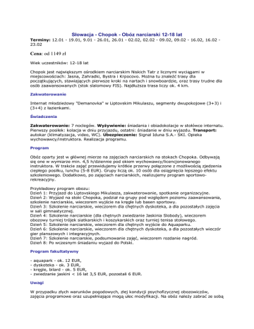 Słowacja - Chopok - Obóz narciarski 12-18 lat Terminy: 12.01 - 19.01, 9.01 - 26.01, 26.01 - 02.02, 02.02 - 09.02, 09.02 - 16.02, 16.02 23.02 Cena: od 1149 zł Wiek uczestników: 12-18 lat Chopok jest największym ośrodkiem narciarskim Niskich Tatr z licznymi wyciągami w miejscowościach: Jasna, Zahradki, Bystra i Krpocovo. Można tu znaleźć trasy dla początkujących, stawiających pierwsze kroki na nartach i snowboardzie, oraz trasy trudne dla osób zaawansowanych (stok slalomowy FIS). Najdłuższa trasa liczy ok. 4 km. Zakwaterowanie Internat młodzieżowy "Demanovka" w Liptovskim Mikulaszu, segmenty dwupokojowe (3+3) i (3+4) z łazienkami. Świadczenia Zakwaterowanie: 7 noclegów. Wyżywienie: śniadania i obiadokolacje w stołówce internatu. Pierwszy posiłek: kolacja w dniu przyjazdu, ostatni: śniadanie w dniu wyjazdu. Transport: autokar (klimatyzacja, video, WC). Ubezpieczenie: Signal Iduna S.A.- SKI. Opieka wychowawcy/instruktora. Realizacja programu. Program Obóz oparty jest w głównej mierze na zajęciach narciarskich na stokach Chopoka. Odbywają się one w wymiarze min. 4,5 h/dziennie pod okiem wychowawcy/licencjonowanego instruktora. W trakcie zajęć przewidujemy krótkie przerwy połączone z możliwością zjedzenia ciepłego posiłku, lunchu (5-8 EUR). Grupy liczą ok. 10 osób dla osiągnięcia lepszego efektu szkoleniowego. Dodatkowo, po zajęciach narciarskich, realizujemy program sportoworekreacyjny. Przykładowy program obozu: Dzień 1: Przyjazd do Liptovskiego Mikulasza, zakwaterowanie, spotkanie organizacyjne. Dzień 2: Wyjazd na stoki Chopoka, podział na grupy pod względem poziomu zaawansowania, szkolenie narciarskie, wieczorem wyjście na kręgle lub basen sportowy. Dzień 3: Szkolenie narciarskie, wieczorem dla chętnych dyskoteka, a dla pozostałych zajęcia w sali gimnastycznej. Dzień 4: Szkolenie narciarskie (dla chętnych zwiedzanie Jaskinia Slobody), wieczorem obozowy turniej trójek siatkarskich i koszykarskich oraz turniej tenisa stołowego. Dzień 5: Szkolenie narciarskie, wieczorem dla chętnych wyjście do Aquaparku. Dzień 6: Szkolenie narciarskie, wieczorem dla chętnych dyskoteka, a dla pozostałych wieczór gier planszowych i integracyjnych. Dzień 7: Szkolenie narciarskie, podsumowanie zajęć, wieczorem rozdanie nagród. Dzień 8: Po wczesnym śniadaniu wyjazd do Polski. Program fakultatywny - aquapark - ok. 12 EUR, dyskoteka - ok. 3 EUR, kręgle, bilard - ok. 5 EUR, zwiedzanie jaskini < 16 lat 3,5 EUR, pozostali 6 EUR. Uwagi W przypadku złych warunków pogodowych, złej kondycji psychofizycznej obozowiczów, zajęcia programowe oraz uzupełniające mogą ulec modyfikacji. Na obóz należy zabrać ze sobą paszport/dowód osobisty, strój kąpielowy, kaski ochronne, które są obowiązkowe poniżej 18 roku życia. Cena nie obejmuje dopłaty za transport z miast wyszczególnionych w planie podróży. Informacje praktyczne Ceny karnetów: 90 EUR. Wypożyczenie sprzętu narciarskiego: ok. 80 EUR/turnus. Przy zakwaterowaniu pobierana jest kaucja 15 EUR zwracana w dniu wyjazdu, o ile nie zostały wyrządzone żadne szkody.