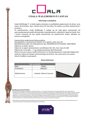 COALA WALLDESIGN P CANVAS Informacje o produkcie Coala WallDesign P to biała tapeta winylowa na podkładzie papierowym do druku przy użyciu atramentów typu: solvent (eco) UV lub Latex. Do wyboru są różne wykończenia i struktury. Po zadrukowaniu, Coala WallDesign P nadaje się do całej gamy zastosowań, od spersonalizowanych grafik dla klientów indywidualnych, ozdobnych tapet do hoteli, biur i innych instytucji (w tym opieki zdrowotnej), po wykończenia wnętrz sklepów czy twórcze scenografie. Powierzchnia wykończona fakturą płótna Kompatybilne z atramentami Solvent, Eco-solvent, Latex oraz UV Sklasyfikowane jako nie niebezpieczne wg DIN52900 lub 91/155/EEG, 2001/58/EC Odporne na pleśń i gnicie Odporne na ogień: potwierdzone certyfikatami B1, M1, Euro class B s1d0 Odporność na światło > 7 wg międzynarodowej skali Woolscale Można myć przy użyciu mydła (testowane na niezadrukowanym materiale) Odporność wydruku zależy od rodzaju zastosowanego atramentu. Do czyszczenia nie używać silnych środków czyszczących. Dane techniczne Opis produktu Baza Gramatura Wykończenie Papier 300 g/m² matowe, faktura Canvasu Karta Bezpieczeństwa Produktu: Jeśli produkt jest użytkowany zgodnie z przeznaczeniem i w normalnych warunkach, nie uwalnia niebezpiecznych substancji czy szkodliwych chemikaliów. Ten produkt określony jest zgodnie z aktualnymi kryteriami UE i GefStoffV jako nie stwarzający zagrożeń, dlatego nie jest konieczne przygotowanie dla niego Karty Bezpieczeństwa Produktu. Karta Bezpieczeństwa Produktu służy jedynie podkreśleniu zgodności z wymienionymi kryteriami. Informacje wynikające z dyrektywy REACH (EC) Nr 1907/2006 są dostępne na Państwa żądanie. Produkt powyższy nie jest określany jako niebezpieczny również w rozumieniu przepisów transportowych, w tym dotyczących skażenia wód. Po zakończeniu użytkowania należy produkt zutylizować z zgodzie z aktualnymi przepisami. Antalis dołożył wszelkich starań by przekazane w powyższej karcie informacje były poprawne, jednak nie ponosi odpowiedzialności za ewentualne szkody wynikłe z jakichkolwiek błędów lub nieścisłości. Warunki magazynowania Przechowywać w zamkniętych, oryginalnych opakowaniach w chłodnym I suchym miejscu, w temperaturze 10-25°C przy wilgotności względnej 50%. Czas przydatności do użycia wynosi jeden rok, jeśli produkt jest przechowywany w oryginalnym opakowaniu, w zalecanych warunkach. Przyklejanie Zalecane kleje do ciężkich tapet winylowych. Standardowe wymiary 1372 mm x 30 m Karta Bezpieczeństwa Produktu: Jeśli produkt jest użytkowany zgodnie z przeznaczeniem i w normalnych warunkach, nie uwalnia niebezpiecznych substancji czy szkodliwych chemikaliów. Ten produkt określony jest zgodnie z aktualnymi kryteriami UE i GefStoffV jako nie stwarzający zagrożeń, dlatego nie jest konieczne przygotowanie dla niego Karty Bezpieczeństwa Produktu. Karta Bezpieczeństwa Produktu służy jedynie podkreśleniu zgodności z wymienionymi kryteriami. Informacje wynikające z dyrektywy REACH (EC) Nr 1907/2006 są dostępne na Państwa żądanie. Produkt powyższy nie jest określany jako niebezpieczny również w rozumieniu przepisów transportowych, w tym dotyczących skażenia wód. Po zakończeniu użytkowania należy produkt zutylizować z zgodzie z aktualnymi przepisami. Antalis dołożył wszelkich starań by przekazane w powyższej karcie informacje były poprawne, jednak nie ponosi odpowiedzialności za ewentualne szkody wynikłe z jakichkolwiek błędów lub nieścisłości. Instrukcja klejenia tapet COALA WALLDESIGN P z podkładem papierowym: Przygotowanie podłoża: Powierzchnia do aplikacji produktu powinna być sucha, gładka, zwarta, nienasiąkliwa i zagruntowana klejem do tapet lub innym specjalnym preparatem do gruntowania. Podłoże pod jasne tapety powinno być białe lub w jednorodnym bardzo jasnym kolorze. W przypadku tapetowania świeżo malowanych ścian należy poczekać do całkowitego wyschnięcia i utwardzenia się powłoki malarskiej. W celu prawidłowego przygotowania podłoża należy usunąć wszelkie zanieczyszczenia lub pozostałości poprzedniej tapety, a ewentualne nierówności należy uzupełnić odpowiednią masą. Podłoże pomalowane farbą klejową powinno być dokładnie zmyte lub zdrapane. Pozostawienie farb klejowych na ścianie może spowodować odklejanie lub odbarwianie tapet. W przypadku układania tapet na farby olejowe zalecane jest przeszlifowanie powłoki papierem ściernym. Podłoża z farb emulsyjnych należy jedynie umyć, miejsca uszkodzone lub o słabej przyczepności zeskrobać, a powstałe nierówności wyrównać gładzią szpachlową lub gipsem. Upewnij się, że ściana jest gładka, równa, sucha i wolna od pleśni. Tapetowanie można rozpocząć po wyschnięciu gruntu na ścianie. Karta Bezpieczeństwa Produktu: Jeśli produkt jest użytkowany zgodnie z przeznaczeniem i w normalnych warunkach, nie uwalnia niebezpiecznych substancji czy szkodliwych chemikaliów. Ten produkt określony jest zgodnie z aktualnymi kryteriami UE i GefStoffV jako nie stwarzający zagrożeń, dlatego nie jest konieczne przygotowanie dla niego Karty Bezpieczeństwa Produktu. Karta Bezpieczeństwa Produktu służy jedynie podkreśleniu zgodności z wymienionymi kryteriami. Informacje wynikające z dyrektywy REACH (EC) Nr 1907/2006 są dostępne na Państwa żądanie. Produkt powyższy nie jest określany jako niebezpieczny również w rozumieniu przepisów transportowych, w tym dotyczących skażenia wód. Po zakończeniu użytkowania należy produkt zutylizować z zgodzie z aktualnymi przepisami. Antalis dołożył wszelkich starań by przekazane w powyższej karcie informacje były poprawne, jednak nie ponosi odpowiedzialności za ewentualne szkody wynikłe z jakichkolwiek błędów lub nieścisłości. Naklejanie: Optymalna temperatura w tapetowanym pomieszczeniu to 18-21oC. Nie należy tapetować w temperaturze pon