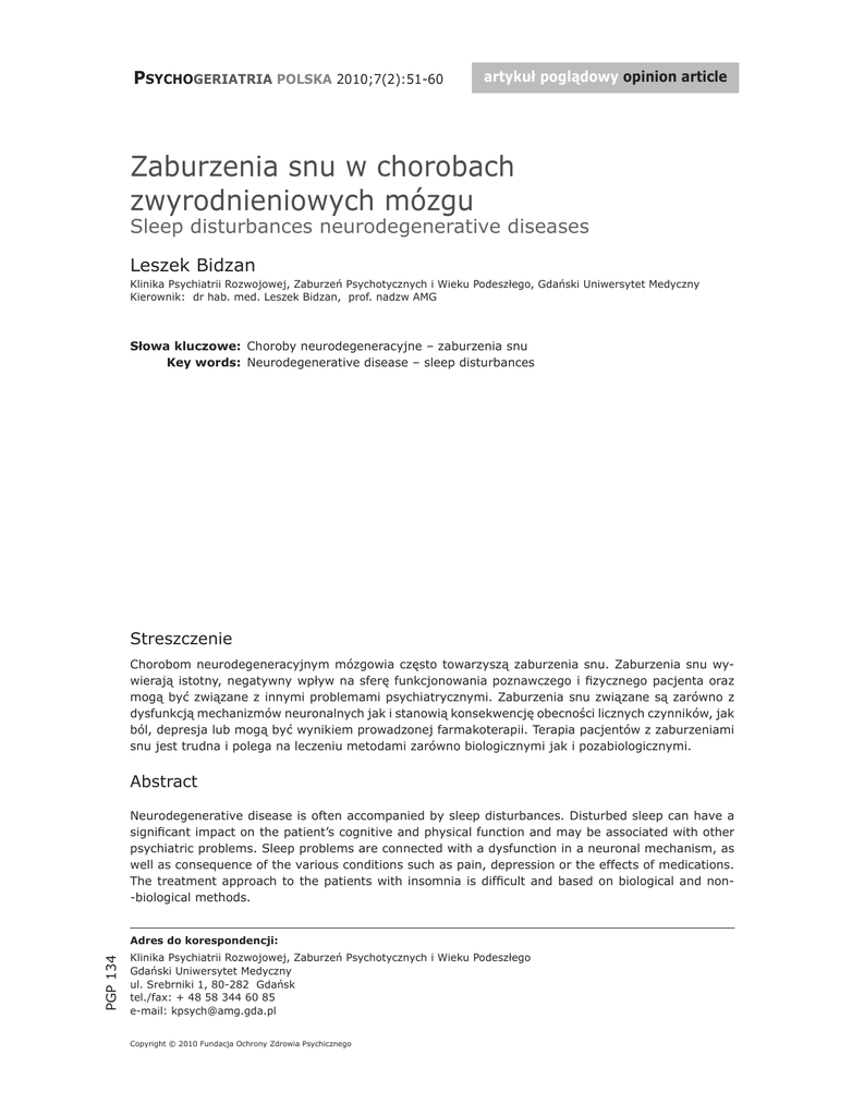 PSYCHOGERIATRIA POLSKA 2010;7(2):51-60 artykuł poglądowy opinion article Zaburzenia snu w chorobach zwyrodnieniowych mózgu Sleep disturbances neurodegenerative diseases Leszek Bidzan Klinika Psychiatrii Rozwojowej, Zaburzeń Psychotycznych i Wieku Podeszłego, Gdański Uniwersytet Medyczny Kierownik: dr hab. med. Leszek Bidzan, prof. nadzw AMG Słowa kluczowe: Choroby neurodegeneracyjne – zaburzenia snu Key words: Neurodegenerative disease – sleep disturbances Streszczenie Chorobom neurodegeneracyjnym mózgowia często towarzyszą zaburzenia snu. Zaburzenia snu wywierają istotny, negatywny wpływ na sferę funkcjonowania poznawczego i fizycznego pacjenta oraz mogą być związane z innymi problemami psychiatrycznymi. Zaburzenia snu związane są zarówno z dysfunkcją mechanizmów neuronalnych jak i stanowią konsekwencję obecności licznych czynników, jak ból, depresja lub mogą być wynikiem prowadzonej farmakoterapii. Terapia pacjentów z zaburzeniami snu jest trudna i polega na leczeniu metodami zarówno biologicznymi jak i pozabiologicznymi. Abstract Neurodegenerative disease is often accompanied by sleep disturbances. Disturbed sleep can have a significant impact on the patient’s cognitive and physical function and may be associated with other psychiatric problems. Sleep problems are connected with a dysfunction in a neuronal mechanism, as well as consequence of the various conditions such as pain, depression or the effects of medications. The treatment approach to the patients with insomnia is difficult and based on biological and non-biological methods. PGP 134 Adres do korespondencji: Klinika Psychiatrii Rozwojowej, Zaburzeń Psychotycznych i Wieku Podeszłego Gdański Uniwersytet Medyczny ul. Srebrniki 1, 80-282 Gdańsk tel./fax: + 48 58 344 60 85 e-mail: [email protected] Copyright © 2010 Fundacja Ochrony Zdrowia Psychicznego 52 Leszek Bidzan: Zaburzenia snu w chorobach neurozwyrodnieniowych Wprowadzenie Zaburzenia snu występują powszechnie w populacji. Jednak ich częstość wyraźnie wzrasta w stanach prowadzących do uszkodzenia mózgowia, w tym zwłaszcza w chorobach zwyrodnieniowych mózgu. Szereg stanów takich jak choroba Alzheimera, Parkinsona, zwyrodnienie czołowo – skroniowe, choroba rozsianych ciał Lewy’ego, zaburzenia krążenia mózgowego i szereg innych prowadzących w różnym etapie swojego przebiegu do destrukcji tkanki mózgowej związane są z częstszymi zaburzeniami snu. Zaburzenia snu w tych stanach mogą przybierać różną formę, a ich nasilenie jak i rodzaj niejednokrotnie zmienia się w trakcie ewolucji procesu. Przyczynę częstszego występowania zaburzeń snu w zwyrodnieniach mózgu należy upatrywać w głównej mierze w zmianach strukturalno – czynnościowych w oczywisty sposób towarzyszących tym chorobom. Jednak patogeneza zaburzeń snu zwykle jest bardzo złożona. Do rzadkości należą stany, w których w sposób jednoznaczny można wskazać na bezpośredni związek z morfologią zmian mózgowych. Prawie zawsze niezbędne jest uwzględnienie wpływu szeregu czynników. Schorzenia współwystępujące i związane z nimi objawy, np. ból, stosowane leki, zmiany w funkcjonowaniu społecznym, odmienna odpowiedź na czynniki stresogenne i szereg innych czynników muszą być uwzględnione przy ocenie klinicznej. Choroby zwyrodnieniowe mózgu dotyczą najczęściej osób w wieku podeszłym, a pamiętać należy, że sam wiek podeszły sprzyja pojawianiu się zaburzeń snu. Aczkolwiek dane w tym zakresie nie są jednoznaczne, to można przyjąć, że w okresie starzenia się dochodzi do niewielkiej, w porównaniu z osobami młodymi redukcji w zakresie fazy REM snu i fal wolnych okresu NREM. Przy porównaniu osób starszych w różnych okresach wiekowych (tzw. starzy młodzi i starzy starzy ) wyciągnięto następujące wnioski: niewielka redukcja postępująca wraz z wiekiem wolnych fal snu, przy braku takich zmian w odniesieniu do faz REM, mniejsze zmiany w zakresie fal wolnych wśród kobiet niż mężczyzn szczególnie w pierwszym okresie fazy NREM, przy braku wpływu płci na sen REM, lepsze utrzymywanie snu (mniej przerw śródnocnych) wśród mężczyzn niż u kobiet oraz dłuższa latencja snu REM u starszych kobiet niż u mężczyzn [1] Niewątpliwie za zmiany w zakresie snu pojawiające się w okresie starzenia się odpowiada szereg procesów typowych dla starości, w tym stopniowe, ale niekoniecznie znaczne upośledzenie funkcjonowania ośrodków regulacji snu. Do kluczowych mechanizmów regulacji snu należy wydzielanie melatoniny pod wpływem światła. Światło jest głównym czynnikiem zewnętrznym regulującym wydzielanie melatoniny przez szyszynkę. Jednak światło nie pobudza bezpośrednio szyszynki, tylko po aktywacji receptorów siatkówki powoduje aktywację szlaku biegnącego z siatkówki do przedniego podwzgórza, gdzie zlokalizowane jest jądro nadskrzyżowaniowe uważane za główny regulator rytmu u ssaków, regulujący również szereg innych funkcji cyklicznych [2, 3]. Jądro nadskrzyżowaniowe komunikuje się z szyszynką poprzez jądro grzbietowoprzyśrodkowe podwzgórza. Aktywność wymienionych szlaków wywołana percepcją światła powoduje hamowanie wydzielania melatoniny. Nie samo jednak bezpośrednie działanie światła prowokuje aktywność wymienionych szlaków. Jądro nadskrzyżowaniowe wprawdzie podlega modyfikującemu wpływowi aktualnego naświetlenia, ale posiada też własną aktywność, która ujawni się na przykład przy zmianie naświetlenia wywołanego zmianą długości geograficznej. W prawidłowo funkcjonującym organizmie istnieje zdolność do adaptacji w warunkach zmiany oświetlenia, która jednak w miarę starzenia się ulega zmniejszeniu. Gruczoł szyszynki ulega bowiem w starości pewnym zmianom zmniejszającym jego możliwości adaptacyjne. Obserwowano jego zwapnienie [4]. Proces ten czasami wiąże się z obserwowaną w starości istotną redukcją poziomu m