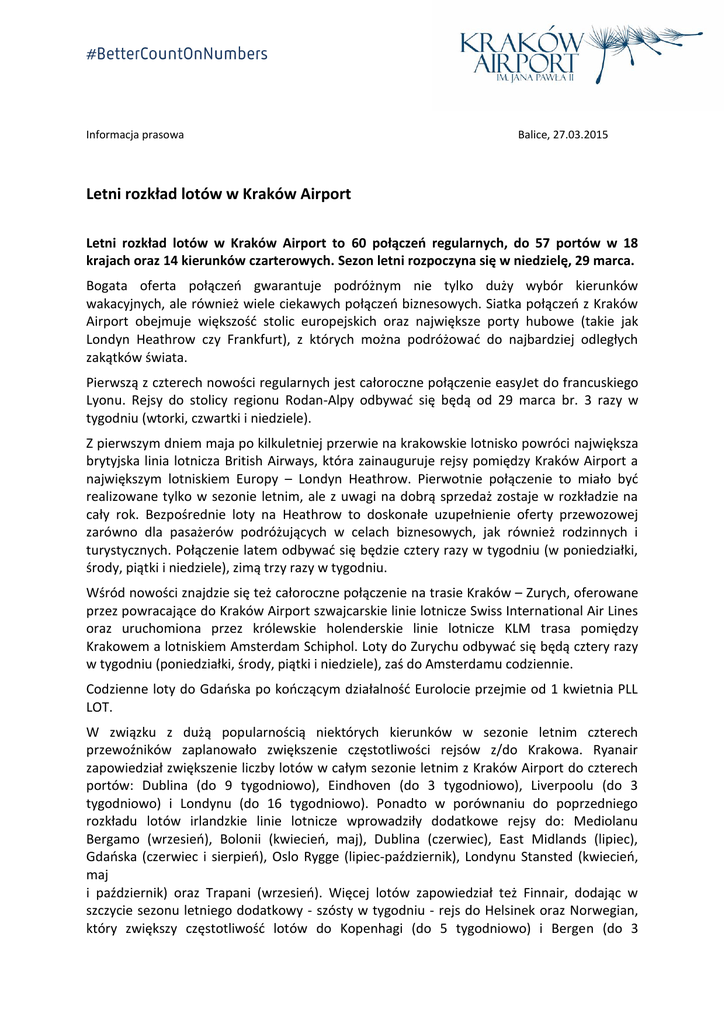 Informacja prasowa Balice, 27.03.2015 Letni rozkład lotów w Kraków Airport Letni rozkład lotów w Kraków Airport to 60 połączeń regularnych, do 57 portów w 18 krajach oraz 14 kierunków czarterowych. Sezon letni rozpoczyna się w niedzielę, 29 marca. Bogata oferta połączeń gwarantuje podróżnym nie tylko duży wybór kierunków wakacyjnych, ale również wiele ciekawych połączeń biznesowych. Siatka połączeń z Kraków Airport obejmuje większość stolic europejskich oraz największe porty hubowe (takie jak Londyn Heathrow czy Frankfurt), z których można podróżować do najbardziej odległych zakątków świata. Pierwszą z czterech nowości regularnych jest całoroczne połączenie easyJet do francuskiego Lyonu. Rejsy do stolicy regionu Rodan-Alpy odbywać się będą od 29 marca br. 3 razy w tygodniu (wtorki, czwartki i niedziele). Z pierwszym dniem maja po kilkuletniej przerwie na krakowskie lotnisko powróci największa brytyjska linia lotnicza British Airways, która zainauguruje rejsy pomiędzy Kraków Airport a największym lotniskiem Europy – Londyn Heathrow. Pierwotnie połączenie to miało być realizowane tylko w sezonie letnim, ale z uwagi na dobrą sprzedaż zostaje w rozkładzie na cały rok. Bezpośrednie loty na Heathrow to doskonałe uzupełnienie oferty przewozowej zarówno dla pasażerów podróżujących w celach biznesowych, jak również rodzinnych i turystycznych. Połączenie latem odbywać się będzie cztery razy w tygodniu (w poniedziałki, środy, piątki i niedziele), zimą trzy razy w tygodniu. Wśród nowości znajdzie się też całoroczne połączenie na trasie Kraków – Zurych, oferowane przez powracające do Kraków Airport szwajcarskie linie lotnicze Swiss International Air Lines oraz uruchomiona przez królewskie holenderskie linie lotnicze KLM trasa pomiędzy Krakowem a lotniskiem Amsterdam Schiphol. Loty do Zurychu odbywać się będą cztery razy w tygodniu (poniedziałki, środy, piątki i niedziele), zaś do Amsterdamu codziennie. Codzienne loty do Gdańska po kończącym działalność Eurolocie przejmie od 1 kwietnia PLL LOT. W związku z dużą popularnością niektórych kierunków w sezonie letnim czterech przewoźników zaplanowało zwiększenie częstotliwości rejsów z/do Krakowa. Ryanair zapowiedział zwiększenie liczby lotów w całym sezonie letnim z Kraków Airport do czterech portów: Dublina (do 9 tygodniowo), Eindhoven (do 3 tygodniowo), Liverpoolu (do 3 tygodniowo) i Londynu (do 16 tygodniowo). Ponadto w porównaniu do poprzedniego rozkładu lotów irlandzkie linie lotnicze wprowadziły dodatkowe rejsy do: Mediolanu Bergamo (wrzesień), Bolonii (kwiecień, maj), Dublina (czerwiec), East Midlands (lipiec), Gdańska (czerwiec i sierpień), Oslo Rygge (lipiec-październik), Londynu Stansted (kwiecień, maj i październik) oraz Trapani (wrzesień). Więcej lotów zapowiedział też Finnair, dodając w szczycie sezonu letniego dodatkowy - szósty w tygodniu - rejs do Helsinek oraz Norwegian, który zwiększy częstotliwość lotów do Kopenhagi (do 5 tygodniowo) i Bergen (do 3 tygodniowo). Dodatkową, czwartą rotację dziennie, w szczycie sezonu letniego zapowiedziała także niemiecka linia airberlin, która lata z Krakowa na lotnisko Berlin Tegel. W sezonie letnim powrócą do Kraków Airport, zawieszone w rozkładzie zimowym, typowe połączenia sezonowe: Barcelona El Prat (Vueling); Barcelona Girona, Cagliari, Kos, Majorka, Malaga, Pafos, Piza, Trapani (Ryanair); Helsinki (Finnair); Stuttgart (Germanwings). Wśród czarterów nowość to Comiso na Sycylii. Dodatkowe informacje: Urszula Podraza Kraków Airport Rzecznik prasowy/Kierownik Działu PR Tel. +48 664 404 486, 12 639 33 03 [email protected]
