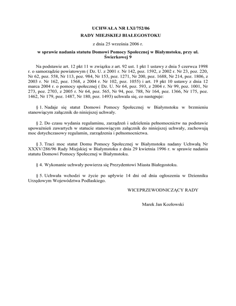 UCHWAŁA NR LXI/752/06 RADY MIEJSKIEJ BIAŁEGOSTOKU z dnia 25 września 2006 r. w sprawie nadania statutu Domowi Pomocy Społecznej w Białymstoku, przy ul. Świerkowej 9 Na podstawie art. 12 pkt 11 w związku z art. 92 ust. 1 pkt 1 ustawy z dnia 5 czerwca 1998 r. o samorządzie powiatowym ( Dz. U. z 2001 r. Nr 142, poz. 1592, z 2002 r. Nr 23, poz. 220, Nr 62, poz. 558, Nr 113, poz. 984, Nr 153, poz. 1271, Nr 200, poz. 1688, Nr 214, poz. 1806, z 2003 r. Nr 162, poz. 1568, z 2004 r. Nr 102, poz. 1055) i art. 19 pkt 10 ustawy z dnia 12 marca 2004 r. o pomocy społecznej ( Dz. U. Nr 64, poz. 593, z 2004 r. Nr 99, poz. 1001, Nr 273, poz. 2703, z 2005 r. Nr 64, poz. 565, Nr 94, poz. 788, Nr 164, poz. 1366, Nr 175, poz. 1462, Nr 179, poz. 1487, Nr 180, poz. 1493) uchwala się, co następuje: § 1. Nadaje się statut Domowi Pomocy Społecznej w Białymstoku w brzmieniu stanowiącym załącznik do niniejszej uchwały. § 2. Do czasu wydania regulaminu, zarządzeń i udzielenia pełnomocnictw na podstawie upoważnień zawartych w statucie stanowiącym załącznik do niniejszej uchwały, zachowują moc dotychczasowy regulamin, zarządzenia i pełnomocnictwa. § 3. Traci moc statut Domu Pomocy Społecznej w Białymstoku nadany Uchwałą Nr XXXV/286/96 Rady Miejskiej w Białymstoku z dnia 29 kwietnia 1996 r. w sprawie nadania statutu Domowi Pomocy Społecznej w Białymstoku. § 4. Wykonanie uchwały powierza się Prezydentowi Miasta Białegostoku. § 5. Uchwała wchodzi w życie po upływie 14 dni od dnia ogłoszenia w Dzienniku Urzędowym Województwa Podlaskiego. WICEPRZEWODNICZĄCY RADY Marek Jan Kozłowski Załącznik do uchwały Nr LXI/752/06 Rady Miejskiej Białegostoku z dnia 25 września 2006 r. STATUT DOMU POMOCY SPOŁECZNEJ W BIAŁYMSTOKU § 1. Dom Pomocy Społecznej z siedzibą przy ul. Świerkowej 9 w Białymstoku, zwany dalej „Domem”, jest jednostką organizacyjną Miasta Białegostoku, nie posiadającą osobowości prawnej. § 2. Dom jest przeznaczony dla osób przewlekle somatycznie chorych. § 3. 1. Dom zapewnia osobom niemogącym samodzielnie funkcjonować w codziennym życiu z powodu wieku, choroby lub niepełnosprawności całodobową opiekę na poziomie obowiązującego standardu. 2. Dom może świadczyć usługi opiekuńcze i specjalistyczne usługi opiekuńcze dla osób w nim niezamieszkujacych. § 4. 1. Domem kieruje i reprezentuje go na zewnątrz Dyrektor Domu. 2. Dyrektora Domu powołuje i odwołuje Prezydent Miasta Białegostoku. 3. Dyrektor Domu działa jednoosobowo na podstawie pełnomocnictwa udzielonego przez Prezydenta Miasta Białegostoku. 4. Dyrektor Domu wykonuje czynności z zakresu prawa pracy w stosunku do pracowników zatrudnionych w Domu. 5. W celu realizacji zadań statutowych Domu, Dyrektor Domu jest uprawniony do wydawania zarządzeń, regulaminów i instrukcji. § 5. Strukturę organizacyjną Domu i szczegółowy zakres zadań określa opracowany przez Dyrektora Domu regulamin organizacyjny, przyjęty przez Prezydenta Miasta Białegostoku. § 6. Dom używa na tablicach, wywieszkach, formularzach, pieczęciach itp. nazwy: Dom Pomocy Społecznej w Białymstoku. § 7. 1. Dom jest jednostka budżetową i prowadzi gospodarkę finansową na zasadach określonych przepisami prawa dla tych jednostek. 2. Podstawą gospodarki finansowej Domu jest roczny plan dochodów i wydatków. § 8. Mienie Domu jest mieniem Miasta Białystok. § 9. 1. Nadzór nad działalnością Domu sprawuje Prezydent Miasta Białegostoku przy pomocy Miejskiego Ośrodka Pomocy Rodzinie w Białymstoku. 2. Nadzór nad jakością działalności, jakością świadczonych usług przez Dom zgodnie z obowiązującymi standardami, a także nad zgodnością zatrudnienia pracowników z wymaganymi kwalifikacjami, sprawuje Wojewoda Podlaski. § 10. Zmian w statucie dokonuje się w trybie określonym dla jego nadania. § 11. W sprawach nie uregulowanych w statucie mają zastosowanie odpowiednie postanowienia ustawy z dnia 12 marca 2004 r. o pomocy społecznej ( Dz. U. Nr 64, poz. 593 z późn. zm.) i przepisy wykonawcze do tej ustawy oraz inne obowiązujące akty prawne. § 12. Statut obowiązuje z dniem wejścia w życie uchwały Rady Miejskiej Białegostoku w sprawie nadania statutu Domowi Pomocy Społecznej w Białymstoku.