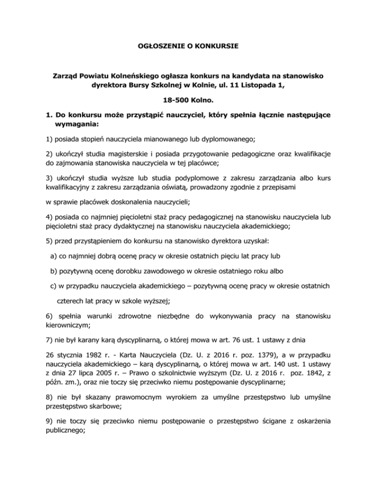 OGŁOSZENIE O KONKURSIE Zarząd Powiatu Kolneńskiego ogłasza konkurs na kandydata na stanowisko dyrektora Bursy Szkolnej w Kolnie, ul. 11 Listopada 1, 18-500 Kolno. 1. Do konkursu może przystąpić nauczyciel, który spełnia łącznie następujące wymagania: 1) posiada stopień nauczyciela mianowanego lub dyplomowanego; 2) ukończył studia magisterskie i posiada przygotowanie pedagogiczne oraz kwalifikacje do zajmowania stanowiska nauczyciela w tej placówce; 3) ukończył studia wyższe lub studia podyplomowe z zakresu zarządzania albo kurs kwalifikacyjny z zakresu zarządzania oświatą, prowadzony zgodnie z przepisami w sprawie placówek doskonalenia nauczycieli; 4) posiada co najmniej pięcioletni staż pracy pedagogicznej na stanowisku nauczyciela lub pięcioletni staż pracy dydaktycznej na stanowisku nauczyciela akademickiego; 5) przed przystąpieniem do konkursu na stanowisko dyrektora uzyskał: a) co najmniej dobrą ocenę pracy w okresie ostatnich pięciu lat pracy lub b) pozytywną ocenę dorobku zawodowego w okresie ostatniego roku albo c) w przypadku nauczyciela akademickiego – pozytywną ocenę pracy w okresie ostatnich czterech lat pracy w szkole wyższej; 6) spełnia warunki zdrowotne niezbędne do wykonywania pracy na stanowisku kierowniczym; 7) nie był karany karą dyscyplinarną, o której mowa w art. 76 ust. 1 ustawy z dnia 26 stycznia 1982 r. - Karta Nauczyciela (Dz. U. z 2016 r. poz. 1379), a w przypadku nauczyciela akademickiego – karą dyscyplinarną, o której mowa w art. 140 ust. 1 ustawy z dnia 27 lipca 2005 r. – Prawo o szkolnictwie wyższym (Dz. U. z 2016 r. poz. 1842, z późn. zm.), oraz nie toczy się przeciwko niemu postępowanie dyscyplinarne; 8) nie był skazany prawomocnym wyrokiem za umyślne przestępstwo lub umyślne przestępstwo skarbowe; 9) nie toczy się przeciwko niemu postępowanie o przestępstwo ścigane z oskarżenia publicznego; 10) nie był karany zakazem pełnienia funkcji związanych z dysponowaniem środkami publicznymi, o którym mowa w art. 31 ust. 1 pkt 4 ustawy z dnia 17 grudnia 2004 r. o odpowiedzialności za naruszenie dyscypliny finansów publicznych (Dz. U. z 2013r. poz. 168, z późn. zm.). 2. Do konkursu może przystąpić również nauczyciel mianowany lub dyplomowany, który ukończył studia pierwszego stopnia lub studia wyższe zawodowe i posiada przygotowanie pedagogiczne lub ukończył kolegium nauczycielskie albo nauczycielskie kolegium języków obcych, posiada kwalifikacje do zajmowania stanowiska nauczyciela w tej placówce i spełnia wymagania określone w ust. 1 pkt 3-10. 3. Do konkursu może przystąpić także nauczyciel mianowany lub dyplomowany, zatrudniony na stanowisku wymagającym kwalifikacji pedagogicznych w urzędzie organu administracji rządowej, kuratorium oświaty, Centrum Edukacji Artystycznej, Centralnej Komisji Egzaminacyjnej i okręgowych komisji egzaminacyjnych, oraz nauczyciel mianowany lub dyplomowany urlopowany lub zwolniony z obowiązku świadczenia pracy na podstawie przepisów ustawy z dnia 23 maja 1991 r. o związkach zawodowych (Dz. U. z 2015 r. poz. 1881), spełniający wymagania określone w ust. 1 pkt 2-10, z wyjątkiem wymogu posiadania co najmniej dobrej oceny pracy albo pozytywnej oceny dorobku zawodowego. 4. Oferty osób przystępujących do konkursu powinny zawierać: 1) uzasadnienie przystąpienia do konkursu oraz koncepcję funkcjonowania i rozwoju publicznej placówki; 2) poświadczoną przez kandydata za zgodność z oryginałem kopię dowodu osobistego lub innego dokumentu potwierdzającego tożsamość oraz poświadczającego obywatelstwo kandydata; 3) życiorys z opisem przebiegu pracy zawodowej, zawierający w szczególności informację o stażu pracy pedagogicznej – w przypadku nauczyciela albo stażu pracy dydaktycznej – w przypadku nauczyciela akademickiego; 4) oryginały lub poświadczone przez kandydata za zgodność z oryginałem kopie dokumentów potwierdzających posiadanie wymaganego stażu pracy, o którym mowa w pkt 3; 5) oryginały lub poświadczone przez kandydata za zgodność z oryginałem kopie dokumentów potwierdzających posiadanie wymaganego wykształcenia, w tym dyplomu ukończenia studiów wyższych lub świadectwa ukończenia studiów podyplomowych z zakresu zarządzania albo świadectwa ukończenia kursu kwalifikacyjnego z zakresu zarządzania oświatą; 6) zaświadczenie lekarskie o braku przeciwwskazań zdrowotnych do wykonywania pracy na stanowisku kierowniczym; 7) oświadczenie, że przeciwko kandydatowi nie toczy się postępowanie o przestępstwo ścigane z oskarżenia publicznego lub postępowanie dyscyplinarne; 8) oświadczenie, że kandydat nie był skazany prawomocnym wyrokiem za umyślne przestępstwo lub umyślne przestępstwo skarbowe; 9) oświadczenie, że kandydat nie był karany zakazem pełnienia funkcji związanych z dysponowaniem środkami publicznymi, o którym mowa w art. 31 ust. 1 pkt 4 ustawy z dnia 17 grudnia 2004 r. o odpowiedzialności za naruszenie dyscypliny finansów publicznych (Dz. U. z 2013 r. poz. 168, z późn. zm); 10) oryginał lub poświadczoną przez kandydata za zgodność z oryginałem kopie aktu nadania stopnia nauczyciela mianowanego lub dyplomowanego – w przypadku nauczyciela; 11) oryginał lub poświadczoną przez kandydata za zgodność z oryginałem kopie karty oceny pracy lub oceny dorobku zawodowego – w przypadku nauczyciela i nauczyciela akademickiego; 12) oświadczenie, że kandydat nie był karany karą dyscyplinarną, o której mowa w art. 76 ust. 1 ustawy z dnia 26 stycznia 1982 r. – Karta Nauczyciela (Dz. U. z 2016 r. poz. 1379) lub w art. 140 ust. 1 ustawy z dnia 27 lipca 2005 r. – Prawo o szkolnictwie wyższym (Dz. U. z 2016 r. poz. 1842, z późn. zm.) – w przypadku nauczyciela i nauczyciela akademickiego; 13) oświadczenie, że kandydat wyraża zgodę na przetwarzanie danych osobowych zgodnie z ustawą z dnia 29 sierpnia 1997 r. o ochronie danych osobowych (Dz. U