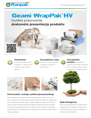The Paper Packaging Experts™ Szybkie pakowanie, doskonała prezentacja produktu Prezentacja Oszczędność czasu Doskonała prezentacja Poprawa czasu owijania Oszczędność kosztów Zmniejszenie produktu w opakowaniu i ogólnej wydajności wykorzystywanego materiału zwiększa zadowolenie pakowania oraz redukcja zajmowanej klienta powierzchni magazynowej Owiń produkt, zyskując perfekcyjną prezentację Geami WrapPak to połączenie opatentowanego ponacinanego papieru kraft wraz z wewnętrzną warstwą bibuły. Konwerter Geami WrapPak HV rozwija papier kraft w trójwymiarowy plaster miodu, oferując wyjątkowy produkt do pakowania. Bądź ekologiczny Łącząc ze sobą komórki ustawione pod kątem, przedmioty są pewnie owinięte Nasza firma współpracuje z certyfikowanymi bez konieczności stosowania taśmy. Konwerter można umieścić przy dowolnej dostawcami FSC. Papier nie ma wpływu na stacji pakowania, w której pakowane są pojedyncze produkty przy użyciu owijania zmiany klimatyczne, podlega recyklingowi i zabezpieczającego. jest zasobem odnawialnym. Specyfikacje systemu Konwerter Ponacinany papier Wkładka papierowa • Wymiary: 71.2x50.8x43.2 cm • Masa podstawy: 80 gr/m² • Masa podstawy: 22 gr/m² • Masa: 31 kg • Kolor: brązowy lub biały • Kolor: biały • Napięcie: 100-240 wolty • Długość rolki: 250 m • Długość rolki: 840 m • Moc: 320 waty • Szerokość papieru: 50.8 cm (20") • Szerokość papieru: 30.5 cm (12") • Prędkość: od 0 do 0.75 m/s • Metoda cięcia: manualna Nasza wartość dodana Technika pakowania Zintegrowane zastosowania Szkolenia z zakresu pakowania Ranpak analizuje i przygotowuje raport Zespół inżynierów Ranpak może Szkolenia prowadzone przez naszych dotyczący obecnego rozwiązania do zaprojektować konstrukcje, ramy oraz ekspertów ds. pakowania pomogą pakowania. Próba spadowa dokładnie inne innowacyjne rozwiązania w celu pakowaczom ograniczyć zużycie określa ilość wstrząsów przekazywanych integracji konwertera do pakowania w materiałów opakowaniowych o 20% bez na produkt poprzez opakowanie. Ranpak dowolnym miejscu wokół, ponad lub pod pogorszenia jakości opakowania. sugeruje następnie alternatywne stanowiskiem pakowania. rozwiązania poprawy zabezpieczenia produktu lub oszczędności kosztów. Odnosimy sukcesy w poniższych branżach Kosmetyki Części elektryczne Nutraceutyki Porcelana Sprzęt kuchenny Dekoracja domu Żywność dla smakoszy Oświetlenie Farmaceutyka Porcelana i szkło Dystrybutor Ranpak Wypróbuj bezpłatnie już dziś!* *Zapytaj dystrybutora o szczegóły promocji. 190011_PO_revA Ranpak T +31882551111 E [email protected] www.ranpakeurope.com