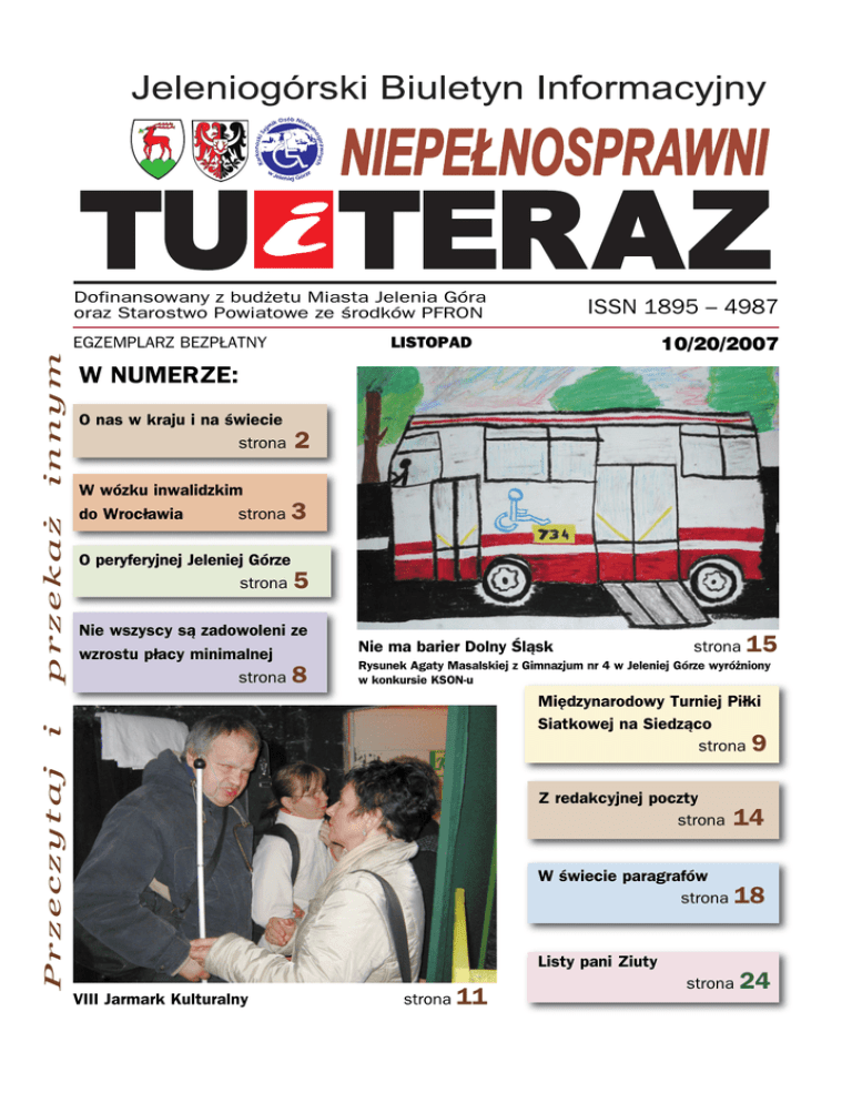 Dofinansowany z budżetu Miasta Jelenia Góra oraz Starostwo Powiatowe ze środków PFRON LISTOPAD innym EGZEMPLARZ BEZPŁATNY 10/20/2007 W NUMERZE: O nas w kraju i na świecie strona 2 W wózku inwalidzkim do Wrocławia strona 3 O peryferyjnej Jeleniej Górze strona 5 Nie wszyscy są zadowoleni ze wzrostu płacy minimalnej strona 8 Nie ma barier Dolny Śląsk strona 15 Rysunek Agaty Masalskiej z Gimnazjum nr 4 w Jeleniej Górze wyróżniony w konkursie KSON-u Międzynarodowy Turniej Piłki Siatkowej na Siedząco strona 9 Przeczytaj i przekaż ISSN 1895 – 4987 Z redakcyjnej poczty strona 14 W świecie paragrafów strona 18 Listy pani Ziuty VIII Jarmark Kulturalny strona 11 strona 24 O NAS W KRAJU I NA ŚWIECIE poddał się eksperymentalnej operacji przywrócenia części słuchu przez wszczepienie implantu śliW maju 26-letnia Kellie Lim, córka chińskich makowego. Trzy lata później, jako jedna z pierwimigrantów, otrzymała na Uniwersytecie Kalifor- szych osób głuchoniewidomych, uzyskał dostęp nijskim dyplom lekarski. W wieku 8 lat zachoro- do Internetu. Wtedy zdał sobie sprawę z tego, że wała na bakteryjne zapalenie opon mózgowych. innego rodzaju implant mógłby umożliwić mu słuLekarze dawali 15 procent szans na przeżycie. chanie muzyki. Drugą operację jego wszczepienia Amputowano jej obie nogi poniżej kolan i prawą przeszedł w 2002 r. rękę poniżej łokcia. Po pięciu miesiącach wróciła Jest entuzjastą muzyki z lat 60., 70. i 80. Utwodo szkoły. Nauczyła się pisać lewą ręką, u której rów nagranych po utracie słuchu nie mógł za doteż ma amputowane końce trzech palców. Była brze poznać. To co puszcza na antenie słyszy przez znakomitą studentką, nie korzystała z żadnej ta- wibracje i rytm, wspomagane przez implanty. Słuryfy ulgowej, nauczyła się nawet robić zastrzyki chacze bardzo lubią jego audycje. jedną ręką. Kellie Lim chodzi na protezach, ale nie użySTWARDNIENIE ROZSIANE I OCZY wa na co dzień protezy ręki. Zakłada ją tylko do niektórych prac w domu. Chce się specjalizować Naukowcy z Johns Hopkins Medical Instituw pediatrii. Przykładem do naśladowania była dla tions przeprowadzili badania na grupie 40 pacjenniej matka, która straciła wzrok w wieku ponad tów ze stwardnieniem rozsianym (SM) za pomodwudziestu lat, ale starała się żyć normalnie, pro- cą techniki tomografii optycznej, która pozwala wadząc dom i wychowując trójkę dzieci. szczegółowo obrazować wnętrze oka. Skanowali LEKARKA BEZ NÓG I RĘKI DJ JEDYNY NA ŚWIECIE 58-letni Mike Gerwat z Wielkiej Brytanii udowadnia, że wszystko jest możliwe. Jako DJ Big MG pracuje w radiu Leeds Eleven FM. Jest, jak sam mówi, jedynym na świecie głuchoniewidomym DJ-em. Urodził się niewidomy. Zawsze kochał muzykę. W 1968 r. jako stroiciel fortepianów pracował między innymi z Eltonem Johnem i zespołem Genesis. Słuch zaczął tracić w 1989 r. Po sześciu tygodniach był już kompletnie głuchy. W 1992 r. MIESIĘCZNIK OSÓB NIEPEŁNOSPRAWNYCH I STARSZYCH DOFINANSOWANY Z BUDŻETU MIASTA JELENIA GÓRA ORAZ STAROSTWO POWIATOWE ZE ŚRODKÓW PFRON Wydawca: Karkonoski Sejmik Osób Niepełnosprawnych Redagują: Marek Chromicz, Andrzej Grzelak (red. naczelny) i zespół wolontariuszy KSON Adres wydawcy i redakcji: ul. Grabowskiego 7, 58-500 Jelenia Góra, tel.: 075 75 242 54, tel./fax centrum informacji: 075 75 231 83, e-mail: [email protected] • www.kson.pl Łamanie: AD REM, Jelenia Góra, ul. 1 Maja 60, tel. 075 75 222 15 Druk: NYC Drukarnia, ul. Grabowskiego 7, 58-500 Jelenia Góra Redakcja nie ponosi odpowiedzialności za treść reklam i ogłoszeń, ts – tekst sponsorowany. Nakład 2000 egz. 2 TU i TERAZ egzemplarz bezpłatny poszczególne warstwy włókien nerwowych w siatkówce. Metoda ta jest prosta i bezbolesna. Wyniki porównano z rezultatami magnetycznego rezonansu jądrowego, stwierdzając znaczną zgodność obu badań. Badanie oka trwa jednak dziesięciokrotnie krócej i kosztuje dziesięciokrotnie taniej. Stwardnienie rozsiane jest chorobą wyniszczającą centralny układ nerwowy – mózg i rdzeń. Zapadają na nie najczęściej ludzie młodzi, około trzydziestego roku życia. Na podstawie PAP, The Guardian, www.niepelnosprawni.pl oprac. ag SPOŁECZNY RZECZNIK OSÓB NIEPEŁNOSPRAWNYCH ZIEMI JELENIOGÓRSKIEJ przyjmuje we wtorki w godz. 11.00-13.00 i czwartki w godz. 13.00-16.00 w biurze Karkonoskiego Sejmiku Osób Niepełnosprawnych przy ul. Grabowskiego 7 w Jeleniej Górze Redakcja „Tu i Teraz” proponuje zamieszczanie reklam oraz tekstów sponsorowanych. Niskie ceny – wysoka skuteczność! Docieramy do ponad 8 tysięcy Czytelników! Zamówienia przyjmuje Biuro KSON-u. W wózku inwalidzkim do Wrocławia Rachunek ekonomiczny jest bezwzględny Osoby poruszające się na wózkach inwalidzkich mają spore kłopoty z dojazdem autobusem z Jeleniej Góry do innych miejscowości. Brakuje przede wszystkim przystosowanych do ich potrzeb pojazdów i to we wszystkich przedsiębiorstwach przewozowych. Problemy te są w firmie KRY-CHA BUS doskonale znane. Jej właściciel, Wojciech Chadży, od wielu lat ma ze środowiskiem niepełnosprawnych ścisłe i bardzo dobre osobiste kontakty, współpracuje z nim w wielu dziedzinach, pomaga potrzebującym, a bywa, że nawet próbuje grać w siatkówkę na siedząco. Niestety, nie znaczy to jednak, że wszystko to ułatwia rozwiązywanie wspomnianych problemów. Wojciech Chadży – To dość skomplikowana sprawa – mówi pan Wojciech. – Chodzi bowiem o pieniądze, które moja firma musi w jakiś sposób pozyskać na odpowiednie przygotowanie techniczne taboru do stałego przewożenia niepełnosprawnych na naszych liniach. W praktyce oznacza to, że po prostu konieczny jest zakup odpowiedniego autobusu. Na samodzielne jego sfinansowanie nas nie stać. Nie ma możliwości potraktowania takiego wydatku jako normalnej inwestycji, bo nawet przy znacznym wzroście tego rodzaju usług i tak miałyby one mar