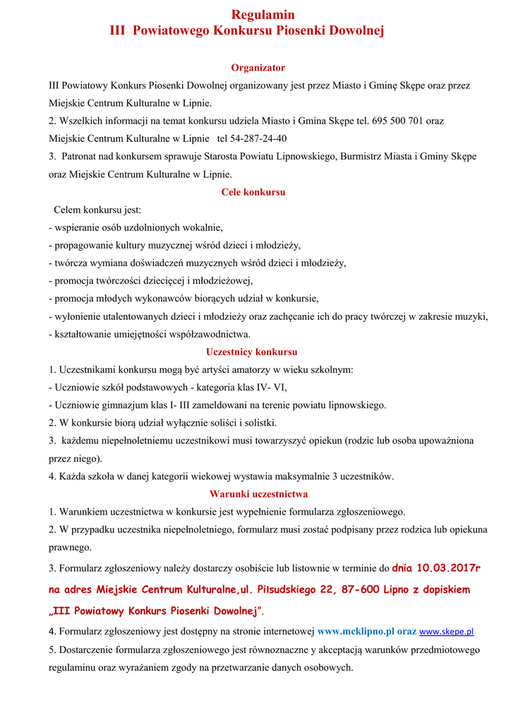 Regulamin III Powiatowego Konkursu Piosenki Dowolnej Organizator III Powiatowy Konkurs Piosenki Dowolnej organizowany jest przez Miasto i Gminę Skępe oraz przez Miejskie Centrum Kulturalne w Lipnie. 2. Wszelkich informacji na temat konkursu udziela Miasto i Gmina Skępe tel. 695 500 701 oraz Miejskie Centrum Kulturalne w Lipnie tel 54-287-24-40 3. Patronat nad konkursem sprawuje Starosta Powiatu Lipnowskiego, Burmistrz Miasta i Gminy Skępe oraz Miejskie Centrum Kulturalne w Lipnie. Cele konkursu Celem konkursu jest: - wspieranie osób uzdolnionych wokalnie, - propagowanie kultury muzycznej wśród dzieci i młodzieży, - twórcza wymiana doświadczeń muzycznych wśród dzieci i młodzieży, - promocja twórczości dziecięcej i młodzieżowej, - promocja młodych wykonawców biorących udział w konkursie, - wyłonienie utalentowanych dzieci i młodzieży oraz zachęcanie ich do pracy twórczej w zakresie muzyki, - kształtowanie umiejętności współzawodnictwa. Uczestnicy konkursu 1. Uczestnikami konkursu mogą być artyści amatorzy w wieku szkolnym: - Uczniowie szkół podstawowych - kategoria klas IV- VI, - Uczniowie gimnazjum klas I- III zameldowani na terenie powiatu lipnowskiego. 2. W konkursie biorą udział wyłącznie soliści i solistki. 3. każdemu niepełnoletniemu uczestnikowi musi towarzyszyć opiekun (rodzic lub osoba upoważniona przez niego). 4. Każda szkoła w danej kategorii wiekowej wystawia maksymalnie 3 uczestników. Warunki uczestnictwa 1. Warunkiem uczestnictwa w konkursie jest wypełnienie formularza zgłoszeniowego. 2. W przypadku uczestnika niepełnoletniego, formularz musi zostać podpisany przez rodzica lub opiekuna prawnego. 3. Formularz zgłoszeniowy należy dostarczy osobiście lub listownie w terminie do dnia 10.03.2017r na adres Miejskie Centrum Kulturalne,ul. Piłsudskiego 22, 87-600 Lipno z dopiskiem „III Powiatowy Konkurs Piosenki Dowolnej”. 4. Formularz zgłoszeniowy jest dostępny na stronie internetowej www.mcklipno.pl oraz www.skepe.pl 5. Dostarczenie formularza zgłoszeniowego jest równoznaczne y akceptacją warunków przedmiotowego regulaminu oraz wyrażaniem zgody na przetwarzanie danych osobowych. Zasady konkursu, ocena prezentacji wokalnych, czas i miejsce. 1. Konkurs odbywać się będzie jednoetapowo - prezentacja uczestników zakwalifikowanych do udziału w konkursie odbędzie się na podstawie złożonych formularzy zgłoszeniowych w w dniu 17.03.2017r. o godz: 10:00 w OSP Skępe 87-630 Skępe ul. Dobrzyńska 1 - prezentacje odbywać się będą z podziałem na poszczególne kategorie wiekowe, - uczestnik prezentuje jeden dowolnie wybrany utwór muzyczny w języku polskim acapella lub z akompaniamentem wyłącznie na płytach CD, - prezentacja nie powinna być dłuższa niż 5 minut, - płyta CD z podkładem muzycznym musi zostać dostarczona do organizatora w dniu konkursu, płyta powinna zawierać następujące dane: (imię nazwisko wykonawcy, nr podkładu na płycie ,tytuł utworu, czas trwania utworu), - organizator nie odpowiada za jakoś dostarczonego podkładu muzycznego, 3. Jury konkursowe oceniać będzie: - dobór repertuaru, tekstu ,muzyki,,umiejętności wokalne,ogólny wyraz artystyczny i zaangażowanie, ruch sceniczny, oddanie nastroju piosenki. 4. Werdykt Jury podczas konkursu jest nieodwołalny. 5. Nagrody oraz dyplomy zostaną wręczone w dniu konkursu. Nagrody Organizator przewiduje nagrody rzeczowe i dyplomy oraz nagranie płyty w studiu nagraniowym w MCK w Lipnie. W każdej kategorii zostaną przyznane miejsca I, II, III oraz wyróżnienia. Informacje pozostałe 1. Organizator zapewnia sprzęt nagłaśniający , mikrofony możliwość odtworzenia płyt CD , oświetlenie. 2. Uczestnicy pokrywają we własnym zakresie koszty przejazdu i ubezpieczenia we wszystkich etapach konkursu. 3. Organizator zastrzega sobie prawo do zmiany przedmiotowego regulaminu, wszelkie informacje dotyczące konkursu publikowane będą na stronie internetowej organizatora www.mcklipno.pl oraz www.skepe.pl. 4. Kwestie sporne nieobjęte regulaminem lub wymagające dodatkowych interpretacji rozstrzyga Organizator. 5. Organizator w trakcie realizacji konkursu może dokonywać utrwalenia jego przebiegu w postaci zdjęć oraz nagrań audio wideo. Osoby zgłoszone do konkursu, a także towarzyszące im osoby trzecie - opiekunowie wyrażają zgodę na publikację wizerunku w środka masowego przekazu.
