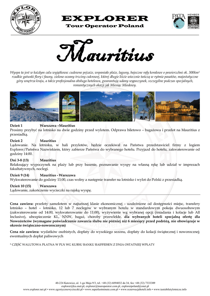 EXPLORER Tour Operator Poland _________________________________________________________________________________________ Mauritius Wyspa ta jest w każdym calu wyjątkowa: cudowne pejzaże, wspaniałe plaże, laguny, bajeczne rafy koralowe o powierzchni ok. 300km2 rzadkie gatunki flory i fauny, zielone oceany trzciny cukrowej, której długie liście wiecznie tańczą w rytmie pasatów, majestatyczne góry wnętrza kraju, a także profesjonalna obsługa hotelowa, gwarantują udany wypoczynek, szczególne podczas specjalnych, romantycznych okazji jak Miesiąc Miodowy. Dzień 1 Warszawa –Mauritius Prosimy przybyć na lotnisko na dwie godziny przed wylotem. Odprawa biletowo – bagażowa i przelot na Mauritius z przesiadką. Dzień 2 Mauritius Lądowanie. Na lotnisku, w hali przylotów, będzie oczekiwał na Państwa przedstawiciel firmy z logiem Explorer/Państwa Nazwiskiem, który zabierze Państwa do wybranego hotelu. Przyjazd do hotelu, zakwaterowanie od godziny 14:00. Dni 3-8 (13) Mauritius Relaksujący wypoczynek na plaży lub przy basenie, poznawanie wyspy na własną rękę lub udział w imprezach fakultatywnych, noclegi. Dzień 9 (14) Mauritius - Warszawa Wykwaterowanie do godziny 11:00, czas wolny a następnie transfer na lotnisko i wylot do Polski z przesiadką. Dzień 10 (15) Warszawa Lądowanie, zakończenie wycieczki na rajską wyspę. Cena zawiera: przeloty samolotem w najtańszej klasie ekonomicznej - uzależnione od dostępności miejsc, transfery lotnisko – hotel – lotnisko, 12 lub 7 noclegów w wybranym hotelu w standardowym pokoju dwuosobowym (zakwaterowanie od 14:00, wykwaterowanie do 11:00), wyżywienie wg wybranej opcji (śniadania i kolacje lub All Inclusive), ubezpieczenie KL, NNW, bagaż, choroby przewlekłe, dla wybranych hoteli specjalną ofertę dla Nowożeńców (wymagane poświadczenie zawarcia ślubu nie później niż 6 miesięcy przed podróżą, nie obowiązuje w okresie świąteczno-noworocznym) Cena nie zawiera: wydatków osobistych, dopłaty do wysokiego sezonu, dopłaty do kolacji świątecznej i noworocznej; ewentualnych dopłat paliwowych * CZĘŚĆ WALUTOWA PŁATNA W PLN WG KURSU BANKU RAIFFEISEN Z DNIA OSTATNIEJ WPŁATY 40-224 Katowice, ul. 1-go Maja 9/3, tel. +48 (32) 6094032 do 34, fax +48 (32) 7333309 [email protected], [email protected], [email protected] www.explorer.net.pl • www.egzotycznewycieczki.pl • www.superlastminute.com.pl • www.rezerwacjahoteli.info • www.taniebiletylotnicze.info LE PALMISTE śniadania i obiadokolacje 12nocy/15dni Cena od osoby: 4990 PLN + 725 EUR* Dopłata do pokoju 1-osobowego: 330 EUR* Dopłata do All Inclusive: 300 EUR* Zniżka dla Panny Młodej: -45 EUR* Dopłata do wysokiego sezonu 26.12.14 - 07.01.15: 990 PLN + 410 EUR*/osoba w pok. 2-os Dopłata do kolacji świątecznej 45 EUR; kolacji noworocznej 50 EUR 7nocy/10dni Cena od osoby: 4960 PLN + 505 EUR* Dopłata do pokoju 1-osobowego: 210 EUR* Dopłata do All Inclusive: 175 EUR* Zniżka dla Panny Młodej: -45 EUR* Dopłata do wysokiego sezonu 26.12.14 - 07.01.15: 990 PLN + 230 EUR*/osoba w pok. 2-os Dopłata do kolacji świątecznej 45 EUR; kolacji noworocznej 50 EUR VERANDA PALMAR All Inclusive 12nocy/15dni Cena od osoby: 4990 PLN + 1340 EUR* 7nocy/10dni Cena od osoby: 4960 PLN + 815 EUR* LE MERIDIEN śniadania i obiadokolacje 12nocy/15dni Cena od osoby: 4990 PLN + 975 EUR* Dopłata do All Inclusive: 300 EUR* Cena dla podróży 01.10-25.12.2014 i 08.01.15 - 06.04.15 Cena dla podróży 01.10-22.12.2014 i 04.01.15 - 30.04.15 Dopłata do pokoju 1-osobowego: 495 EUR* Zniżka dla Panny Młodej: -105 EUR* Dopłata do wysokiego sezonu 23.12.14 - 03.01.15: 990 PLN + 440 EUR*/osoba w pok. 2-os Dopłata do kolacji świątecznej 35 EUR; kolacji noworocznej 45 EUR Dopłata do pokoju 1-osobowego: 285 EUR* Zniżka dla Panny Młodej: brak Dopłata do wysokiego sezonu 23.12.14 - 03.01.15: 990 PLN + 240 EUR*/osoba w pok. 2-os Dopłata do kolacji świątecznej 35 EUR; kolacji noworocznej 45 EUR Cena dla podróży 01.12-21.12.2014 i 11.04.15-30.09.15 Dopłata do pokoju 1-osobowego: 619 EUR* Zniżka dla Panny Młodej: brak Dopłata do wysokiego sezonu 01.10.14 - 30.11.14: 305 EUR*/osoba w pok. 2-os Dopłata do All Inclusive w terminie 01.09.14 – 31.10.2014: 456 EUR* Dopłata do wysokiego sezonu 22.12.14 - 02.01.15: 990 PLN + 1960 EUR*/os w pok. 2-os Dopłata do kolacji świątecznej 62 EUR; kolacji noworocznej 93 EUR 7nocy/10dni Cena od osoby: 4960 PLN + 650 EUR* Dopłata do All Inclusive: 175 EUR* Dopłata do pokoju 1-osobowego: 515 EUR* Zniżka dla Panny Młodej: brak Dopłata do wysokiego sezonu 01.10.14 - 30.11.14: 180 EUR*/osoba w pok. 2-os Dopłata do All Inclusive w terminie 01.09.14 – 31.10.2014: 266 EUR* Dopłata do wysokiego sezonu 22.12.14 - 02.01.15: 990 PLN + 1145 EUR*/os w pok. 2-os Dopłata do kolacji świątecznej 62 EUR; kolacji noworocznej 93 EUR DINAROBIN śniadania i obiadokolacje 12nocy/15dni Cena od osoby: 4990 PLN + 3120 EUR* Cena dla podróży 01.12-19.12.2014 i 01.02.15 - 26.04.15 Dopłata do pokoju 1-osobowego: 650 EUR* Zniżka dla Panny Młodej: 300 EUR Dopłata do wysokiego sezonu: 01.10.14 - 31.10.14 01.11.14 - 30.11.14 09.01.15 - 31.01.15 01.10.15 - 31.10.15 20 .12.14 - 08.01.15 7nocy/10dni 545 EUR/osoba w pokoju 2-osobowym 413 EUR/osoba w pokoju 2-osobowym 3823 EUR/osoba w pokoju 2-osobowym Cena od osoby: 4990 PLN + 1920 EUR* Dopłata do pokoju 1-osobowego: 390 EUR* Zniżka dla Panny Młodej: 175 EUR Dopłata do wysokiego sezonu: 01.10.14 - 31.10.14 01.11.14 - 30.11.14 09.01.15 - 31.01.15 01.10.15 - 31.10.15 20 .12.14 - 08.01.15 320 EUR/osoba w pokoju 2-osobowym 245 EUR/osoba w pokoju 2-osobowym 2230 EUR/osoba w pokoju 2-osobowym 40-224 Katowice, ul. 1-go Maja 9/3, tel. +48 (32) 6094032 do 34, fax +48 (32) 7333309 [email protected], [email protected], [email protected] www.explorer.net.pl • www.egzotycznewyprawy.com.pl • www.superlastminute.com.pl • www.rezerwacjahoteli.info • www.taniebiletylotnicze.info LE PALMISTE http://ww