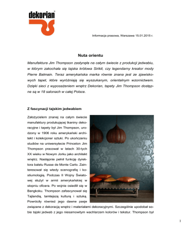 Informacja prasowa, Warszawa 15.01.2015 r. Nuta orientu Manufaktura Jim Thompson zasłynęła na całym świecie z produkcji jedwabiu, w którym zakochała się tajska królowa Sirikit, czy legendarny kreator mody Pierre Balmain. Teraz amerykańska marka równie znana jest ze zjawiskowych tapet, które wyróżniają się wyszukanym, orientalnym wzornictwem. Dzięki sieci z wyposażeniem wnętrz Dekorian, tapety Jim Thompson dostępne są w 18 salonach w całej Polsce. Z fascynacji tajskim jedwabiem Założycielem znanej na całym świecie manufaktury produkującej tkaniny dekoracyjne i tapety był Jim Thompson, urodzony w 1906 roku amerykański architekt i kolekcjoner sztuki. Po ukończeniu studiów na uniwersytecie Princeton Jim Thompson pracował w latach 30-tych XX wieku w Nowym Jorku jako architekt wnętrz. Następnie pełnił funkcję dyrektora baletu Russe de Monte Carlo. Zainteresował się wtedy scenografią i kostiumologią. Podczas II Wojny Światowej służył w armii amerykańskiej w stopniu oficera. Po wojnie osiedlił się w Bangkoku. Thompson zafascynował się Tajlandią, tamtejszą kulturą i sztuką. Powróciły również jego dawne pasje związane z dekoracją wnętrz i materiałami dekoracyjnymi. Szczególnie upodobał sobie tajski jedwab z jego niesamowitym wachlarzem kolorów i tekstur. Thompson był 1 Informacja prasowa, Warszawa 15.01.2015 r. przekonany, że w tkaninie tej tkwi bardzo duży potencjał handlowy i na jej produkcji postanowił oprzeć swoją przyszłą działalność biznesową. Tapety, czyli szlachectwo zobowiązuje Manufaktura Jim Thompson powstała w 1950 roku. Od początku produkowała luksusowe tkaniny dekoracyjne, a z czasem rozszerzyła swoje portfolio o tapety do wnętrz, projektowane przez najbardziej uznanych, światowych designerów. Dzięki licznym znajomo- ściom Jima Thompsona w świecie designu, sztuki, biznesu i mediów, jego materiały szybko osiągnęły dużą popularność w Stanach Zjednoczonych i Europie. W momencie powstania firma zatrudniała 100 pracowników, obecnie dla Jim Thompson pracuje 3000 osób i dysponuje on 50 zakładami produkcyjnymi. Marka jako największy na świecie producent ręcznie tkanych materiałów, szczególnie znana jest dzięki swoim legendarnym tajskim jedwabiom. W ostatnich latach ich sławie z powodzeniem próbują dorównać unikalne kolekcje tapet do wnętrz sygnowane marką Jim Thompson. Ich znakiem rozpoznawczym są różnorodne motywy dekoracyjne o charakterze orientalnym. Źródłem inspiracji dla projektantów jest sztuka, architektura i przyroda Dalekiego Wschodu. Mimo pozornie klasycznej stylistyki wzory tapet od Jima Thompsona intrygują egzotyczną nutą. Architekci, styliści i osoby zawodowo związane z aranżacją wnętrz zachwycają się wzorami tapet Jim Thompson i podkreślają ich niepowtarzalny charakter. Zdaniem Mariusza Kaperczaka, reprezentującego sieć salonów z wyposażeniem wnętrz Dekorian: ”Nie ma na świecie drugiej marki tapet, która w tak wyrafinowany sposób oddawałaby ducha orientu. Dekorian ma w swojej ofercie kilkaset kolekcji tapet pochodzących od kilkunastu producentów, a pomimo 2 Informacja prasowa, Warszawa 15.01.2015 r. tego byliśmy bardzo zdeterminowani, żeby pozyskać tapety Jim Thompson do naszego portfolio”. Od tajskich świątyń po ukwiecone pola Jim Thompson ma w swojej ofercie kilkanaście kolekcji tapet, z których każda liczy kilkadziesiąt wzorów. Tematyka poszczególnych ksiąg jest bardzo zróżnicowana. Kolekcja „House on the Klong” swoją nazwą nawiązuje do domu rodzinnego Jima Thompsona, uznanego za architektoniczny skarb, w którym obecnie znajduje się muzeum założyciela marki. W księdze tej dominują ciepłe kolory, kojarzące się z elegancją tradycyjnych tajskich domów. Wzory „Pagoda and Palms” inspirowane są ręcznie tka- nymi dywanami tybetańskimi. Ornamentyka bogata jest w chińskie motywy i zaskakuje wyjątkowymi zestawieniami kolorystycznymi. Z kolei kolekcja „Temple of Dawn” nawiązuje do słynnej Świątyni Świtu, której zjawiskowe malowidła ścienne, gra kolorów i światła stanowiły źródło inspiracji dla projektantów Jima Thompsona. Wzory posiadają wyraźne motywy azjatyckie takie jak tradycyjna ceramika, ręcznie malowane tkaniny, a także motywy roślinne i zwierzęce. Na uwagę zasługuje również księga „Emerald Isles”, której motywem przewodnim jest wyspiarska fauna i flora wyrażone poprzez desenie i wyraźnie wyczuwalną fakturę. Wyłącznym dystrybutorem tapet marki Jim Thompson w Polsce jest sieć salonów z wyposażeniem wnętrz Dekorian, która dysponuje 18 sklepami firmowymi w największych polskich miastach. 3 Informacja prasowa, Warszawa 15.01.2015 r. *** Więcej szczegółów na temat oferty salonów Dekorian: www.dekorian.pl. Kontakt dla mediów: Marcin Poboży Home Sweet Home PR E-mail: [email protected] Tel. kom.: 604 779 036 4