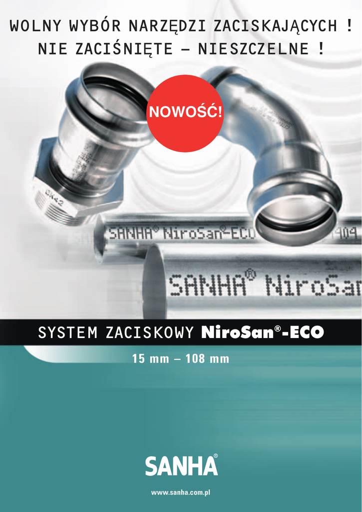 WOLNY WYBÓR NARZ¢DZI ZACISKAJÑCYCH ! NIE ZACIŚNI¢ TE – NIESZCZELNE ! NOWOÂå! SYSTEM ZACISKOWY NiroSan®-ECO 15 mm – 108 mm www.sanha.com.pl SYSTEM ZACISKOWY NiroSan®-ECO GWARANCJA PE¸NEJ KOMPATYBILNOŚCINARZ¢ DZI ZACISKAJÑCYCH Znaczàce korzyÊci ju˝ na etapie kosztorysowania! System zaciskowy NiroSan®-ECO oferuje wszystkie znane zalety systemu NiroSan®-Press. W odró˝nieniu jednak od systemu NiroSan®-Press, rury systemowe NiroSan®-ECO posiadajà zredukowane gruboÊci Êcianek, co skutkuje wyraênym korzyÊciami przy kalkulowaniu kosztów ca∏ej instalacji. System ten znajduje zastosowanie w instalacjach: • wody pitnej • wody deszczowej • przemys∏owych, w miejscach o wysokich wymaganiach higienicznych (np zak∏ady przetwórstwa mi´snego, ubojnie, przetwórstwo innych Êrodków spo˝ywczych). Pe∏na kompatybilnoÊç! Z∏àczki systemu zaciskowego NiroSan®-ECO mo˝na zaciskaç wszystkimi dost´pnymi szcz´kami oraz maszynami zaciskajàcymi przeznaczonymi do zaciskowych systemów metalowych typu M-MM. Nie zaciÊni´te nie szczelne! System zaciskowy NiroSan®-ECO jest tak skonstruowany, ˝e podczas próby ciÊnieniowej z∏àczki nie zaciÊni´te na pewno wyka˝à nieszczelnoÊç. To gwarantujemy! Szczególnie ∏agodny profil zaciÊni´cia! • 8 – kàtny 15 mm do 35 mm • 9 – kàtny 42 mm i 54 mm • Profil trochoidalny 76,1 mm do 108 mm Przez sto˝kowe odkszta∏cenie rury system zaciskowy NiroSan®-ECO zabezpieczony jest równie˝ przed nadzwyczaj du˝ymi udarami ciÊnienia. Ka˝da instalacja obj´ta gwarancjà producenta! SANHA® odpowiada w pe∏ni za szczelnoÊç po∏àczenia! Profil 8-kàtny 15 mm do 35 mm Profil 9-kàtny 42 mm i 54 mm Profil trochoidalny 76,1 mm do 108 mm NiroSan®-ECO - SYSTEM ZACISKOWY WYZNACZAJÑCY PRZYSZ ¸OŚĆ INSTALACJI CENIONA JAKOŚĆ SANHA®. Elementy sk∏adowe systemu: Rury systemowe NiroSan®-ECO w rozmiarach od 15 mm do 108 mm Zredukowana gruboÊç Êcianek Materia∏ nr 1.4404 zgodnie z PN-EN 10088, Wykonane zgodnie z PN-EN 10312 Oznakowanie nadrukiem w kolorze czarnym: SANHA® NiroSan®-ECO DVGW 1.4404 rozmiar nr partii Dost´pne rozmiary: 15 mm x 0,6 mm • 18 mm x 0,7 mm • 22 mm x 0,7 mm • 28 mm x 0,8 mm 35 mm x 1,0 mm • 42 mm x 1,1 mm • 54 mm x 1,2 mm 76,1 mm x 1,5 mm • 88,9 mm x 1,5 mm • 108 mm x 1,5 mm Z∏àczki systemowe NiroSan®-Press Materia∏ nr 1.4404 (cz´Êci formowane) Materia∏ nr 1.4408 (cz´Êci gwintowane/odlewy ze stali nierdzewnej) Uszczelnienie - EPDM Oznakowanie z∏àczek: Wszystkie z∏àczki systemowe NiroSan®-Press oznakowane sà nadrukiem zawierajàcym nast´pujàce dane: rozmiar Kiwa DVGW CSTBat SANHA® - NiroSan® numer partii produktu ewentualnie NiroSan®-Press Gas z∏àczki systemowe do gazu NiroSan®-Press Industry z∏àczki systemowe do zastosowaƒ przemys∏owych Dodatkowo z∏àczki oznakowane sà wyraênie stemplem w kolorze odpowiadajàcym ich przeznaczeniu. Firma SANHA® zastrzega sobie mo˝liwoÊç zmian technicznych. Ârednica zewn´trzna rury [mm] 15 do 54 76,8 - 108 CiÊnienie nominalne [PN] 16 10 Maksymalna temperatura pracy O-ring z EPDM (kolor czarny) -30° C do 120° C KONWENCJONALNE ORAZ ELEKTRONICZNE NARZ¢ DZIA ZACISKAJÑCE DO SYSTEMU ZACISKOWEGO NiroSan®-ECO Maszyny zaciskajàce Dla Êrednic do 54 mm u˝yte mogà zostaç maszyny spe∏niajàce nast´pujàce warunki: • Minimalna si∏a zaciskania : 30 kN • Wymuszony proces zaciskania • Po rozpocz´ciu zaciskania musi zostaç zapewnione, ˝e bez dalszych dodatkowych czynnoÊci (np naciÊni´cie przycisku bezpieczeƒstwa) nie da si´ przerwaç procesu zaciskania przed osiàgni´ciem odpowiedniej si∏y i uzyskaniu prawid∏owego po∏àczenia; Alternatywnie mo˝na stosowaç maszyny, które posiadajà certyfikat jednego z uznanych instytutów badawczych; • Êrednica trzpienia mocujàcego szcz´ki: 14 mm; • minimalna szerokoÊç uchwytu mocujàcego szcz´ki: 33 mm Zciskarki konwencjonalne Zaciskarki z elektronicznà kontrolà procesu zaciskania Dost´pne szcz´ki i ∏aƒcuchy zaciskajàce dla Êrednic do d = 54 mm Dost´pne szcz´ki oraz ∏aƒcuchy zaciskajàce dla rozmiarów Mo˝na stosowaç wszystkie szcz´ki oraz ∏aƒcuchy zaciskajàce do d=15 mm do 108 mm ® metalowych systemów zaciskowych z profilami SANHA -, Geberit- Na przyk∏ad: Mapress lub Viega. SANHA® 6920, 6931.1, 6932 (d=15 mm do 54 mm) do maszyn Na przyk∏ad: SANHA Geberit Viega ® Szcz´ki i ∏aƒcuchy zaciskajàce SANHA®, Nr. katalogowy Szcz´ki i ∏aƒcuchy zaciskajàce Service Plus zaciskajàcych z elektronicznà kontrolà procesu zaciskania 15 mm do 54 mm (Nr katalogowy 6930, 6932, 6940) Typ EFP 3/AFP 3, ACO 3 oraz ECO 3/ ECO 301 Szcz´ki zaciskajàce Standard 15 mm do 35 mm ¸aƒcuchy zaciskajàce i szcz´ki poÊrednie SANHA®, (Nr. katalogowy 6958) Nr katalog 6922, 6931.1, 6931.2, 6931.3 (d=76,1 mm do Szcz´ki zaciskajàce Geberit-Mapress 15 mm do 54 mm 108 mm) do maszyn zaciskajàcych z elektronicznà kontrolà ¸aƒcuchy zaciskajàce Geberit-Mapress 42 mm do 54 mm procesu zaciskania ECO 3/ ECO 301 Szcz´ki Viega do z∏àczek Profipress i Sanpress 15 mm do 54 mm Geberit Szcz´ki i ∏aƒcuchy zaciskajàce Geberit-Mapress (d=15 mm do 54 mm) do maszyn zaciskajàcych z elektronicznà kontrolà procesu zaciskania W dalszym ciàgu mo˝na u˝ywaç szcz´k zaciskajàcych poni˝szej Typ EFP 3/AFP 3, ACO 3 oraz ECO 3/ ECO 301 podanych producentów, pod warunkiem, ˝e posiadajà one oryginalny ¸aƒcuch zaciskajàce i szcz´ki poÊrednie Super Size ® profil zaciskania firm SANHA , Geberit-Mapress lub Viega: Geberit-Mapress,(d=76,1 mm do 108 mm) do maszyn REMS Szcz´ki zaciskajàce REMS V 15 mm do 54 mm, zaciskajàcych Geberit-Mapress ECO 3/ ECO 301 M 15 mm do 35 mm, SA 15 mm do 35 mm Cylinder hydrauliczny HCP w po∏àczeniu z agregatem Szcz´ki zaciskajàce Roller's V 15 mm do 54 mm, oraz ∏aƒcuchami HCP Roller M 15 mm do 35 mm, SA 15 mm do 35 mm Rothenberger Szcz´ki zaciskajàce Vario-Press V 15 mm do 54 mm