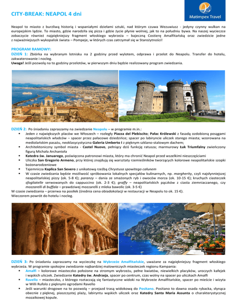 CITY-BREAK: NEAPOL 4 dni Neapol to miasto z burzliwą historią i wspaniałymi dziełami sztuki, nad którym czuwa Wezuwiusz - jedyny czynny wulkan na europejskim lądzie. To miasto, gdzie narodziła się pizza i gdzie życie płynie wolniej, jak to na południu bywa. Na naszej wycieczce zobaczycie również najpiękniejszy fragment włoskiego wybrzeża – bajeczną Costierę Amalfitańską oraz zwiedzicie jedne z najważniejszych wykopalisk świata – Pompeje, w których czas zatrzymał się w Starożytności! PROGRAM RAMOWY: DZIEŃ 1: Zbiórka na wybranym lotnisku na 2 godziny przed wylotem, odprawa i przelot do Neapolu. Transfer do hotelu, zakwaterowanie i nocleg. Uwaga! Jeśli pozwolą na to godziny przelotów, w pierwszym dniu będzie realizowany program zwiedzania. DZIEŃ 2: Po śniadaniu zapraszamy na zwiedzanie Neapolu – w programie m.in.: Jeden z największych placów we Włoszech – rozległy Piazza del Plebiscito; Pałac Królewski z fasadą ozdobioną posągami neapolitańskich władców – spacer przez pałacowe dziedzińce; spacer po labiryncie uliczek starego miasta; wzorowana na mediolańskim pasażu, neoklasycystyczna Galeria Umberto I z pięknym szklano-stalowym dachem; Architektoniczny symbol miasta - Castel Nuovo, pełniący dziś funkcję ratusza; marmurowy Łuk Triumfalny zwieńczony figurą Michała Archanioła Katedra św. Januarego, poświęcona patronowi miasta, który ma chronić Neapol przed wszelkimi nieszczęściami Uliczka San Gregorio Armeno, przy której znajdują się warsztaty rzemieślników tworzących kolorowe neapolitańskie szopki bożonarodzeniowe Tajemnicza Kaplica San Severo z unikatową rzeźbą Chrystusa spowitego całunem W czasie zwiedzania będzie możliwość spróbowania lokalnych specjałów kulinarnych, np. margherity, czyli najsłynniejszej neapolitańskiej pizzy (ok. 5-8 €); paranzy – dania ze smażonych ryb i owoców morza (ok. 10-15 €); kruchych ciasteczek sfogliatelle serwowanych do cappuccino (ok. 2-3 €); graffy – neapolitańskich pączków z ciasta ziemniaczanego, czy mozzarelli di buffala – prawdziwej mozzarelli z mleka bawolic (ok. 3-5 €) W czasie zwiedzania – przerwa na posiłek (średnia cena obiadokolacji w restauracji w Neapolu to ok. 15 €). Wieczorem powrót do hotelu i nocleg. DZIEŃ 3: Po śniadaniu zapraszamy na wycieczkę na Wybrzeże Amalfitańskie, uważane za najpiękniejszy fragment włoskiego wybrzeża. W programie spokojne zwiedzanie najbardziej malowniczych miasteczek regionu Kampania: Amalfi – kolorowe miasteczko położone na stromym wybrzeżu, pełne kwiatów, niewielkich placyków, uroczych kafejek i wąskich uliczek. Zwiedzanie Katedry św. Andrzeja, spacer po centrum, czas wolny na spacer po uliczkach Amalfi Ravello – miasteczko, z którego roztaczają się fantastyczne widoki na Wybrzeże Amalfitańskie, spacer po mieście i wizyta w Willi Rufolo z pięknymi ogrodami Ravello Jeśli warunki drogowe na to pozwolą – przejazd trasą widokową do Positano. Positano to dawna osada rybacka, słynąca obecnie z pięknej, piaszczystej plaży, labiryntu wąskich uliczek oraz Katedry Santa Maria Assunta o charakterystycznej mozaikowej kopule. W czasie zwiedzania – przerwa na posiłek. Wieczorem powrót do hotelu i nocleg. DZIEŃ 4: Po śniadaniu wykwaterowanie i przejazd kolejką do Pompei – miasta, które podczas wybuchu Wezuwiusza w 79 r. zostało przykryte kilkumetrową warstwą popiołów wulkanicznych. Przejście przez Bramę Morską i zwiedzanie wykopalisk, dzięki którym dziś wiemy jak wyglądało życie w miastach Cesarstwa Rzymskiego – m.in. antyczne Forum, Bazylika i Świątynia Apollina, termy miejskie, ruiny amfiteatru, który mógł pomieścić nawet 20 tysięcy widzów oraz domy mieszkalne, ozdobione pięknymi freskami i mozaikami. Jeśli czas pozwoli przejazd do Sorrento – miasteczka, które słynie z pięknych widoków na Zatokę Neapolitańską. Spacer po zabytkowym XV-wiecznym centrum i czas wolny na podziwianie krajobrazu. Dla chętnych degustacja limoncello – cytrynowego likieru pochodzącego z regionu Kampania (ok. 5 €). W czasie zwiedzania – przerwa na posiłek. Po południu powrót do hotelu i odebranie bagażu. Transfer na lotnisko, odprawa i przelot do kraju. HOTELE 3* położone w niewielkim oddaleniu od ścisłego centrum Neapolu, w pobliżu przystanku komunikacji miejskiej. Wszystkie hotele oferują zakwaterowanie w pokojach 2-osobowych (możliwość 1 dostawki) z łazienką, TV i telefonem. Wyżywienie: Śniadania kontynentalne PRZYKŁADOWY HOTEL: ŚWIADCZENIA ZAWARTE W CENIE: Przelot na wybranej trasie (wraz z opłatami lotniskowymi) Bagaż podręczny (cena NIE zawiera bagażu głównego, istnieje możliwość dopłaty do dużej walizki) Transfer lotnisko – hotel – lotnisko Transfer busem/autokarem w 3 dniu wycieczki 3 noclegi w hotelu 3* Pokoje 2-osobowe z łazienkami 3 śniadania Opieka pilota Ubezpieczenie podstawowe Signal Iduna (KL do 10.000 €, NNW do 15.000 zł, CHP i bagaż do 1.000 zł) KOSZTY DODATKOWE: Orientacyjny koszt realizacji programu zwiedzania to ok. 80-100 € (w zależności od wielkości grupy) kwota ta obejmuje przejazdy komunikacją miejską oraz podmiejską podczas realizacji programu, bilety wstępu do zwiedzanych obiektów wraz z kosztami ich rezerwacji (Kaplica San Severo, Pompeje, Willa Rufolo) oraz lokalnych przewodników. Cena nie zawiera podatku miejskiego w wysokości 2-3 €/os/noc INFORMACJE DODATKOWE: Dopłata za pokój 1-osobowy +500 zł (nie ma możliwości dokwaterowania!) Zniżka dla trzeciej osoby w pokoju -100 zł Gwarancja niezmienności ceny +50 zł WYBIERZ SWÓJ BAGAŻ: Cena naszych weekendów zawiera jedynie bagaż podręczny, którego wymiar i wagę określa linia lotnicza operująca na danej trasie – szczegóły znajdziecie na naszej stronie www.matimpex.pl. Przypominamy, że w bagażu podręcznym nie mogą znajdować się płyny ani żele czy fluidy w opakowaniach większych niż 100 m
