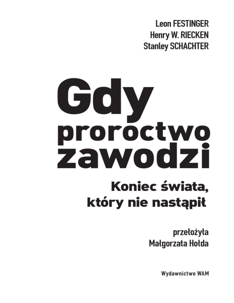 Leon Festinger Henry W. Riecken Stanley Schachter Gdy proroctwo zawodzi Koniec świata, który nie nastapił przełożyła Małgorzata Hołda Wydawnictwo WAM Przedmowa Wyobraź sobie przez chwilę, że grupa osób jest przekonana iż za kilka miesięcy katastrofalna powódź zniszczy kontynent północnoamerykański. Wierzą oni także, że na chwilę przed katastrofą nadleci pojazd z kosmosu, weźmie na pokład tę małą grupę wyznawców i zabierze ich w bezpieczne miejsce na odległej planecie. Przypuśćmy że ci ludzie nie są wariatami o błędnym wzroku, ubranymi w białe szaty i niosącymi transparenty „NAWRÓĆCIE SIĘ!”, ale są inteligentnymi, rozsądnymi ludźmi, mającymi ładne domy, kochające rodziny i dobrą pracę. Zgodnie ze swoimi przekonaniami zrezygnowali z pracy oraz rozdali swoje pieniądze i dobytek (komu potrzebne są pieniądze i dobytek na dalekiej planecie?). Teraz niecierpliwie oczekują na przybycie statku kosmicznego i początek swej podróży, co nastąpi dokładnie o północy 21 grudnia. Co będą czuć ci ludzie i co zrobią 22 grudnia, zakładając oczywiście że Ameryka Północna wciąż będzie istnieć a statek kosmiczny nie przybędzie? To pytanie będzie interesujące niemal dla każdego. Jednak w 1954 roku było ono szczególnie interesujące dla Leona Festingera, błyskotliwego młodego badacza zajmującego się eksperymentalną psychologią społeczną, który pracował nad nową teorią zachowania człowieka – teorią dysonansu poznawczego – mającą wkrótce stać się najbardziej fascynującą teorią w psychologii społecznej. W teorii tej przede wszystkim zdefiniowany został dysonans jako stan napięcia 8 gdy proroctwo zawodzi psychicznego, powstającego wtedy gdy osoba ma dwa elementy poznawcze, które są niezgodne ze sobą: na przykład przekonanie „wiem, że palenie papierosów może mnie zabić” oraz przekonanie „palę dwie paczki dziennie”. Ponieważ dysonans jest nieprzyjemny, ludzie będą próbowali go zredukować przez zmianę jednego lub obu przekonań, tak aby stały się bardziej ze sobą zgodne. W tym przypadku palacze mogą albo rzucić palenie, albo usprawiedliwiać je na jakiejś innej podstawie („palenie zmniejsza mój niepokój”; „powstrzymuje mnie od objadania się”). Im ważniejsza jest dana kwestia i w im większym stopniu osoba jest w nią zaangażowana, tym silniejszy jest dysonans – i tym silniejsza potrzeba jego zredukowania. Kiedy Festinger dowiedział się o tej wierzącej w bliski koniec świata grupie, przeczytawszy w lokalnej gazecie relację „pani Keech” i jej przepowiednie, dostrzegł wymarzony sposób sprawdzenia swej teorii. Członkowie jej grupy znaleźli się w klasycznej sytuacji dysonansu: przedstawili konkretną przepowiednię; jawnie się w nią zaangażowali; podjęli także działania na rzecz tego przekonania, które były właściwie nieodwracalne. Jak ujął to jeden z członków grupy, lekarz: „ Poświęciłem niemal wszystko. Przeciąłem każdą więź: spaliłem wszystkie mosty. Odwróciłem się plecami do świata. Nie mogę sobie pozwolić na żadne wątpliwości. Muszę wierzyć”. Festinger postanowił zatem przyjrzeć się tej grupie zarówno zanim ich proroctwo zawiodło, jak i po tym jak nie zostało ono spełnione. Zaprosił dwóch swoich współpracowników, Henry’ego Rieckena oraz Stanleya Schachtera, i razem dołączyli do grupy w charakterze obserwatorów uczestniczących. Reszta to historia – historia, którą właśnie trzymasz w rękach. przedmowa 9 Był to śmiały sposób testowania teorii dysonansu. Festinger w tym czasie był już znany jako autor nowatorskich eksperymentów laboratoryjnych i ci, którzy nie znali go osobiście, byli zaskoczeni faktem że wstępny sprawdzian jego teorii był tak nieprecyzyjny; to znaczy został przeprowadzony poza przyjaznymi, sterylnymi ścianami laboratorium, w zamęcie prawdziwego świata. Jednak każdy kto kiedykolwiek pracował z Festingerem nie będzie ani trochę zdziwiony, ponieważ intelektualna śmiałość była jedną z jego cech. Spotkałem Leona po raz pierwszy w 1956 roku, kiedy przyjechałem do Stanford jako student pierwszego roku studiów doktoranckich, i natychmiast zacząłem z nim pracować. Książka Gdy proroctwo zawodzi właśnie się ukazała, jednak nie wzbudziła zbyt wielkiego poruszenia i została niemal odrzucona. Przyznawano, że opisuje interesujące badania, jednak błędnie przeprowadzone badania (jeden z recenzentów zbagatelizował je, wykpiwając zarówno ich metody, jak i wnioski). Jednak po fakcie stało się oczywiste, że były to ważne badania i że ta książka była pierwszym wystrzałem rewolucji, która zmieniła sposób w jaki przedstawiciele nauk społecznych rozumieli i wyjaśniali złożone ludzkie zachowania i motywacje. W ciągu następnych lat Leon i jego uczniowie zaplanowali i przeprowadzili serię starannie przygotowanych eksperymentów laboratoryjnych, testujących hipotezy wyprowadzone z tej teorii. Eksperymenty te były tak ściśle kontrolowane i przyniosły tak znaczące wyniki, że teorii dysonansu nie można już było lekceważyć. Dla pokolenia psychologów wychowanych na behawioryzmie lub teorii psychoanalitycznej, dwóch dominujących teoriach połowy dwudziestego wieku, wyniki tych eksperymentów były zaskakujące i niepokojące. Na przykład zgodnie z przewidywa- 10 gdy proroctwo zawodzi niami teorii wzmocnień wszystko co wiąże się z przyjemnymi doświadczeniami będzie lubiane, podczas gdy wszystko, co jest związane z doświadczeniami nieprzyjemnymi zostanie odrzucone. Jednak teoria dysonansu poznawczego umożliwiła formułowanie przewidywań, że osoby, które dobrowolnie poddają się nieprzyjemnej inicjacji aby stać się członkiem grupy, będą w rzeczywistości lubić tę grupę bardziej niż te, którzy dostały się do niej w łatwiejszy sposób. Ich przekonanie „przeszedłem piekło aby stać się członkiem 
