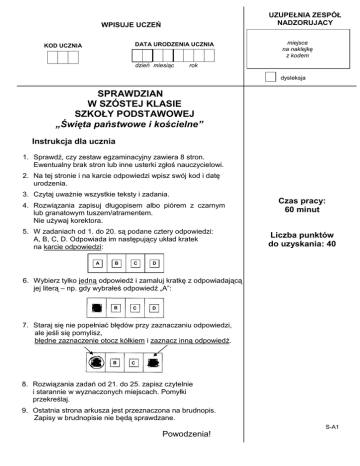 UZUPEŁNIA ZESPÓŁ NADZORUJĄCY WPISUJE UCZEŃ DATA URODZENIA UCZNIA KOD UCZNIA dzień miesiąc miejsce na naklejkę z kodem rok dysleksja SPRAWDZIAN W SZÓSTEJ KLASIE SZKOŁY PODSTAWOWEJ „Święta państwowe i kościelne” Instrukcja dla ucznia 1. Sprawdź, czy zestaw egzaminacyjny zawiera 8 stron. Ewentualny brak stron lub inne usterki zgłoś nauczycielowi. 2. Na tej stronie i na karcie odpowiedzi wpisz swój kod i datę urodzenia. 3. Czytaj uważnie wszystkie teksty i zadania. 4. Rozwiązania zapisuj długopisem albo piórem z czarnym lub granatowym tuszem/atramentem. Nie używaj korektora. 5. W zadaniach od 1. do 20. są podane cztery odpowiedzi: A, B, C, D. Odpowiada im następujący układ kratek na karcie odpowiedzi: A B C Czas pracy: 60 minut Liczba punktów do uzyskania: 40 D 6. Wybierz tylko jedną odpowiedź i zamaluj kratkę z odpowiadającą jej literą – np. gdy wybrałeś odpowiedź „A”: B C D 7. Staraj się nie popełniać błędów przy zaznaczaniu odpowiedzi, ale jeśli się pomylisz, błędne zaznaczenie otocz kółkiem i zaznacz inną odpowiedź. B C 8. Rozwiązania zadań od 21. do 25. zapisz czytelnie i starannie w wyznaczonych miejscach. Pomyłki przekreślaj. 9. Ostatnia strona arkusza jest przeznaczona na brudnopis. Zapisy w brudnopisie nie będą sprawdzane. Powodzenia! S-A1 W Polsce – tak jak i w wielu innych krajach święta dzielą się na państwowe i kościelne. Niektóre z nich są obchodzone przez państwo i kościół jednocześnie. Naszym świętem państwowym jest 11 Listopada, upamiętniający odzyskanie niepodległości przez Polskę w 1918 roku po 123 latach niewoli. Świętami państwowymi są też: 1 Maja – Święto Pracy i 3 Maja na pamiątkę uchwalenia w Polsce w 1791 roku Konstytucji 3 Maja, pierwszej w Europie ustawy określającej ustrój państwa. Dzień 15 sierpnia przypomina nam o zwycięstwie nad Rosją Radziecką w 1920 roku pod Warszawą, nazywanym cudem nad Wisłą. Dni 3 maja i 15 sierpnia są również świętami kościelnymi. Świętem państwowym i kościelnym jest także Nowy Rok – 1 stycznia. Święta stałe to te, które są obchodzone zawsze w tym samym terminie. Oprócz wyżej wymienionych świąt katolicy w Polsce obchodzą następujące święta stałe: Boże Narodzenie (25 i 26 grudnia) oraz Wszystkich Świętych (1 listopada). Są to dni wolne od pracy w całym państwie. Dla katolików dniem świątecznym jest też Wigilia (24 grudnia) oraz Dzień Zaduszny (2 listopada). Wyznawcy innych religii również mają swoje święta, w Polsce nie są to jednak dni wolne od pracy. Niektóre święta kościelne nie zawsze wypadają w te same dni miesiąca. Nazywamy je wtedy świętami ruchomymi (np. Wielkanoc i Boże Ciało). Są one również dniami wolnymi od pracy. 1. Powyższy tekst to: A. opowiadanie, B. list, 2. A. B. C. D. C. notatka, Tekst: posiada wartką akcję, ma charakter informacyjny, skierowany jest do konkretnego odbiorcy, jest wielowątkowy. 3. Polska utraciła niepodległość w roku: A. 1790, B. 1795, C. 1753, 4. A. B. C. D. Święta ruchome to: Boże Narodzenie i Wielkanoc, Dzień Zaduszny i Wigilia, Boże Ciało i Wielkanoc, Wszystkich Świętych i Wigilia. 5. A. B. C. D. Święta Bożego Narodzenia w Polsce obchodzone są: na końcu kalendarzowej zimy, w pierwszych dniach kalendarzowej zimy, w drugim miesiącu kalendarzowej zimy, w samym środku kalendarzowej zimy. 2 D. opis. D. 1918. © Copyright by Wydawnictwa Szkolne i Pedagogiczne Spółka Akcyjna, Warszawa 2002. 6. A. B. C. D. „Cud nad Wisłą” wydarzył się: 11 listopada 1918r., 1 listopada 1918r., 3 maja 1791r., 15 sierpnia 1920r. 7. A. B. C. D. Świętem państwowym nie jest dzień: 11 listopada, 1 maja, 1 listopada, 1 stycznia. 8. A. B. C. D. Konstytucję 3 maja uchwalono w wieku: XX, XIX, XVIII, XVII. 9. A. B. C. D. 11 listopada 1918 roku Polska: odzyskała swoją niepodległość, odzyskała swoje dawne terytorium, uległa rozbiorom, utraciła swoje miejsce na mapie Europy. 10. Dzień Zaduszny jest świętem stałym. Oznacza to, że: A. nie zawsze wypada w ten sam dzień miesiąca, B. jest obchodzony dwa razy do roku, C. jest świętem kościelnym i państwowym, D. jest obchodzony co roku w tym samym dniu tego samego miesiąca. 11. Z okazji niektórych świąt państwowych dekoruje się budynki, pomieszczenia i inne miejsca flagami państwowymi. Uczniowie przygotowują chorągiewki. Każda chorągiewka składa się z dwóch części, czerwonej i białej. Każda z tych części chorągiewki przedstawionej na rysunku jest: A. równoległobokiem, B. trapezem równoramiennym, C. trapezem prostokątnym, D. pięciokątem. 12. W 1889 roku ustanowiono 1 maja Międzynarodowym Świętem Pracy. Było to: A. w drugiej połowie dziewiętnastego wieku, B. w pierwszej połowie osiemnastego wieku, C. w pierwszej połowie dziewiętnastego wieku, D. w drugiej połowie osiemnastego wieku. © Copyright by Wydawnictwa Szkolne i Pedagogiczne Spółka Akcyjna, Warszawa 2002. 3 13. Informację o tym, w jakim dniu tygodnia przypada w tym roku, Święto Pracy znajdziesz: A. w encyklopedii, B. w książce „Potrawy świąteczne”, C. w kalendarzu na cały rok, D. w książce „ Wiersze na różne okazje”. Jan Matejko, jest autorem obrazu Konstytucja 3 Maja 1791, namalowanego w 1891 roku. Obraz został wykonany farbami olejnymi na płótnie o wymiarach 247 cm x 446 cm. 14. Płótno to zmieści się na ścianie o wymiarach: A. 2,4 m x 4,5 m, B. 2,4 m x 4,4 m, C. 2,5 m x 4,4 m, D. 2,5 m x 4,5 m. 15. Na wykonanie drewnianych ramek, wzmacniających brzegi płótna tego obrazu, wystarczy: A. 7 metrów listewek, B. 12 metrów listewek, C. 13 metrów listewek, D. 14 metrów listewek. 4 © Copyright by Wydawnictwa Szkolne i Pedagogiczne Spółka Akcyjna, Warszawa 2002. 16. W roku 2001 Wigilia Świąt Bożego Narodzenia przypadała w poniedziałek. Rok 2002 rozpoczął się: A. w poniedziałek, B. we wtorek, C. w niedzielę, D. w środę. 17. W wielu domach 