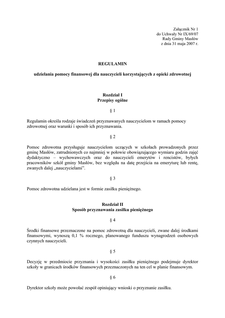 Załącznik Nr 1 do Uchwały Nr IX/69/07 Rady Gminy Masłów z dnia 31 maja 2007 r. REGULAMIN udzielania pomocy finansowej dla nauczycieli korzystających z opieki zdrowotnej Rozdział I Przepisy ogólne §1 Regulamin określa rodzaje świadczeń przyznawanych nauczycielom w ramach pomocy zdrowotnej oraz warunki i sposób ich przyznawania. §2 Pomoc zdrowotna przysługuje nauczycielom uczących w szkołach prowadzonych przez gminę Masłów, zatrudnionych co najmniej w połowie obowiązującego wymiaru godzin zajęć dydaktyczno – wychowawczych oraz do nauczycieli emerytów i rencistów, byłych pracowników szkół gminy Masłów, bez względu na datę przejścia na emeryturę lub rentę, zwanych dalej „nauczycielami”. §3 Pomoc zdrowotna udzielana jest w formie zasiłku pieniężnego. Rozdział II Sposób przyznawania zasiłku pieniężnego §4 Środki finansowe przeznaczone na pomoc zdrowotną dla nauczycieli, zwane dalej środkami finansowymi, wynoszą 0,1 % rocznego, planowanego funduszu wynagrodzeń osobowych czynnych nauczycieli. §5 Decyzję w przedmiocie przyznania i wysokości zasiłku pieniężnego podejmuje dyrektor szkoły w granicach środków finansowych przeznaczonych na ten cel w planie finansowym. §6 Dyrektor szkoły może powołać zespół opiniujący wnioski o przyznanie zasiłku. Rozdział III Warunki przyznawania pomocy zdrowotnej §7 Z pomocy finansowej mają prawo korzystać nauczyciele, którzy: 1) leczą się w innej miejscowości z powodu braku placówki służby zdrowia w ich miejscu zamieszkania, 2) leczą się w miejscu zamieszkania z powodu przewlekłej choroby lub gdy przebieg choroby nauczyciela jest wyjątkowo ciężki, 3) korzystać muszą z pomocy leczniczej specjalistycznej w innej miejscowości, mimo istnienia ośrodka zdrowia w miejscu pracy lub miejscu zamieszkania. §8 Wniosek o przyznanie zasiłku pieniężnego na pomoc zdrowotną zawierający uzasadnienie, poparty zaświadczeniem lekarskim (odpowiednio: kartą informacyjną leczenia szpitalnego); rachunkami za poniesione koszty związane z leczeniem i rehabilitacją, składają zainteresowani nauczyciele do dyrektora szkoły. §9 Przy rozpatrywaniu wniosków nauczycieli o przyznanie zasiłku należy uwzględniać przede wszystkim: 1) wysokość kosztów poniesionych przez nauczyciela w związku z przeprowadzeniem leczenia, 2) całokształt okoliczności wpływających na sytuację materialną nauczyciela (choroba przewlekła, konieczność dalszego leczenia w domu, stosowania specjalnej diety, zapewnienia dodatkowej opieki dla chorego itp.) § 10 W szczególnie uzasadnionych przypadkach z wnioskiem o zasiłek pieniężny dla nauczyciela mogą wystąpić przełożeni nauczyciela, rady pedagogiczne lub opiekun, jeżeli nauczyciel ten nie jest zdolny do podejmowania czynności w tym zakresie. § 11 Wzór wniosku stanowi załącznik Nr 1 do regulaminu. Przewodnicząca Rady Gminy Masłów /-/ Genowefa Jaros Załącznik Nr 1 do Regulaminu udzielania pomocy finansowej dla nauczycieli korzystających z opieki zdrowotnej WNIOSEK o przyznanie zasiłku pieniężnego na pomoc zdrowotną dla nauczyciela 1. Nazwisko i imię: ...................................................................................................................... 2. Miejsce zamieszkania: ............................................................................................................. .................................................................................................................................................. 3. Ponoszone koszty leczenia, uzasadnienie: ............................................................................... ................................................................................................................................................... ................................................................................................................................................... ................................................................................................................................................... ................................................................................................................................................... ………………………………………………………………………………………………... ……………………………………………………………………………………………….. 4. Miejsce pracy: .......................................................................................................................... 5. Stanowisko: .............................................................................................................................. 6. Wymiar czasu pracy: .............................................................................................................. 7. Sytuacja materialna rodziny: Nazwisko i imię nauczyciela A Dochód* rodziny (netto) B Liczba członków rodziny pozostałych we wspólnym gospodarstwie domowym C Dochód netto na członka rodziny Poniesione koszty leczenia D=B:C D E * Przez dochód rodziny, o którym mowa w załączniku należy rozumieć wartość średnią sumy wszystkich źródeł dochodu rodziny z ostatnich 3 miesięcy poprzedzających datę złożenia wniosku 8. Do wniosku załączono: .................................................................................................................................................. ................................................................................................................................................... ................................................................................................................................................... ................................................................................................................................................... ..................
