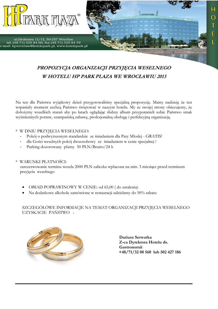 PROPOZYCJA ORGANIZACJI PRZYJĘCIA WESELNEGO W HOTELU HP PARK PLAZA WE WROCŁAWIU 2013 Na ten dla Państwa wyjątkowy dzień przygotowaliśmy specjalną propozycję. Mamy nadzieję że ten wspaniały moment zechcą Państwo świętować w naszym hotelu. My ze swojej strony obiecujemy, że dołożymy wszelkich starań aby po latach oglądając ślubny album przypomnieli sobie Państwo smak wyśmienitych potraw, szampańską zabawę, profesjonalną obsługę i perfekcyjną organizację. * W DNIU PRZYJĘCIA WESELNEGO: - Pokój o podwyższonym standardzie ze śniadaniem dla Pary Młodej - GRATIS! - dla Gości weselnych pokój dwuosobowy ze śniadaniem w cenie specjalnej ! - Parking dozorowany płatny 50 PLN/Brutto/24 h * WARUNKI PŁATNOŚCI: zarezerwowanie terminu wesela 2000 PLN zaliczka wpłacona na min. 3 miesiące przed terminem przyjęcia weselnego OBIAD POPRAWINOWY W CENIE: od 65,00 ( do ustalenia) Na dodatkowe alkohole zamówione w restauracji udzielamy do 50% rabatu SZCZEGÓŁÓWE INFORMACJE NA TEMAT ORGANIZACJI PRZYJĘCIA WESELNEGO UZYSKACIE PAŃSTWO : Dariusz Serwatka Z-ca Dyrektora Hotelu ds. Gastronomii +48/71/32 08 560 lub 502 427 186 PROPOZYCJE MENU Menu weselne w cenie 220 pln/osoba Powitanie chlebem, solą i winem musującym Obiad Bulion z filetem drobiowym i makaronem Schab pieczony z jabłkami i trawa żubrową Rolada z indyka faszerowana pomidorami suszonymi i bazylia Bitki wołowe w sosie pieczeniowym Krokiety ziemniaczane Ziemniaki gotowane Kluski śląskie Zestaw surówek, warzywa gotowane Deser Patera ciast Patera owoców Zakąski zimne Rostbef z kremem chrzanowym Schab aromatyzowany rozmarynem i grzybami Półmisek wędlin: szynka wędzona, kabanosy, indyk wędzony, salami Łosoś sous vide podawany na sałatce z kopru włoskiego Śledź w kremie jabłkowo - cebulowym Omlet szpinakowy z musem czosnkowym Roladka z serem i warzywami Sałatka makaronowa z kurczakiem i suszonymi pomidorami Sałatka z tuńczykiem i jajkiem Warzywa świeże i konserwowe Pieczywo, masło smakowe Tort okolicznościowy Bigos wrocławski podawany z białą kiełbasą Barszcz z kulebiakiem Napoje Kawa, herbata, woda , sok 200 ml/os Przyjęcie weselne w Hotelu HP Park Plaza tel. 502-427-186; e-mail:[email protected]; [email protected]; www.hotelepark.pl Menu weselne w cenie 250 pln/osoba Powitanie chlebem, solą i winem musującym Obiad Polędwica wieprzowa aromatyzowana trawą żubrową na sałacie z grzybami Consommé z indyka z kluseczkami Kotlety schabowe z grilla z salsą pomidorową Zrazy wołowe zawijane w sosie pieczeniowym Łosoś ze szpinakiem w ziołowym sosie Kluski śląskie, krokiety ziemniaczane, ziemniaki z koperkiem Warzywa gotowane, sałata z ziołowym vinegrette Deser Patera ciast weselnych (sernik wiedeński, ciasto czekoladowe, babeczki z owocami, szarlotka) Patera owoców Bufet zimny Terrina z sandacza i krewetek Roladki z karpia i żurawiny Koreczki śledziowe Pieczony rostbef z karczochami i chrzanem Pierś z indyka faszerowana koprem włoskim i estragonem Pieczeń wieprzowa aromatyzowana gorczycą Półmisek wędlin Pasztet z dzika z orzechami Patera serów z owocami Sałatka z serem feta I pestkami słonecznika Sałatka z indyka wędzonego i ananasa Tort okolicznościowy Szynka pieczona w pomarańczach (serwowana przez kucharza) Tradycyjny barszcz czerwony z kulebiakiem Napoje Kawa, herbata, sok 200ml/ osoba, woda b/o Przyjęcie weselne w Hotelu HP Park Plaza tel. 502-427-186; e-mail:[email protected]; [email protected]; www.hotelepark.pl Menu weselne w cenie 280 pln/osoba Powitanie chlebem, solą i winem musującym Obiad Górka cielęca sous vide na sałatce z rukoli i suszonych pomidorów Zupa krem z borowików Udo z królika w kremie z warzyw Polędwiczki wieprzowe w sosie kaparowym Łosoś w sosie porowo- estragonowym Warzywa gotowane, knedle z bułki, ziemniaki z koperkiem Warzywa gotowane, sałatka z sosem vinegrette, szparagi w sosie cytrynowym, mus z marchewki Deser Patera ciast bankietowych (mini finezja, panna cotta z owocami, rolada makowa, babeczki z owocami) Patera owoców Bufet zimny Sum wędzony na sałacie z selera naciowego Sandacz faszerowany krewetkami Mus z łososia w glonach nori Filet z kaczki sous vide na pikantnej sałatce z gruszki Roladki z polędwiczki wieprzowej z musem drobiowo- truflowym Pieczony rostbef z kremem chrzanowym i szparagami Mus z dzika w omlecie szpinakowym z żurawiną Mini babeczki faszerowane pastą jajeczną i serową z warzywami Mini tortille z pastą serową- warzywna Sałatka z krewetkami i koprem włoskim Mix sałat z serem kozim i pestkami dyni Tort okolicznościowy Pieczony udziec cielęcy aromatyzowany rozmarynem, czosnkiem i suszonymi pomidorami ( serwowany przez kucharza) Bogracz Barszcz z pasztecikiem Napoje w trakcie przyjęcia są serwowane bez ograniczeń : Kawa, Herbata, Soki, Napoje gazowane (coca-cola, sprite itp.) Woda Przyjęcie weselne w Hotelu HP Park Plaza tel. 502-427-186; e-mail:[email protected]; [email protected]; www.hotelepark.pl Menu weselne w cenie 370 pln/osoba Powitanie truskawkami w czekoladzie z winem musującym Obiad Comber z jelenia na sałatce z marynowanymi kurkami i żurawiną Krem z krewetek Polędwica wołowa w sosie truflowym Pierś z kaczki sous vide w sosie pomarańczowa imbirowym Łosoś sous vide w kremie z kopru włoskiego i raków Kluski francuskie, tymbaliki i z sera i kaszy gryczanej z grzybami, ryz z warzywami, szparagi w sosie, mus z marchewki z serem Deser Bufet ciast bankietowych ( tiramisu, babeczki z owocami, musy czekoladowe i owocowe) Owoce filetowane + fontanna czekoladowa Bufet zimny Sushi mix ( łosoś, tuńczyk, warzywa) przygotowany przez kucharza na sali Rolada z sandacza i krewetek Parafait z łososia i kwaśną śmietaną Pierś z gęsi na sałatce z pomidorów i awokado Górka cielęca z kremem jabłkowym Comber z królika na sałatce z selera naciowego i jabłka Polędwiczka wieprzowa pieczona w omlecie szpinakowym Koktajl z krewetek Rukola z kozim serem i pis