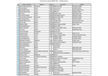 Nr startowe 1 Runda ORMT 2015 - 10 Rajd Zimowy Nr 1 2 3 4 5 6 7 8 9 10 11 12 13 14 15 16 17 18 19 20 21 22 23 24 25 26 27 28 29 30 31 32 33 34 35 36 37 38 39 Imię i nazwisko Michał Wieczorkowski Tomasz Buller Bartek Blachowski Marek Słupczewski Igor Stasz Krzysztof Świtajski Tomek Wieczorkowski Piotr Słupczewski Waldek Blachowski Tomasz Nyc Mikołaj Cieślik Filip Ziembikiewicz Wiktor Świtajski Piotr Lipa Kacper Dorobek Jarosław Żurek Michał Jasiński Karol Bilinkiewicz Łukasz Bilinkiewicz Radosław Schenker Adam Rzymyszkiewicz Piotr Wróblewski Marek Rauchfleisz Oskar Nyc Kacper Świtajski Szymon Mączkowski Dawid Bilinkiewicz Mateusz Kala Łukasz Piórkowski Jan Struszek Bartek Janowski Mateusz Kuligowski Wiktor Foks Paweł Jakubowski Witold Piórkowski Paweł Grabowski Robert Czarnecki Filip Świtajski Marcel Kruszyński Miasto Warszawa Toruń Toruń Toruń Chełm Toruń Warszawa Toruń Toruń Błonie Toruń Toruń Toruń Chełm Włocławek Poznań Toruń Toruń Toruń Głogowo Toruń Toruń Toruń Błonie Toruń Nowe Miasto Lubawskie Toruń Bydgoszcz Kowalewo Pomorskie Toruń Łódź Toruń Toruń Lubawa Kowalewo Pomorskie Toruń Warszawa Toruń Lubawa klasa WRC WRC WRC WRC S2000 S2000 S2000 S2000 WRC S2000 S1600 S1600 S1600 WRC S1600 WRC WRC WRC N WRC WRC S1600 N N N S2000 N S1600 S2000 S1600 WRC WRC WRC WRC S2000 S1600 S1600 N N karoseria BMW M1 Rally Lancer Evo X Ford Focus BMW Z4 Peugeot 208 Volkswagen Golf 24 Skoda Fabia WRC Nissan 370Z Peugeot 306 Ford Escort Subaru Impreza 2008 Subaru BRZ Mercedes AMG C-Class Citroen DS3 Honda Civic Fiat 131 Abarth Subaru Impreza WRC SUBARU 2008 SUBARU 2008 Subaru Impreza Lancia Delta Integrale VW GOLF 24 Fiesta WRC Ford Focus Subaru Subaru Impreza Mitsubishi Lancer Evolution X Datsun Subaru Impreza Lancia Delta HF Integrale Skoda Fabia Subaru Impreza 2001 BMW M3 Nissan 350z Subaru Impreza Chevrolet Camaro Lancer WRC 2005 Ford Focus Mitsubishi Lancer Evolution X Zespół MAZOVIA TEAM SLUPEKS TEAM Quattro Rally Team SLUPEKS TEAM Słoiki Rally Team ŚWISTAK TEAM MAZOVIA TEAM SLUPEKS TEAM Quattro Rally Team Słoiki Rally Team Kaper Team ŚWISTAK TEAM Słoiki Rally Team Kodos Team Subaru Poland RC Team SLUPEKS TEAM SLUPEKS TEAM Kodos Team ADAMeR TEAM Słoiki Rally Team ŚWISTAK TEAM Salon BHP-Serwis Rally Team JazdaMiejska Team AMRc RC CT TEAM odLot ŚWISTAK TEAM