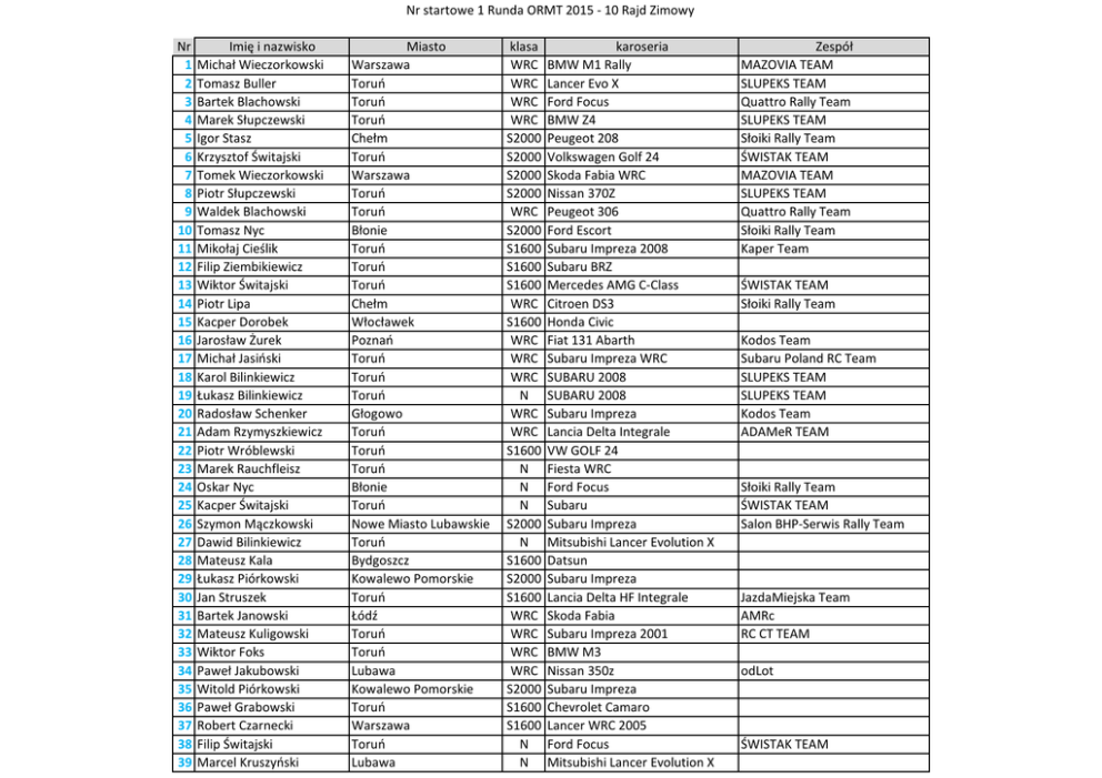 Nr startowe 1 Runda ORMT 2015 - 10 Rajd Zimowy Nr Imię i
