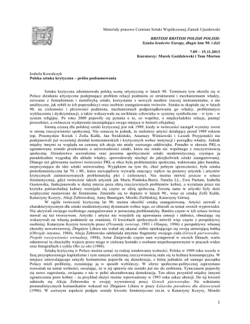Materiały prasowe Centrum Sztuki Współczesnej Zamek Ujazdowski BRITISH BRITISH POLISH POLISH: Sztuka krańców Europy, długie lata 90. i dziś 7.09 – 15.11.2013 Kuratorzy: Marek Goździewski i Tom Morton Izabela Kowalczyk Polska sztuka krytyczna – próba podsumowania Sztuka krytyczna zdominowała polską scenę artystyczną w latach 90. Terminem tym określa się w Polsce działania artystyczne podejmujące problem relacji podmiotu ze strukturami i mechanizmami władzy, zerwanie z formalizmem i metafizyką sztuki, korzystanie z nowych mediów (raczej instrumentalne, a nie analityczne, jak robili to ich poprzednicy) oraz osobiste zaangażowanie twórców. Sztuka ta skupiała się w latach 90. na cielesności i płciowości podmiotu, mechanizmach podporządkowania go władzy, problematyce wykluczenia i dyskryminacji, a także wskazywała na uwikłanie człowieka w systemy symboliczne – w tym – w system religijny. Po roku 2000 pojawiły się pytania o to, co wspólne, o międzyludzkie relacje, pamięć przeszłości, a zwłaszcza wydarzenia nieznajdujące swego miejsca w historii oficjalnej. Istotną cezurą dla polskiej sztuki krytycznej jest rok 1989, kiedy w twórczości nastąpił wyraźny zwrot w stronę rzeczywistości społecznej. Nie oznacza to jednak, że niektórzy artyści działający przed 1989 rokiem (np. Przemysław Kwiek i Zofia Kulik, Jan Świdziński, Anastazy Wiśniewski i Leszek Przyjemski) nie podejmowali już wcześniej działań kontestatorskich i krytycznych wobec instytucji i porządku władzy. Jednak między innymi ze względu na cenzurę ich akcje nie miały szerszego oddźwięku. Ponadto w okresie PRL-u ugruntowane zostało przekonanie o uniwersalności sztuki, która nie miała nic wspólnego z rzeczywistością społeczną. Dziedzictwo socrealizmu oraz pozorna apolityczność sztuki modernistycznej, czyniąca ją paradoksalnie wygodną dla układu władzy, spowodowały niechęć do jakiejkolwiek sztuki zaangażowanej. Dlatego też głównemu nurtowi twórczości PRL-u obca była problematyka społeczna, traktowana jako banalna, nieprzystająca do idei sztuki uniwersalnej. Wyjątkiem na tym tle, choć pełnym sprzeczności, była sztuka protofeministyczna lat 70. i 80., która niewątpliwie wywarła znaczący wpływ na postawy artystek i artystów krytycznych zainteresowanych problematyką płci i cielesności. Nie można mówić jeszcze o sztuce feministycznej, gdyż twórczość takich artystek jak Maria Pinińska-Bereś, Natalia LL, Ewa Partum, Izabella Gustowska, funkcjonowała w dużej mierze poza sferą rzeczywistych problemów kobiet, a wyrażana przez nie krytyka patriarchalnej kultury rozmijała się często ze sferą społeczną. Zresztą same te artystki były dość sceptycznie nastawione do feminizmu. Zmieniło się to dopiero w latach 90., wraz ze sztuką Zofii Kulik, Katarzyny Kozyry, Alicji Żebrowskiej, Anny Baumgart, Moniki Zielińskiej, Katarzyny Górnej. W ogóle twórczość krytyczną lat 90. można określić sztuką zaangażowaną. Artyści zerwali z charakterystycznym dla sztuki modernistycznej dystansem wobec tego, co obierali za temat swoich wypowiedzi. Nie ukrywali swojego osobistego zaangażowania w poruszaną problematykę. Bardzo często w ich sztuce twórca stawał się też tworzywem. Artystki i artyści nie wstydzili się ujawniania emocji i słabości, obnażając się wskazywali na własną podatność na zranienie. O kwestiach społecznych mówili więc często z perspektywy osobistej. Katarzyna Kozyra tworzyła prace (Piramidę zwierząt, 1993 i Olimpię, 1996) z perspektywy własnej choroby nowotworowej, Zbigniew Libera nie wahał się ukazać siebie opiekującego się swoją umierającą babką (Obrzędy intymne, 1984), Alicja Żebrowska odsłaniała intymne fragmenty swojego ciała (Grzech pierworodny. Projekt rzeczywistości wirtualnej, 1994), Artur Żmijewski często sam występował w swoich filmach, warto odnotować tu chociażby wejście przez niego w cielesny kontakt z osobami niepełnosprawnymi w pracach wideo oraz fotografiach z cyklu Oko za oko (1988). Sztukę krytyczną w Polsce można uznać za rodzaj sondowania wolności. Polska w 1989 roku weszła w fazę przyspieszonego kapitalizmu i tym samym codzienną rzeczywistością stała się tu kultura konsumpcyjna. W miejsce zniewalającego umysły komunizmu pojawiła się demokracja, z którą jednakże od samego początku Polacy mieli problemy, rozumiejąc ją w sposób wybiórczy. W sferze społeczno-politycznej zaprzestano rozważań na temat wolności, uważając, że w tej sprawie nie zostało już nic do zrobienia. Tymczasem pojawiły się nowe zagrożenia, związane z nie w pełni ukształtowaną demokracją. Ten okres przyniósł między innymi ograniczenia praw kobiet – za przykład służyć możne wprowadzony w 1993 roku zakaz aborcji. Do tej kwestii odniosła się Alicja Żebrowska w swojej wywrotowej pracy Grzech pierworodny. Na wdrażanie pronatalistycznych komunikatów wskazał też Zbigniew Libera w pracy Łóżeczka porodowe dla dziewczynek (1996). W szerszym aspekcie podjęte zostały kwestie feministyczne (m.in. u Katarzyny Kozyry, Moniki 1 Zielińskiej, Anny Baumgart). W Polsce od lat 90. toczą się też batalie o prawa mniejszości, przede wszystkim LGBTQ, nie do końca respektowane są konstytucyjne prawa wolności wypowiedzi oraz zgromadzeń. Mamy raczej do czynienia ze swoistą dyktaturą większości, która marginalizuje problemy grup mniejszościowych, spycha je w sferę prywatną, dokonując tym samym ich depolityzacji. Przedstawienie problematyki grup dyskryminowanych poprzez sztukę krytyczną odegrało więc niezwykle ważną rolę osadzenia ich w sferze publicznej. Jednak ta twórczość, zwłaszcza pojawiająca się w sferze publicznej, napotykała w Polsce na próby blokowania i cenzury. Z jednej strony nadzieje, które przyniosło zerwanie z komunizmem, wprowadzenie demokracji i wolności słowa, a z drugiej – no