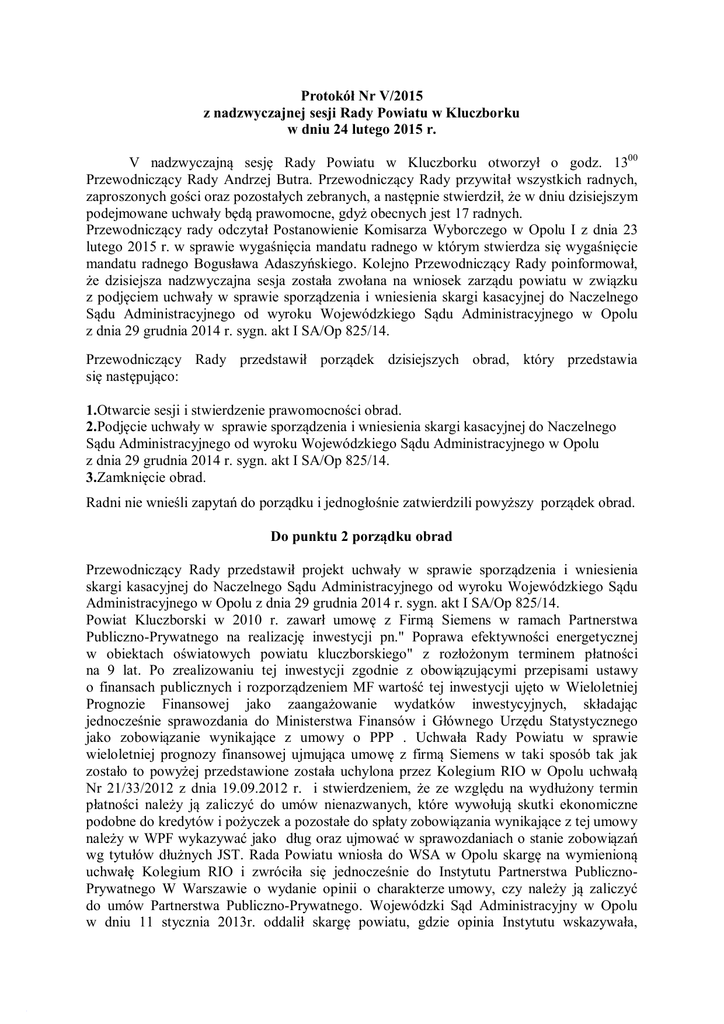 Protokół Nr V/2015 z nadzwyczajnej sesji Rady Powiatu w Kluczborku w dniu 24 lutego 2015 r. V nadzwyczajną sesję Rady Powiatu w Kluczborku otworzył o godz. 1300 Przewodniczący Rady Andrzej Butra. Przewodniczący Rady przywitał wszystkich radnych, zaproszonych gości oraz pozostałych zebranych, a następnie stwierdził, że w dniu dzisiejszym podejmowane uchwały będą prawomocne, gdyż obecnych jest 17 radnych. Przewodniczący rady odczytał Postanowienie Komisarza Wyborczego w Opolu I z dnia 23 lutego 2015 r. w sprawie wygaśnięcia mandatu radnego w którym stwierdza się wygaśnięcie mandatu radnego Bogusława Adaszyńskiego. Kolejno Przewodniczący Rady poinformował, że dzisiejsza nadzwyczajna sesja została zwołana na wniosek zarządu powiatu w związku z podjęciem uchwały w sprawie sporządzenia i wniesienia skargi kasacyjnej do Naczelnego Sądu Administracyjnego od wyroku Wojewódzkiego Sądu Administracyjnego w Opolu z dnia 29 grudnia 2014 r. sygn. akt I SA/Op 825/14. Przewodniczący Rady przedstawił porządek dzisiejszych obrad, który przedstawia się następująco: 1.Otwarcie sesji i stwierdzenie prawomocności obrad. 2.Podjęcie uchwały w sprawie sporządzenia i wniesienia skargi kasacyjnej do Naczelnego Sądu Administracyjnego od wyroku Wojewódzkiego Sądu Administracyjnego w Opolu z dnia 29 grudnia 2014 r. sygn. akt I SA/Op 825/14. 3.Zamknięcie obrad. Radni nie wnieśli zapytań do porządku i jednogłośnie zatwierdzili powyższy porządek obrad. Do punktu 2 porządku obrad Przewodniczący Rady przedstawił projekt uchwały w sprawie sporządzenia i wniesienia skargi kasacyjnej do Naczelnego Sądu Administracyjnego od wyroku Wojewódzkiego Sądu Administracyjnego w Opolu z dnia 29 grudnia 2014 r. sygn. akt I SA/Op 825/14. Powiat Kluczborski w 2010 r. zawarł umowę z Firmą Siemens w ramach Partnerstwa Publiczno-Prywatnego na realizację inwestycji pn." Poprawa efektywności energetycznej w obiektach oświatowych powiatu kluczborskiego" z rozłożonym terminem płatności na 9 lat. Po zrealizowaniu tej inwestycji zgodnie z obowiązującymi przepisami ustawy o finansach publicznych i rozporządzeniem MF wartość tej inwestycji ujęto w Wieloletniej Prognozie Finansowej jako zaangażowanie wydatków inwestycyjnych, składając jednocześnie sprawozdania do Ministerstwa Finansów i Głównego Urzędu Statystycznego jako zobowiązanie wynikające z umowy o PPP . Uchwała Rady Powiatu w sprawie wieloletniej prognozy finansowej ujmująca umowę z firmą Siemens w taki sposób tak jak zostało to powyżej przedstawione została uchylona przez Kolegium RIO w Opolu uchwałą Nr 21/33/2012 z dnia 19.09.2012 r. i stwierdzeniem, że ze względu na wydłużony termin płatności należy ją zaliczyć do umów nienazwanych, które wywołują skutki ekonomiczne podobne do kredytów i pożyczek a pozostałe do spłaty zobowiązania wynikające z tej umowy należy w WPF wykazywać jako dług oraz ujmować w sprawozdaniach o stanie zobowiązań wg tytułów dłużnych JST. Rada Powiatu wniosła do WSA w Opolu skargę na wymienioną uchwałę Kolegium RIO i zwróciła się jednocześnie do Instytutu Partnerstwa PublicznoPrywatnego W Warszawie o wydanie opinii o charakterze umowy, czy należy ją zaliczyć do umów Partnerstwa Publiczno-Prywatnego. Wojewódzki Sąd Administracyjny w Opolu w dniu 11 stycznia 2013r. oddalił skargę powiatu, gdzie opinia Instytutu wskazywała, iż umowa posiada cechy umowy o charakterze umowy o Partnerstwie Publiczno-Prywatnym i umów tego typu nie należy zaliczać do długu w JST. Powiat wniósł skargę kasacyjną do Najwyższego Sądu Administracyjnego w Warszawie , w dniu 17 czerwca 2014r. NSA uchylił zaskarżony wyrok WSA i skierował sprawę do ponownego rozpatrzenia Wojewódzkiemu Sądowi Administracyjnemu w Opolu. W dniu 22 grudnia 2014 r. Wojewódzki Sąd Administracyjny w Opolu rozpatrzył ponownie skargę Powiatu Kluczborskiego na uchwałę Regionalnej Izby Obrachunkowej w Opolu z dnia 19 września 2012 r. nr 21/33/2012 w przedmiocie stwierdzenia nieważności uchwały Nr XXIII/169/2012 Rady Powiatu w Kluczborku z dnia 30 sierpnia 2012 r. w sprawie zmiany wieloletniej prognozy finansowej. Wyrokiem WSA z dnia 29 grudnia 2014r. oddalona została skarga Powiatu. Z powyższym rozstrzygnięciem nie zgadza się Powiat Kluczborski. Zgodnie z zapisami art.173 § 1 i § 2 ustawy z dnia 30 sierpnia 2002 r. Prawo o postępowaniu przed sądami administracyjnymi od wydanego wyroku przez WSA przysługuje skarga kasacyjna, którą może wnieść strona (zgodnie z art. 177 § 1 ww. ustawy w terminie 30 dni od dnia doręczenia skarżącemu rozstrzygnięcia w sprawie). Ostateczny termin wniesienia skargi kasacyjnej do NSA upływa 2 marca 2015 r. Do wniesienia skargi i ustanowienia pełnomocnictw niezbędne jest stanowisko Rady Powiatu, jako skarżącego wyrażone w drodze uchwały. W związku z powyższym zachodzi konieczność podjęcia przedmiotowej uchwały. Głos zabrał pan Starosta który poinformował, że termin złożenia skargi upływa w dniu 3 marca 2015 r., dlatego też zarząd powiatu wystąpił z wnioskiem do Przewodniczącego Rady o zwołanie sesji nadzwyczajnej w związku z podjęciem uchwały w sprawie sporządzenia i wniesienia skargi kasacyjnej do Naczelnego Sądu Administracyjnego od wyroku Wojewódzkiego Sądu Administracyjnego w Opolu z dnia 29 grudnia 2014 r. sygn. akt I SA/Op 825/14. Pan Starosta poinformował, że postępowanie w powyższej sprawie toczy się od kilku lat. Pan Starosta poinformował, że spór z Regionalną Izbą Obrachunkową w Opolu trwa od 2012 roku, cała historia zaczyna się od zmiany wieloletniej prognozy finansowej, w której nie zostało ujęte zadłużenie względem Siemensa, które według Regionalnej Izby Obrachunkowej w Opolu powinno zostać ujęte w związku ze zmianą ustawy. Pan Starosta wyjaśnił, że pod koniec 2010 roku minister finansów wydał rozporządzenie w sprawie szczegółowej
