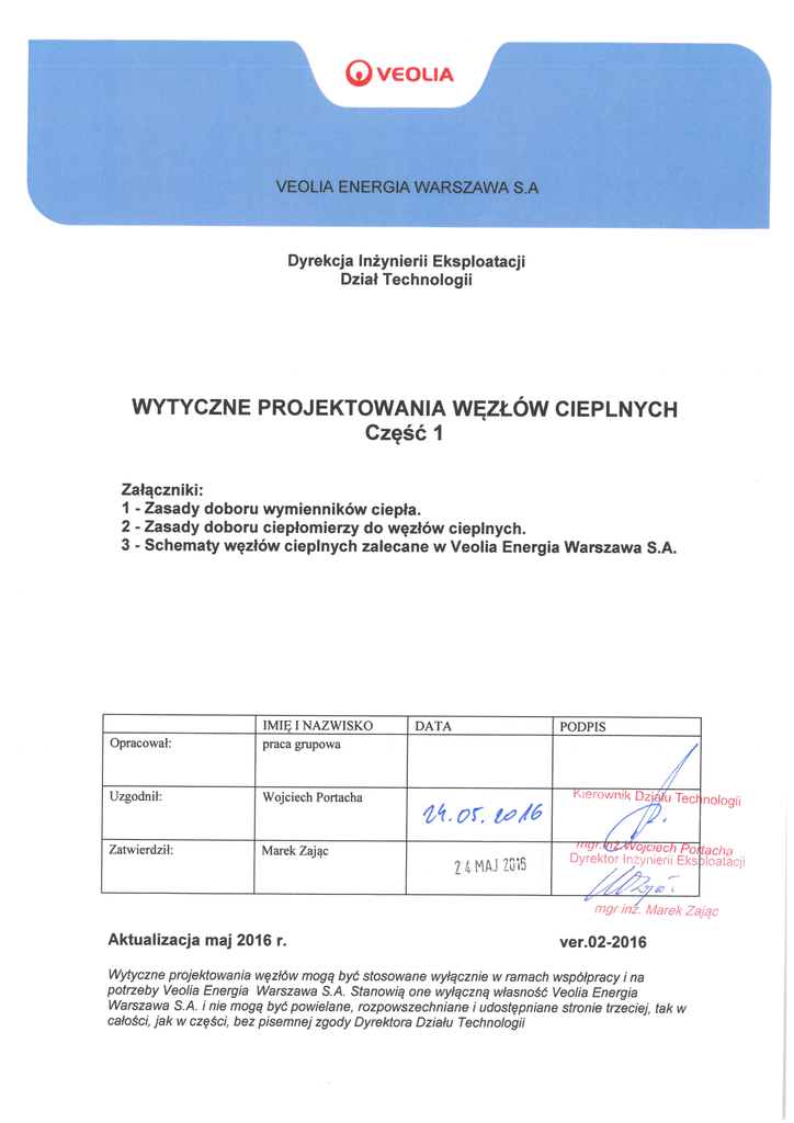 Wytyczne projektowania węzłów cieplnych – część 1 Spis treści 1. Zakres stosowania wytycznych .................................................................................... 3 2. Ogólne założenia techniczne do projektu węzła cieplnego. ....................................... 3 2.1. Dane wejściowe ....................................................................................................... 3 2.2. Parametry wody sieciowej ........................................................................................ 3 2.3. Parametry węzłów centralnego ogrzewania i ciepła technologicznego ..................... 3 2.4. Parametry węzłów ciepłej wody ................................................................................ 4 3. Wymagania projektowe ogólne..................................................................................... 5 4. Wymagania projektowe szczegółowe........................................................................... 6 4.1. Wymagania dla pomieszczenia węzła i rozmieszczenia urządzeń ............................ 6 4.2. Armatura .................................................................................................................. 7 4.3. Wymienniki ciepła ..................................................................................................... 8 4.4. Wymienniki C.W. ...................................................................................................... 9 4.5. Wymienniki C.O...................................................................................................... 10 4.6. Wymienniki C.T. ..................................................................................................... 11 4.7. Automatyka ............................................................................................................ 11 4.8. Ciepłomierze .......................................................................................................... 11 4.9. Pompy .................................................................................................................... 12 4.10. Zabezpieczenie instalacji odbiorczych przed przekroczeniem dopuszczalnego ciśnienia i temperatury ......................................................................................... 13 4.11. Filtry i odmulacze ................................................................................................. 14 4.12. Rurociągi .............................................................................................................. 14 4.13. Izolacja cieplna ..................................................................................................... 14 4.14. Aparatura kontrolno-pomiarowa ........................................................................... 15 4.15. Instalacja uzupełniania wody – jakość wody instalacyjnej ..................................... 16 4.16. Zasobniki C.W. ..................................................................................................... 17 4.17. Zabezpieczenie antykorozyjne ............................................................................. 17 4.18. Zabezpieczenie przed Legionellą ......................................................................... 17 4.19. Instalacja elektryczna ........................................................................................... 18 5. Założenia do obliczeń .................................................................................................. 21 5.1. Zapotrzebowanie na moc cieplną dla C.W.............................................................. 21 5.2. Natężenia przepływu wody sieciowej i instalacyjnej do projektowych obliczeń hydraulicznych........................................................................................................ 22 5.3. Podstawowe założenia do doboru elementów węzła .............................................. 24 5.4. Średnice rurociągów wody sieciowej i instalacyjnej ................................................ 25 6. Wykaz przywołanych norm i przepisów ..................................................................... 27 7. Wykaz przywołanych opracowań ............................................................................... 28 Załącznik 1 ...................................................................................................................... 30 Załącznik 2 ...................................................................................................................... 44 Załącznik 3 ...................................................................................................................... 46 str. 2 z 52 Wytyczne projektowania węzłów cieplnych – część 1 1. Zakres stosowania wytycznych. Wymiennikowe węzły cieplne c.o., c.w. i c.t. zasilane z sieci ciepłowniczej, przystosowane do pracy w zakresie temperatur wody sieciowej na zasilaniu do 124 ºC i ciśnień do 1,6 MPa. 2. Ogólne założenia techniczne do projektu węzła cieplnego. 2.1. Dane wejściowe. Podstawowe dane wejściowe do projektu węzła podane są w warunkach przyłączenia węzła cieplnego do sieci ciepłowniczej dla obiektów nowoprojektowanych lub w informacji o obiekcie (obiekty istniejące) wydawanej przez Dział Technologii. Dane te zawierają przydziały mocy cieplnej oraz wartości ciśnienia dyspozycyjnego i ciśnienia zasilania na przyłączu sieci ciepłowniczej. Założenia do projektowania zawarte są w protokole ogólnych założeń techniczno-eksploatacyjnych do projektu węzła cieplnego wielofunkcyjnego, oraz w protokole ogólnych założeń techniczno-eksploatacyjnych dla instalacji c.o., ciepła technologicznego i ciepłej wody zasilanych z węzłów indywidualnych. Dokumenty te wydawane są łącznie z przydziałami ciepła (obiekty nowe) lub na odrębny wniosek projektanta (obiekty istniejące). Projekt węzła cieplnego powinien być zgodny z wymaganiami d