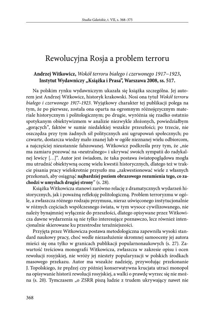 Studia Gdańskie, t. VII, s. 368–375 Rewolucyjna Rosja a problem terroru Andrzej Witkowicz, Wokół terroru białego i czerwonego 1917−1923, Instytut Wydawniczy „Książka i Prasa”, Warszawa 2008, ss. 517. Na polskim rynku wydawniczym ukazała się książka szczególna. Jej autorem jest Andrzej Witkowicz, historyk krakowski. Nosi ona tytuł Wokół terroru białego i czerwonego 1917–1923. Wyjątkowy charakter tej publikacji polega na tym, że po pierwsze, została ona oparta na ogromnym różnojęzycznym materiale historycznym i politologicznym; po drugie, wyróżnia się rzadko ostatnio spotykanym obiektywizmem w analizie niezwykle złożonych, powiedziałbym „gorących”, faktów w sumie niedalekiej wszakże przeszłości; po trzecie, nie oszczędza przy tym żadnych sił politycznych ani ugrupowań społecznych; po czwarte, dostarcza wiedzy mało znanej lub w ogóle nieznanej wielu odbiorcom, a najczęściej nieustannie fałszowanej. Witkowicz podkreśla przy tym, że „nie ma zamiaru pozować na »neutralnego« i ukrywać swoich sympatii do radykalnej lewicy […]”. Autor jest świadom, że taka postawa światopoglądowa mogła mu utrudnić obiektywną ocenę wielu kwestii historycznych, dlatego też w trakcie pisania pracy wielokrotnie przyszło mu „zakwestionować wiele z własnych przekonań, aby osiągnąć najbardziej poziom obrazowego rozumienia tego, co zachodzi w umysłach drugiej strony” (s. 28). Książka Witkowicza stanowi zarówno relację z dramatycznych wydarzeń historycznych, jak i poważną refleksję politologiczną. Problem terroryzmu w ogóle, a zwłaszcza różnego rodzaju przymusu, nieraz uświęconego instytucjonalnie w różnych częściach współczesnego świata, w tym wysoce cywilizowanego, nie należy bynajmniej wyłącznie do przeszłości, dlatego opisywane przez Witkowicza dawne wydarzenia są nie tylko interesujące poznawczo, lecz również intencjonalnie skierowane ku przestrodze teraźniejszości. Przyjęta przez Witkowicza postawa metodologiczna zapewniła wysoki standard naukowy pracy, choć wedle niezasłużenie skromnej samooceny jej autora mieści się ona tylko w granicach publikacji popularnonaukowych (s. 27). Zawartość treściowa monografii Witkowicza, zwłaszcza w zakresie opisu i ocen rewolucji rosyjskiej, nie wróży jej niestety popularyzacji w polskich środkach masowego przekazu. Autor ma wszakże nadzieję, przywołując przekonanie J. Topolskiego, że prędzej czy później konserwatywna krucjata utraci monopol na opisywanie historii rewolucji rosyjskiej, a walki o prawdę wyrzec się nie można (s. 20). Tymczasem „o ZSRR piszą ludzie z trudem ukrywający nawet nie 368 Rewolucyjna Rosja a problem terroru niechęć, a wprost nienawiść do Października i wszystkich jego konsekwencji” (s. 16 ). Warto przeto przynajmniej pobieżnie wyartykułować w tym miejscu co najwyżej kilka bardziej istotnych wątków treściowo bogatej i różnorodnej problematyki podejmowanej przez Witkowicza. Pomijam semantyczne rozważania autora dotyczące treści pojęć terroru, terroryzmu i tym podobnych oraz form ich występowania i uprawiania, poczynając od państwowych, a kończąc na tak zwanych żywiołowo-ludowych. Konieczna jest tylko jedna uwaga. Terror sam przez się nie bywa ani czerwony, ani biały. Jest po prostu terrorem; natomiast przymiotniki „czerwony” lub „biały” konotują jedynie określone siły społeczne (polityczne), które posiłkują się tym instrumentem. Zasadnicza hipoteza Witkowicza brzmi: terror nie miał decydującego znaczenia w zdobyciu i utrzymaniu władzy przez bolszewików oraz innych komunistów, decydujące znaczenie za każdym razem miało bowiem poparcie mas. Trzeba bezstronnie przyznać, że tezę tę weryfikuje on za pomocą ogromnej liczby danych empirycznych oraz statystycznych. Na wskroś falsyfikują one zarazem takie publikacje, jak Czarna księga komunizmu (1999), Rewolucja Rosyjska R. Pipesa (1995), Historia Rosji P. Wieczorkiewicza (2005), odpowiednie rozważania D. Wołkogonowa, A. Jakowlewa i wielu innych. Witkowicz skoncentrował się na latach 1917–1923, czyli na okresie od przewrotu rewolucyjnego do końca wojny domowej i początków stanowienia nowego ładu społeczno-politycznego i ekonomicznego w Rosji. Sięga nadto do wielu innych krajów spoza Rosji: Europy, Ameryki, Azji, Afryki. Interesują go w tym zakresie zarówno rosyjskie poczynania kontrrewolucyjne, działania państw Ententy, jak i sposoby terroryzowania ruchów rewolucyjnych i narodowo-wyzwoleńczych w całym ówczesnym świecie. Autor nie szczędzi przy tym ani czerwonych, ani białych. Gdy zachodzi potrzeba, ciężkie działa swojej krytyki wytacza także przeciw bolszewikom. Rewolucję rosyjską, zdaniem Witkowicza, przygotował reżim carski, zwłaszcza monarchia Mikołaja II: „Wśród tzw. »cywilizowanych« krajów Rosja Mikołaja II wyróżniała się represyjnością” (s. 53). Również jednak w czasach panowania Aleksandra II i Aleksandra III obficie korzystano z wyroków śmierci wobec niepokornych. Wybuchały nieustanne bunty chłopskie, brutalnie pacyfikowane przez wojsko. Bezwzględnie rozprawiano się z robotnikami i wolnomyślicielską inteligencją. Cyklicznie powtarzający się prawie co dziesięć lat głód (1872, 1882, 1892, 1901, 1911) i związane z nim epidemie chorób stwarzały atmosferę powszechnego wrzenia. A to z kolei potęgowało represje. Swoiste błędne koło zacieśniało się coraz bardziej. Rewolucja w latach 1905−1906 to także efekt wytworzonej przez carat sytuacji rewolucyjnej. Przykładowo: tylko na ulicach Warszawy w dniach 27−30 stycznia 1905 roku zabito prawdopodobnie około 200 osób, 1 maja – 37, 1 listopada – 40. Wojskowe represje, sądy doraźne, zesłania na Syberię były codzienną praktyką caratu w całym imperium rosyjskim. Car Mikołaj II oświadczył ongiś wręcz swemu generałowi Kazbekowowi: „Do ludu trzeba strzelać, generale
