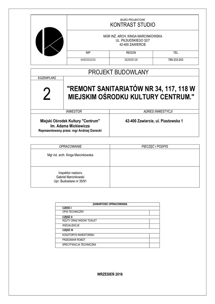 BIURO PROJEKTOWE KONTRAST STUDIO MGR INŻ. ARCH. KINGA MARCINKOWSKA UL. PIŁSUDSKIEGO 32/7 42-400 ZAWIERCIE NIP REGON TEL 6492303234 362608126 789-333-203 PROJEKT BUDOWLANY EGZEMPLARZ 2 "REMONT SANITARIATÓW NR 34, 117, 118 W MIEJSKIM OŚRODKU KULTURY CENTRUM." INWESTOR ADRES INWESTYCJI Miejski Ośrodek Kultury "Centrum" Im. Adama Mickiewicza 42-400 Zawiercie, ul. Piastowska 1 Reprezentowany przez: mgr Andrzej Danecki OPRACOWANIE PIECZĘĆ I PODPIS Mgr inż. arch. Kinga Marcinkowska Inspektor nadzoru Gabriel Marcinkowski Upr. Budowlane nr 35/91 ZAWARTOŚĆ OPRACOWANIA CZEŚĆ I OPIS TECHNICZNY CZĘŚĆ II RZUTY ORAZ WIDOKI TOALET WIZUALIZACJE CZĘŚĆ III KOSZTORYS INWESTORSKI PRZEDMIAR ROBÓT SPECYFIKACJA TECHNICZNA WRZESIEŃ 2016 OPIS TECHNICZNY DO PROJEKTU: "REMONT SANITARIATÓW NR 34, 117, 118 W MIEJSKIM OŚRODKU KULTURY CENTRUM." INWESTOR Miejski Ośrodek Kultury "Centrum" Im. Adama Mickiewicza ADRES INWESTYCJI 42-400 Zawiercie, ul. Piastowska 1 Reprezentowany przez: mgr Andrzej Danecki 1. ZAKRES OPRACOWANIA. Przedmiotem opracowania są pomieszczenia: 34, 117, 118 przeznaczone do remontu w zakresie architektoniczno – budowlanym, aranżacji funkcjonalnej wnętrz, z dostosowaniem instalacji elektrycznej oświetleniowej oraz lokalizacji instalacji wod-kan. UWAGA Inwestor dopuszcza zamianę poszczególnych projektowanych elementów wykończenia lub wyposażenia wnętrz będących przedmiotem niniejszego opracowania, pod warunkiem utrzymania projektowanego efektu wnętrzarskiego i zachowania parametrów technicznych i jakościowych. Wymagana jest akceptacja Projektanta w zakresie formy, koloru, wykończenia powierzchni i parametrów technicznych dla zamiennych elementów. Przy zakupie chemii budowlanej – fug, gruntów, izolacji typu płynne gumy, klejów do płytek wskazane jest stosowanie materiałów jednego producenta, bez czego niemożliwe jest egzekwowanie gwarancji na poszczególne produkty. 2. DANE TECHNICZNE Toaleta nr: 118, 34 -męska Toaleta składa się z przedsionka wraz z umywalką oraz z kabiny z pisuarem oddzielonej ścianą działową z cegły i kabiny ustępowej. Wysokość pomieszczenia: 2,65m. Toaleta nr: 117 Toaleta składa się z przedsionka wraz z umywalką oraz z kabiny ustępowej. Wysokość pomieszczenia: 2,65m. 3. ZAKRES ROBÓT REMONTOWYCH PRZEWIDZIANYCH W PROJKECIE Zakres robót przewidzianych w projekcie: Roboty demontażowe: demontaż drzwi; demontaż kratek wentylacyjnych i osłonowych demontaż lamp oświetleniowych; demontaż okładzin ściennych i podłogowych skucie posadzki demontaż istniejących włączników i gniazd elektrycznych; demontaż istniejącego wyposażenia sanitarnego Roboty remontowo-montażowe: uzupełnienie ścianek działowych; uzupełnienie tynków; obsadzenie kratek wentylacyjnych, ściennych oraz sufitowych; obsadzenie ościeżnic wraz z montażem drzwi aluminiowych; wyrównanie podłoża pod posadzkę; montaż płytek podłogowych oraz ściennych; wykonanie sufitu podwieszonego gipsowo-kartonowego na powierzchni zmycie i zeskrobanie starej farby na ścianach oraz sufitach; przygotowanie podłoża pod malowanie farbami akrylowymi; dwukrotne malowanie ścian i sufitów farbami akrylowymi; wykonanie zabudowy g-k pod umywalki nablatowe wykonanie osłony przewodów wod-kan z zabudowy g-k dostosowanie położenia przewodów wod-kan (wg projektu) montaż i zabudowa spłuczki do wc oraz misy podwieszanej Roboty elektryczne: montaż przewodów elektrycznych; montaż opraw halogenowych montaż włączników świetlnych; Wykończenie i wyposażenie wnętrza dostarczenie i montaż armatury łazienkowej montaż drzwi; dostarczenie i montaż podajników na papier toaletowy, podajników na ręczniki papierowe, dozowników do mydła w płynie, koszy na śmieci; 4. STAN PROJEKTOWANY Jakiekolwiek wskazane w opisie przedmiotu zamówienia (dokumentacji projektowej, specyfikacji technicznej wykonania i odbioru robót budowlanych, przedmiarach robót), znaków towarowych, patentów lub pochodzenia, źródła lub szczególnego procesu, który charakteryzuje produkty lub usługi dostarczane przez konkretnego wykonawcę mają na celu jedynie przybliżenie wymagań, których nie można było opisać przy pomocy dostatecznie dokładnych i zrozumiałych określeń. Wszelkie nazewnictwo kolorystyki, drzwi, płytek lub innych elementów wyposażenia zawarte w opisie przedmiotu zamówienia poprzez podanie konkretnej nazwy producenta lub wizualizację należy traktować jedynie jako wskazówkę ułatwiającą identyfikację typu pożądanego przez Zamawiającego. Zamawiającemu oprócz kolorystyki zależy także na właściwościach fizycznych, estetycznych i wizualnych, niemożliwych do precyzyjnego opisania bez podania nazw własnych lub wizualizacji konkretnych elementów wyposażenia. Dlatego też przed przystąpieniem do prac remontowych należy uzyskać akceptację kolorystyki i faktury płytek, drzwi i innych elementów wyposażenia przez projektanta. Z uwagi na powyższe dopuszcza się produkty równoważne o parametrach jakościowych, cechach użytkowych, właściwościach fizycznych, estetycznych i wizualnych co najmniej na poziomie parametrów wskazanego produktu, uznając tym samym każdy produkt o wskazanych lub lepszych parametrach (właściwościach). Projektowane roboty nie wprowadzają nowych utrudnień oraz barier architektonicznych dla osób niepełnosprawnych. 4.1 Ściany Płytki 60x60cm wg wizualizacji odcienie szarości i bieli - układać na krzyżykach dystansowych 0,5mm (efekt tafli) (wybór płytek przed zakupem należy skonsultować z projektantem) Toaleta 34, 118: 1) Gres szkliwiony / półmat / szary / gatunek I / kl. ścieralności min. IV / wymiar: 60x60cm / 2) Gres szkliwiony / połysk / biel / gatunek I / kl. ścieralności min. IV / wymiar: 60x60cm / Toaleta 117: 1) Gres szkliwiony / połysk / biel / imitacja marmuru / gatunek I / kl. ścieralności min. IV / wymiar: 60x60cm / 2) Gres szkliwiony / półmat / biel / gatunek I