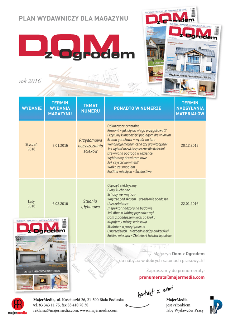 PLAN WYDAWNICZY DLA MAGAZYNU rok 2016 WYDANIE Styczeń 2016 Luty 2016 TERMIN WYDANIA MAGAZYNU 7.01.2016 6.02.2016 TEMAT NUMERU Przydomowa oczyszczalnia ścieków Studnia głębinowa TERMIN NADSYŁANIA MATERIAŁÓW PONADTO W NUMERZE Odkurzacze centralne Remont – jak się do niego przygotować? Przytulny klimat dzięki podłogom drewnianym Brama garażowa – wybór na lata Wentylacja mechaniczna czy grawitacyjna? Jak wybrać drzwi bezpieczne dla dziecka? Drewniana podłoga w łazience Wybieramy drzwi tarasowe Jak czyścić kominek? Walka ze smogiem Roślina miesiąca – Świdośliwa Osprzęt elektryczny Blaty kuchenne Schody we wnętrzu Wnętrze pod skosem – urządzanie poddasza Uszczelniacze Inspektor nadzoru na budowie Jak dbać o kabinę prysznicową? Dom z poddaszem krok po kroku Kupujemy miskę sedesową Studnia – wymogi prawne O narzędziach – niezbędnik ekipy brukarskiej Roślina miesiąca – Złotokap i Sośnica Japońska 20.12.2015 22.01.2016 Magazyn Dom z Ogrodem do nabycia w dobrych salonach prasowych! Zapraszamy do prenumeraty: [email protected] MajerMedia, ul. Kościuszki 26, 21-500 Biała Podlaska tel. 83 343 11 75, fax 83 410 70 30 [email protected], www.majermedia.com MajerMedia jest członkiem Izby Wydawców Prasy WYDANIE Marzec 2016 Kwiecień 2016 Maj 2016 Czerwiec 2016 Lipiec 2016 TERMIN WYDANIA MAGAZYNU 7.03.2016 5.04.2016 4.05.2016 6.06.2016 4.07.2016 TEMAT NUMERU PONADTO W NUMERZE TERMIN NADSYŁANIA MATERIAŁÓW Projekt ogrodu krok po kroku Wybieramy ekipę budowlaną Myjka ciśnieniowa – sposób na czystość wokół domu Dom z piwnicą czy bez? Usuwanie wody z działki Łazienka na poddaszu Jak usuwać zabrudzenia z kostki brukowej? Finanse i prawo Przygotowujemy ogród do wiosny Kalendarium siewu Roślina miesiąca 21.02.2016 Adaptacja poddasza Dom parterowy krok po kroku Odnawianie drewna użytkowego (schody, podłogi, tarasy) Grill w ogrodzie – stacjonarny czy przenośny? Remont łazienki – od czego zacząć? Instalacja odgromowa Piękny trawnik wokół domu Kupujemy glebogryzarkę Perfekcyjny przedogródek Finanse i prawo Roślina miesiąca 18.03.2016 Dom energooszczędny z dopłatą Plac zabaw przed domem Wentylacja i klimatyzacja Ogrodzenia Sprzętowe ABC – podstawowe AGD niezbędne w każdej kuchni Bezpuszkowa instalacja elektryczna Drewno w ogrodzie Finanse i prawo Zioła w ogrodzie Kompostownik w ogrodzie Roślina miesiąca 15.04.2016 Planowanie instalacji w domu jednorodzinnym Baseny ogrodowe Finanse i prawo Ubezpieczamy dom Rola okien w domu energooszczędnym Garaż – w bryle domu czy wolnostojący? Osłony przeciwsłoneczne okien Wybieramy meble ogrodowe – przegląd rynku Czym urozmaicić elewację? Pielęgnacja ogrodu Roślina miesiąca 20.05.2016 Taras na dachu Woda w ogrodzie – kaskady, oczka wodne i inne Modne drzwi wewnętrzne Wybieramy kosiarkę – spalinowa czy elektryczna? Domowy warsztat – nie tylko męska strefa Wanna czy brodzik? Sufity napinane Pergole ogrodowe Finanse i prawo Roślina miesiąca 17.06.2016 Nawadnianie ogrodu WYDANIE Sierpień 2016 Wrzesień 2016 Październik 2016 Listopad 2016 Grudzień 2016 TERMIN WYDANIA MAGAZYNU 8.08.2016 5.09.2016 5.10.2016 7.11.2016 5.12.2016 TEMAT NUMERU TERMIN NADSYŁANIA MATERIAŁÓW PONADTO W NUMERZE Modernizacja instalacji wodno – kanalizacyjnej Balustrady Elewacja z klinkieru Monitoring w domu Dom z prefabrykatów – przegląd systemów Spiżarnia – funkcjonalna i ergonomiczna Wybieramy bramę garażową Murki oporowe Finanse i prawo Roślina miesiąca 22.07.2016 Pomysły na elewacje Rozbudowa domu o dodatkową kondygnację Oświetlenie przedpokoju, schodów, holu i korytarza Jak oszczędzić wodę dzięki armaturze i instalacji? Montaż podtynkowy osprzętu elektroinstalacyjnego Podgrzewacze wody Funkcjonalna piwnica Wymiana okien Finanse i prawo Roślina miesiąca 19.08.2016 Domofon i instalacja alarmowa w domu Ściana w kuchni – czy tylko płytki? Pralka i suszarka czy pralko – suszarka? – przegląd rynku Wymiana instalacji grzewczej Wymiana parapetów wewnętrznych Funkcjonalna garderoba Sposoby na własny prąd Finanse i prawo Jesienne porządki w ogrodzie Roślina miesiąca 23.09.2016 Budowa domu z drewna i ze słomy Kilka źródeł ciepła w domu – czy to ma sens? Drewno w łazience Oświetlenie zdalnie sterowane Ogrzewanie ekologiczne i wygodne Poddasze z odkrytą więźbą dachową Modny kominek Finanse i prawo Kupujemy działkę – na co zwrócić uwagę Przygotowujemy ogród do zimy Roślina miesiąca 21.10.2016 Kominek – źródło ciepła Osuszacze powietrza Finanse i prawo Kontrole kominiarskie i dbanie o komin Wybieramy pokrycie dachowe Akumulator ciepła Ogrzewanie podłogowe i ścienne Odśnieżarki – przegląd rynku Instalacja antyoblodzeniowa Czym ogrzewać dom Roślina miesiąca 23.11.2016 Termomodernizacja budynku jednorodzinnego Dom energoszczędny a dom pasywny Przydomowa elektrownia wiatrowa MajerMedia, ul. Kościuszki 26, 21-500 Biała Podlaska tel. 83 343 11 75, fax 83 410 70 30 [email protected], www.majermedia.com MajerMedia jest członkiem Izby Wydawców Prasy