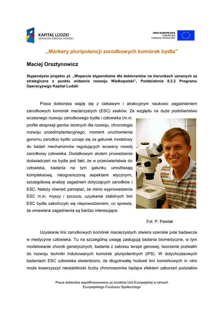 „Markery pluripotencji zarodkowych komórek bydła” Maciej Orsztynowicz Stypendysta projektu pt. „Wsparcie stypendialne dla doktorantów na kierunkach uznanych za strategiczne z punktu widzenia rozwoju Wielkopolski”, Poddziałanie 8.2.2 Programu Operacyjnego Kapitał Ludzki Praca doktorska wiążę się z ciekawym i atrakcyjnym naukowo zagadnieniem zarodkowych komórek macierzystych (ESC) ssaków. Ze względu na duże podobieństwo wczesnego rozwoju zarodkowego bydła i człowieka (m.in. profile ekspresji genów istotnych dla rozwoju, chronologia rozwoju przedimplantacyjnego, moment uruchomienia genomu zarodka) bydło uznaje się za gatunek modelowy do badań mechanizmów regulujących wczesny rozwój zarodkowy człowieka. Dodatkowym atutem prowadzenia doświadczeń na bydle jest fakt, że w przeciwieństwie do człowieka, badania kompleksową, na tym nieograniczoną gatunku umożliwiają aspektami etycznymi, szczegółową analizę zagadnień dotyczących zarodków i ESC. Należy również pamiętać, że mimo wyprowadzenia ESC m.in. myszy i szczura, uzyskanie stabilnych linii ESC bydła zakończyło się niepowodzeniem, co sprawia, że omawiane zagadnienia są bardzo interesujące. Fot. P. Pawlak Uzyskanie linii zarodkowych komórek macierzystych otwiera szerokie pole badawcze w medycynie człowieka. Tu na szczególną uwagę zasługują badania biomedyczne, w tym modelowanie chorób genetycznych, badania z zakresu terapii genowej, tworzenie podwalin do rozwoju techniki indukowanych komórek pluripotentnych (iPS). W dotychczasowych badaniach ESC człowieka stwierdzono, że długotrwałej hodowli linii komórkowych in vitro może towarzyszyć niestabilność liczby chromosomów będąca efektem zaburzeń podziałów Praca doktorska współfinansowana ze środków Unii Europejskiej w ramach Europejskiego Funduszu Społecznego komórkowych. Tego typu zaburzenia zaburzają funkcjonowanie komórek. Ponadto, utrzymywanie się takiego zaburzenia może prowadzić to powstania linii nieprawidłowych komórek, co sprzyja nowotworzeniu. Ocena stabilności chromosomowej w uzyskanych liniach ma określić ich przydatność do celów terapeutycznych. Oryginalnym wkładem pracy doktorskiej będzie bezpośrednio wzbogacenie dotychczasowej wiedzy dotyczącej ESC, a pośrednio ocena ich przydatności np. do terapii komórkowej (m. in. przeszczep szpiku kostnego). Podjęty w pracy doktorskiej wątek nie jest łatwy, jednakże tematyka badań wychodzi naprzeciw zapotrzebowaniu środowiska naukowego. Celami niniejszej pracy jest 1) monitorowanie stabilności kariotypu blastomerów przedimplantacyjnych zarodków (od zygoty do blastocysty) oraz linii komórkowych uzyskanych z węzła zarodkowego (ICM) i trofoblastu (TE) blastocyst bydła na różnych etapach inkubacji (liczba pasaży) oraz 2) ocena przydatności wybranych genów będących markerami różnicowania ESC myszy w analizie pluripotencji komórek bydła. Szczególne znaczenie w badaniach będzie miało zastosowanie nowatorskiej techniki 3D FISH, która umożliwia analizę tzw. terytoriów chromosomowych (CT) w jądrach interfazowych blastomerów oraz wskazanie miejsca danego genu w tym terytorium, co prawdopodobnie ma związek z jego aktywnością transkrypcyjną. Przedmiotem zainteresowania niniejszego projektu są CT chromosomów mieszczących znane geny markerowe różnicowania blastomerów myszy w przedimplantacyjnych zarodkach bydła. Chcemy prześledzić ewentualne zmiany położenia tych chromosomów oraz genów w rozwijającym się zarodku bydła od zygoty do wylęgłej blastocysty. W tym celu wykorzystamy kompleksową procedurę pozyskiwania zarodków bydła in vitro oraz hybrydyzację in situ 3D. Analizą będą objęte chromosomy bydła par 5, 12, 23 i 24 oraz mieszczące się w tych chromosomach geny NANOG (5), CDX2 (12), OCT4 (23) i GATA6 (24). Niniejsze badania niosą określone korzyści dla Wielkopolski. Przede wszystkim poprzez promowanie Uniwersytetu Przyrodniczego w Poznaniu w kraju (współpraca z Zakładem Biotechnologii Rozrodu i Komórek Macierzystych Instytutu Genetyki Człowieka PAN w Poznaniu) i za granicą (współpraca z Uniwersytetem w Hanowerze, Niemcy, Uniwersytetem w Manchester, Wielka Brytania, Instytutem Weterynarii w Brnie, Czechy). Ponadto badania zaowocują wartościowymi publikacjami w czasopismach o znaczącej randze międzynarodowej (Development, Biology of Reproduction, Molecular Reproduction and Development) oraz prezentacją wyników na międzynarodowych konferencjach naukowych. Praca doktorska współfinansowana ze środków Unii Europejskiej w ramach Europejskiego Funduszu Społecznego