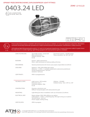 OPRAWY PRZECIWWYBUCHOWE | EXPLOSIONPROOF LIGHT FITTINGS 0403.24 LED ZONE 1,21 & 2,22 Ex e mb IIC T5 Gb Ex tb IIIC T80°C Db ATEX ZONE 1,21 & 2,22 IP66 IK08 Przeciwwybuchowa oprawa z modułem LED przeznaczona do pracy w strefach 1,21 oraz 2,22 zagrożenia wybuchem. Niewielkich rozmiarów konstrukcja doskonale sprawdzi się w małych pomieszczeniach lub korytarzach. Standardowo z siatką ochronną. 1.13 LED bulkhead light fitting destined to work in 1,21 and 2,22 of explosion hazard zones. Compact dimension makes it a great choice for small rooms or corridors lighting. Light fitting equipped with steel protective grid as a standard. DANE TECHNICZNE: Typ źródła światła: moduł LED Żywotność oprawy: >50.000 godzin Klasa ochronności: I Temp. otoczenia: od -30°C do +40° Stopień ochrony: IP66 IK: 08 BUDOWA: Korpus: odlew aluminiowy Klosz: szkło hartowane ze stalową siatką ochronną MOCOWANIE: Oprawa przeznaczona do mocow. przy użyciu wsporników (2x ø9mm) ZASILANIE: Napięcie: 230V, 50Hz (60Hz jako opcja) Dławnica: 1 x M25, 1 x zaślepka (opcjonalne wykonanie przelotowe) Zaciski przyłączeniowe: 3x4 mm2 Zasilanie: końcowe CERTYFIKATY: ATEX w przygotowaniu TECHNICAL DATA: Light source: LED module Protection class: I Protection degree: IP66 IK: 08 Lifetime: >50.000h Ambient temp.: from -30°C to +40° CONSTRUCTION: Housing: aluminium cast Diffuser: tempered glass with steel protective grid MOUNTING: Light fitting for direct installation with use of brackets (2x ø9mm) ELECTRICAL UNIT: Rated voltage: 230V, 50Hz (60Hz as an option) Cable gland: 1 x M25, 1 x blanking plug (through wiring as an option) Terminal block: 3x4 mm2 Power supply: ending wiring. CERTYFICATES: ATEX in progress © Copyright ATM Lighting sp. z o.o. Wszystkie prawa zastrzeżone. Firma ATM Lighting sp. z o.o. zastrzega możliwość wprowadzenia zmian bez uprzedniego informowania. OPRAWY PRZECIWWYBUCHOWE | EXPLOSIONPROOF LIGHT FITTINGS ZONE 1,21 & 2,22 WYMIARY | DIMENSIONS FOTOMETRIA | PHOTOMETRY L1 L 300 B H 450 600 750 TYP | TYPE 0403.24 LED L 350 L1 318 B 210 H 125 DOSTĘPNE WERSJE | AVAILABLE VERSIONS TYP TYPE MOC POWER 0403.24 LED 20-1 0403.24 LED 20-2 0403.24 LED 20-3 20W 20W 20W KOLOR KLOSZA DIFFUSER COLOUR przezroczysty | transparent zielony | green czerwony | red 1.14 AKCESORIA | ACCESSORIES TYP | TYPE Moduł LED Ex Ex LED module (0403.24 LED 10-110) Uszczelka 0403.24 LED Gasket 0403.24 LED (0403.24 LED 10-120) Klosz Diffuser (0403.24 LED 10-130) © Copyright ATM Lighting sp. z o.o. All rights reserved. Technical modification reserved without prior notice. www.atmlighting.pl [email protected] KONFIGURACJA OPRAW | LIGHT FITTING CONFIGURATION 20 10 M 20 PC PC 22 11 P AL PM 30 20 PCI GS GL 33 40 21 22 NIRO SAN SGL typ modułu LED, ich ilość oraz prąd sterowania są z góry ustalone dla danej oprawy LED module type, quantity, forward current are specified for each typ of light fitting 35E - 230V, 0/50-60Hz 34E - 230V, 50-60Hz 11E - 24VDC 20 - 2 żyły końcowe 2 wires ending 22 - 2 żyły przelotowe 2 wires through 30 - 3 żyły końcowe 3 wires ending 33 - 3 żyły przelotowe 3 wires through 40 - 4 żyły końcowe 4 wires ending 44 - 4 żyły przelotowe 4 wires through 10, 11, 20, 21, 22 - układ dławnic pokazano na rysunku poniżej cable glands entries positions are shown below 10 11 20 21 P - dławnica z tworzywa sztucznego plastic cable gland M - dławnica z metalu metal cable gland PCI - przepust kablowy o średnicy Ø20 plastic cable inlets Ø20 22 20 - dławnica M20 M20 cable gland 25 - dławnica M25 M25 cable gland PC - poliwęglan polycarbonate AL - aluminium GS - stal ocynkowana galvanized steel NIRO - stal nierdzewna stainless steel GRP - poliester wzmocniony włóknem zklanym fibre glass strengthened polyester PC - poliwęglan polycarbonate PM - PMMA GL - szkło hartowane tempered glass SAN - kopolimer styrenu i akrylonitrylu styrene acrylonitrile resin SGL - safety-glass dodatkowe opcje additional options materiał klosza materiał obudowy housing material wpusty kablowe cable inlets okablowanie wiring zasilanie power supply prąd sterowania driving current 44 ilość /quantity typ modułu LED / LED module type E przybliżona długość approximate length typ type grupa group L ED ZESTAWIENIE IKON | ICON LIST ATEX oprawa posiada certyfikat ATEX light fitting with ATEX certificate CENTRAL ZONE 1,21 & 2,22 oprawa do strefy 1,21 & 2,22 light fitting for Zone 1,21 & 2,22 LED OPTICS ZONE 2&22 oprawa do strefy 2,22 light fittingfor Zone 2,22 IP65 IP66 IP67 IP68 150J PLK LINE CONNECTION NIRO SECURE LOCK IK10 stopień IP oprawy light fitting’s IP degree oprawa wytrzymuje nacisk do 150J light fitting is able to sustain 150J pressure force oprawa posiada dopuszczenie PKP PLK light fitting with Polish Railway’s approval UV++ RESISTANT NH3 EASY CLEANING SAFETY GLASS HEAVY DUTY HIGH OUTPUT 24 VDC obudowa ze stali nierdzewnej stainless steel housing specjalne śruby zamykające special safety screws materiał odporny na działanie promieni UV UV resistant material oprawa do agresywanego chemicznie środowiska light fitting for chemically agressive environment oprawa wyposażona w dodtakową optykę light fitting with additional optics stopień odporności na udar mechaniczny mechanical shock resistance degree oprawa przeznaczona do ciężkich warunków pracy light fitting for heavy-duty environment oprawa o wysokim strumieniu świetlnym high lumen output light fitting oprawa z opcjonalnym zasilaniem 24VDC light fitting for 24VDC power supply as an option oprawa w II klasie ochronności light fitting in II protection class oprawa może być łączona w linię świetlną light fitting can be connected into trunking line oprawa dedykowana do hodowli zwierząt light fitting destined for animal husbandry CHEMICALLY BATTERY oprawa przeznaczona do współpracy z centralną baterią light fitting suitable to use with central battery NARROW BEAM oprawa o wąskiej charakterystyce strumienia światła light fi