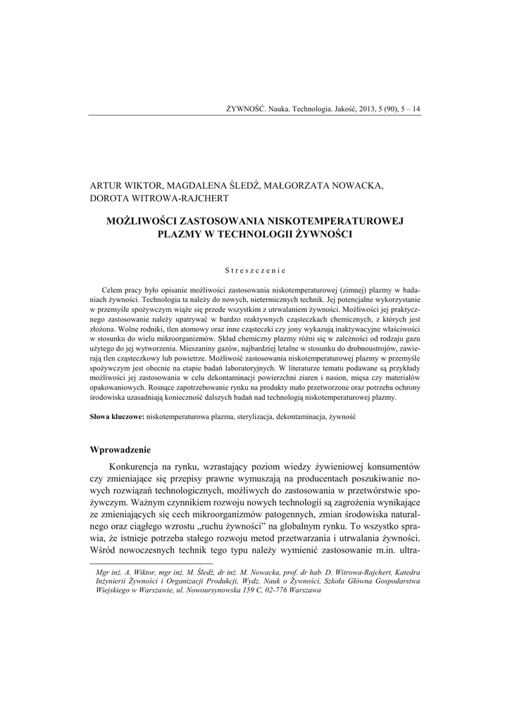 ŻYWNOŚĆ. Nauka. Technologia. Jakość, 2013, 5 (90), 5 – 14 ARTUR WIKTOR, MAGDALENA ŚLEDŹ, MAŁGORZATA NOWACKA, DOROTA WITROWA-RAJCHERT MOŻLIWOŚCI ZASTOSOWANIA NISKOTEMPERATUROWEJ PLAZMY W TECHNOLOGII ŻYWNOŚCI Streszczenie Celem pracy było opisanie możliwości zastosowania niskotemperaturowej (zimnej) plazmy w badaniach żywności. Technologia ta należy do nowych, nietermicznych technik. Jej potencjalne wykorzystanie w przemyśle spożywczym wiąże się przede wszystkim z utrwalaniem żywności. Możliwości jej praktycznego zastosowanie należy upatrywać w bardzo reaktywnych cząsteczkach chemicznych, z których jest złożona. Wolne rodniki, tlen atomowy oraz inne cząsteczki czy jony wykazują inaktywacyjne właściwości w stosunku do wielu mikroorganizmów. Skład chemiczny plazmy różni się w zależności od rodzaju gazu użytego do jej wytworzenia. Mieszaniny gazów, najbardziej letalne w stosunku do drobnoustrojów, zawierają tlen cząsteczkowy lub powietrze. Możliwość zastosowania niskotemperaturowej plazmy w przemyśle spożywczym jest obecnie na etapie badań laboratoryjnych. W literaturze tematu podawane są przykłady możliwości jej zastosowania w celu dekontaminacji powierzchni ziaren i nasion, mięsa czy materiałów opakowaniowych. Rosnące zapotrzebowanie rynku na produkty mało przetworzone oraz potrzeba ochrony środowiska uzasadniają konieczność dalszych badań nad technologią niskotemperaturowej plazmy. Słowa kluczowe: niskotemperaturowa plazma, sterylizacja, dekontaminacja, żywność Wprowadzenie Konkurencja na rynku, wzrastający poziom wiedzy żywieniowej konsumentów czy zmieniające się przepisy prawne wymuszają na producentach poszukiwanie nowych rozwiązań technologicznych, możliwych do zastosowania w przetwórstwie spożywczym. Ważnym czynnikiem rozwoju nowych technologii są zagrożenia wynikające ze zmieniających się cech mikroorganizmów patogennych, zmian środowiska naturalnego oraz ciągłego wzrostu „ruchu żywności” na globalnym rynku. To wszystko sprawia, że istnieje potrzeba stałego rozwoju metod przetwarzania i utrwalania żywności. Wśród nowoczesnych technik tego typu należy wymienić zastosowanie m.in. ultraMgr inż. A. Wiktor, mgr inż. M. Śledź, dr inż. M. Nowacka, prof. dr hab. D. Witrowa-Rajchert, Katedra Inżynierii Żywności i Organizacji Produkcji, Wydz. Nauk o Żywności, Szkoła Główna Gospodarstwa Wiejskiego w Warszawie, ul. Nowoursynowska 159 C, 02-776 Warszawa 6 Artur Wiktor, Magdalena Śledź, Małgorzata Nowacka, Dorota Witrowa-Rajchert dźwięków (US), wysokich ciśnień (HHP), pulsacyjnego pola elektrycznego (PEF) czy pulsacyjnego światła [3, 5, 11, 17, 20]. Należą one do tzw. metod nietermicznych, niegrzewczych (ang. non thermal methods). Oznacza to, że ich zastosowanie nie wiąże się ze wzrostem temperatury produktu i jest skuteczne w temperaturze otoczenia. Technologią, która spełnia wymagania metod nietermicznych i znajduje się w sferze zainteresowania naukowców jest niskotemperaturowa (zimna) plazma [10]. Definicja i rodzaje plazmy Plazma postrzegana jest jako czwarty, podobny do gazu, stan skupienia. Aby wytworzyć plazmę, należy dostarczyć odpowiednią ilość energii, która umożliwi najpierw przekształcenie substancji z ciała stałego w ciekłe, następnie w gaz i na końcu w plazmę. Energia niezbędna do przekształcenia gazu neutralnego w plazmę związana jest ze zjawiskiem jonizacji oraz dysocjacji gazu. Plazma, ze względu na szeroki zakres warunków ciśnienia i temperatury, w których może powstawać, jest najpowszechniej występującym stanem skupienia we Wszechświecie. Tym niemniej, w warunkach panujących na naszej planecie stan plazmy występuje rzadko i najczęściej obserwowany jest w postaci zorzy polarnej [2]. W zależności od rodzaju, plazma może składać się wyłącznie z cząsteczek zjonizowanych oraz wolnych elektronów (jak w przypadku plazmy wysokotemperaturowej, będącej składnikiem gwiazd czy powstającej podczas wybuchu bomby wodorowej), a może także składać się z mieszaniny zarówno zjonizowanych, jak i niezjonizowanych cząsteczek, atomów w stanie podstawowym i wzbudzonych, wolnych rodników oraz elektronów. Ten rodzaj plazmy powstaje w znacznie niższych temperaturach i nosi nazwę zimnej lub niskotemperaturowej plazmy (ang. cold plasma lub non-thermal plasma) [12]. Specyficzną oraz podstawową właściwością plazmy jest obojętność elektryczna, która wiąże się z identyczną liczbą dodatnie i ujemnie naładowanych cząsteczek. Warto podkreślić, że w plazmie możliwe jest występowanie pewnych zakłóceń obojętności elektrycznej, przez co mówi się o jej quasi-neutralności [2]. Z kolei obecność w jej składzie bardzo aktywnych chemicznie cząsteczek, np. rodników hydroksylowych czy tlenu atomowego, który jest uznawany za najbardziej letalny w odniesieniu do drobnoustrojów [9, 15], nadaje plazmie szczególne dekontaminujące właściwości. Inne właściwości wiążą się z tym, że plazma może zawierać w swoim składzie atomy w stanie wzbudzonym. Powrót do stanu podstawowego wiąże się z uwolnieniem pewnej ilości energii. Może to nastąpić na skutek emisji kwantu energii w postaci fotonu albo w wyniku zderzenia z inną cząsteczką chemiczną. Zarówno jedno, jak i drugie zjawisko może wzbudzić reakcję chemiczną korzystną z uwagi na możliwość dekontaminacji żywności czy innej materii [6, 13]. MOŻLIWOŚCI ZASTOSOWANIA NISKOTEMPERATUROWEJ PLAZMY W TECHNOLOGII ŻYWNOŚCI 7 Wytwarzanie plazmy W zależności od rodzaju plazmę można wytworzyć różnymi metodami. Aby mogła powstać plazma gorąca, niezbędne jest bardzo wysokie ciśnienie i równowaga termodynamiczna pomiędzy elektronami i cięższymi cząsteczkami chemicznymi. Warunkiem jest także istnienie ośrodka, z którego plazma może powstać (powietrze, tlen, hel itp.). Wymagania te wiążą się z konieczn