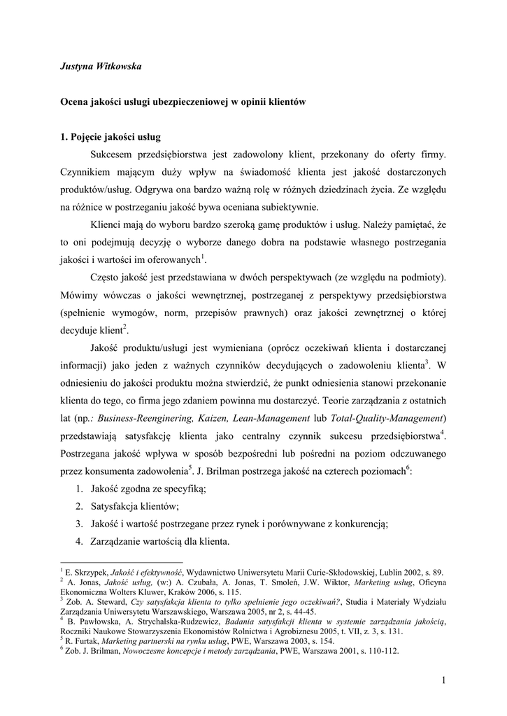 Justyna Witkowska Ocena jakości usługi ubezpieczeniowej w opinii klientów 1. Pojęcie jakości usług Sukcesem przedsiębiorstwa jest zadowolony klient, przekonany do oferty firmy. Czynnikiem mającym duży wpływ na świadomość klienta jest jakość dostarczonych produktów/usług. Odgrywa ona bardzo ważną rolę w różnych dziedzinach życia. Ze względu na różnice w postrzeganiu jakość bywa oceniana subiektywnie. Klienci mają do wyboru bardzo szeroką gamę produktów i usług. Należy pamiętać, że to oni podejmują decyzję o wyborze danego dobra na podstawie własnego postrzegania jakości i wartości im oferowanych1. Często jakość jest przedstawiana w dwóch perspektywach (ze względu na podmioty). Mówimy wówczas o jakości wewnętrznej, postrzeganej z perspektywy przedsiębiorstwa (spełnienie wymogów, norm, przepisów prawnych) oraz jakości zewnętrznej o której decyduje klient2. Jakość produktu/usługi jest wymieniana (oprócz oczekiwań klienta i dostarczanej informacji) jako jeden z ważnych czynników decydujących o zadowoleniu klienta3. W odniesieniu do jakości produktu można stwierdzić, że punkt odniesienia stanowi przekonanie klienta do tego, co firma jego zdaniem powinna mu dostarczyć. Teorie zarządzania z ostatnich lat (np.: Business-Reenginering, Kaizen, Lean-Management lub Total-Quality-Management) przedstawiają satysfakcję klienta jako centralny czynnik sukcesu przedsiębiorstwa4. Postrzegana jakość wpływa w sposób bezpośredni lub pośredni na poziom odczuwanego przez konsumenta zadowolenia5. J. Brilman postrzega jakość na czterech poziomach6: 1. Jakość zgodna ze specyfiką; 2. Satysfakcja klientów; 3. Jakość i wartość postrzegane przez rynek i porównywane z konkurencją; 4. Zarządzanie wartością dla klienta. 1 E. Skrzypek, Jakość i efektywność, Wydawnictwo Uniwersytetu Marii Curie-Skłodowskiej, Lublin 2002, s. 89. A. Jonas, Jakość usług, (w:) A. Czubała, A. Jonas, T. Smoleń, J.W. Wiktor, Marketing usług, Oficyna Ekonomiczna Wolters Kluwer, Kraków 2006, s. 115. 3 Zob. A. Steward, Czy satysfakcja klienta to tylko spełnienie jego oczekiwań?, Studia i Materiały Wydziału Zarządzania Uniwersytetu Warszawskiego, Warszawa 2005, nr 2, s. 44-45. 4 B. Pawłowska, A. Strychalska-Rudzewicz, Badania satysfakcji klienta w systemie zarządzania jakością, Roczniki Naukowe Stowarzyszenia Ekonomistów Rolnictwa i Agrobiznesu 2005, t. VII, z. 3, s. 131. 5 R. Furtak, Marketing partnerski na rynku usług, PWE, Warszawa 2003, s. 154. 6 Zob. J. Brilman, Nowoczesne koncepcje i metody zarządzania, PWE, Warszawa 2001, s. 110-112. 2 1 W przypadku usług E. Gummesson wprowadza zaś cztery parametry jakości7: jakość projektu; jakość wykonania; jakość dostawy; jakość relacji. R. Furtak dodaje do tego jeszcze jeden parametr – dostępność usług8. Koncepcja TQM9 zakłada, że nie ma akceptowalnego poziomu jakości, ponieważ potrzeby i oczekiwania klienta są zmienne i ulegają ewaluacji. Przyjęcie filozofii TQM ma sens tyko wtedy, gdy obejmuje ona wszystkich i wszystko w organizacji. Jakość jest wówczas rozumiana jako dążenie do całkowitej satysfakcji klienta (zadowolenie klienta zewnętrznego i wewnętrznego - pracowników)10. Należy podkreślić, że jakość nie jest pojęciem tożsamym z satysfakcją klienta. Oznacza to, że określony standard jakości nie musi powodować zadowolenia klienta. Główna różnica w terminach „satysfakcja” i „jakość” odnosi się do długości trwania efektu, który to w przypadku satysfakcji może wiązać się z pojedynczą transakcją/zdarzeniem, zaś w przypadku jakości utożsamiany jest zwykle w odniesieniu do jakiegoś standardu i zakłada długoterminową powtarzalność poziomu wykonania. Można więc uznać, że satysfakcja jest pojęciem mniej stabilnym niż jakość. Można także założyć, że satysfakcja jest odczuciem konsumenta po skorzystaniu z usługi, a w związku z tym zawiera więcej substancji emocjonalnej niżeli jakość, w związku z tym analizowana jest z perspektywy wewnętrznej – osobiste doświadczenie11. E. Skrzypek określa jakość jako „spełnienie wymagań i oczekiwań każdego klienta, to droga prowadząca do jego zadowolenia, a zadowolenie to bardzo dobra i wiarygodna miara jakości”12. 2. Jakość usługi ubezpieczeniowej Towarzystwa ubezpieczeń jako instytucje działające na rynku finansowym winny świadczyć usługi o najwyższej jakości. Wysoki poziom jakości usług ubezpieczeniowych zapewni ubezpieczycielom sprawne funkcjonowanie oraz dużą liczbę klientów, którzy 7 M. Huczek, Jakość usług, Ekonomika i Humanistyka WSMiZ, Bielsko-Biała 2000, s. 74. R. Furtak, op. cit., s. 213. 9 TQM - Total Quality Management – Kompleksowe Zarządzanie Jakością. 10 M. Juraszek, Satysfakcja klienta a jakość, Zeszyty Naukowe Wyższej Szkoły Zarządzania i Marketingu w Sosnowcu, Sosnowiec 2005, z. 7-1, s. 64. 11 J. Otto, Jakość a rentowność relacji klientem, Marketing i Rynek 1999, nr 3, s. 7-9. 12 E. Skrzypek, op. cit., s. 9. 8 2 przekazują swoje ryzyko na rzecz zakładu ubezpieczeń. W wyniku tej transakcji w razie zajścia zdarzenia objętego ubezpieczeniem klientowi zostanie wypłacone odszkodowanie lub świadczenie. Precyzyjne określenie jakości usług ubezpieczeniowych przysparza wiele trudności. Badania naukowe prowadzone w różnych krajach dowodzą, że opinie pozyskiwane od klientów o wyrobach, świadczonych usługach, a także reklamacje stanowią podstawę informacji o jakości oferty rynkowej danego przedsiębiorstwa. To klient decyduje o tym, co dla niego oznacza jakość. Przy badaniach satysfakcji klienta jednym z najważniejszych czynników wpływających na zadowolenie jest postrzeganie przez klienta jakości produktu/usługi. „Europejski wskaźnik zadowolenia klienta”, ustalany jest na podstawie jakości postrzeganej przez klienta, ceny, reklamacji i lojalności13. Zatem, aby przedsię