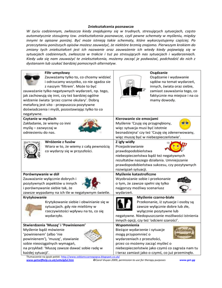 Zniekształcenia poznawcze W życiu codziennym, zwłaszcza kiedy znajdujemy się w trudnych, stresujących sytuacjach, często automatycznie stosujemy tzw. zniekształcenia poznawcze, czyli pewne schematy w myśleniu, między innymi te opisane poniżej. Być może istnieją takie schematy, które wykorzystujemy częściej. Po przeczytaniu poniższych opisów możesz zauważyć, że niektóre brzmią znajomo. Pierwszym krokiem do zmiany tych zniekształceń jest ich nazwanie oraz zauważenie ich wtedy kiedy pojawiają się w sytuacjach codziennych, zwłaszcza w trakcie i tuż po stresujących nas sytuacjach i wydarzeniach. Kiedy uda się nam zauważyć te zniekształcenia, możemy zacząć je podważać, podchodzić do nich z dystansem lub szukać bardziej pomocnych alternatyw. Filtr umysłowy Zauważamy tylko to, co chcemy widzieć i odrzucamy wszystko, co nie zgadza sie z naszym ‘filtrem’. Może to być zauważanie tylko negatywnych wydarzeń, np. tego, jak zachowują się inni, czy też bardziej ogólne widzenie świata ‘przez czarne okulary’. Dobrą metaforą jest sito - przepuszcza pozytywne doświadczenia i myśli, pozostawiając tylko to co negatywne. Czytanie w myślach Zakładanie, że wiemy co inni myślą – zazwyczaj w odniesieniu do nas. Wróżenie z fusów Wiara w to, że wiemy z całą pewnością co wydarzy się w przyszłości. Porównywanie w dół Zauważanie wyłącznie dobrych i pozytywnych aspektów u innych i porównywanie siebie tak, że zawsze wypadamy na ich tle w negatywnym świetle. Krytykowanie Krytykowanie siebie i obwinianie się w sytuacjach. gdy nie mieliśmy w rzeczywistości wpływu na to, co się wydarzyło. Stwierdzenia ‘Muszę’ i ‘Powinienem’ Myślenie bądź mówienie ‘powinienem’ (albo ‘nie powinienem’), ‘muszę’, stawianie sobie nieosiągalnych wymagań, na przykład: ‘Muszę zawsze dawać sobie radę w każdej sytuacji’. Osądzanie Osądzanie i wydawanie sądów na temat wydarzeń, innych, świata oraz siebie, zamiast zauważania tego, co faktycznie ma miejsce i na co mamy dowody. Kierowanie sie emocjami Myślenie ‘Czuję się przygnębiony, więc sytuacja musi być istotnie beznadziejna’ czy też ‘Czuję się zdenerwowany, więc muszę być w niebezpieczeństwie’. Z igły widły Przejaskrawianie prawdopodobieństwa niebezpieczeństwa bądź też negatywnych rezultatów naszego działania. Umniejszanie prawdopodobieństwa sukcesu, czy pozytywnych rozwiązań sytuacji. Myślenie katastroficzne Wyobrażanie sobie i przekonanie o tym, że zawsze spełni się tylko najgorszy możliwy scenariusz wydarzeń. Myślenie czarno-białe Przekonanie, iż sytuacje i osoby są zawsze wyłącznie dobre lub złe, wyłącznie pozytywne lub negatywne. Niedopuszczanie możliwości istnienia innych opcji, czy też ‘odcieni szarości’. Wspomnienia Bieżące wydarzenie i sytuacje mogą przypomnieć o wydarzeniach z przeszłości, przez co możemy zacząć myśleć o niebezpieczeństwie jako czymś co zagraża nam tu i teraz zamiast jako o czymś, co już przeminęło. Tłumaczenie na język polski: http://www.oddamczarnegopsa.blogspot.co.uk/ www.getselfhelp.co.uk/unhelpful.htm ©Carol Vivyan 2009, permission to use for therapy purposes www.get.gg