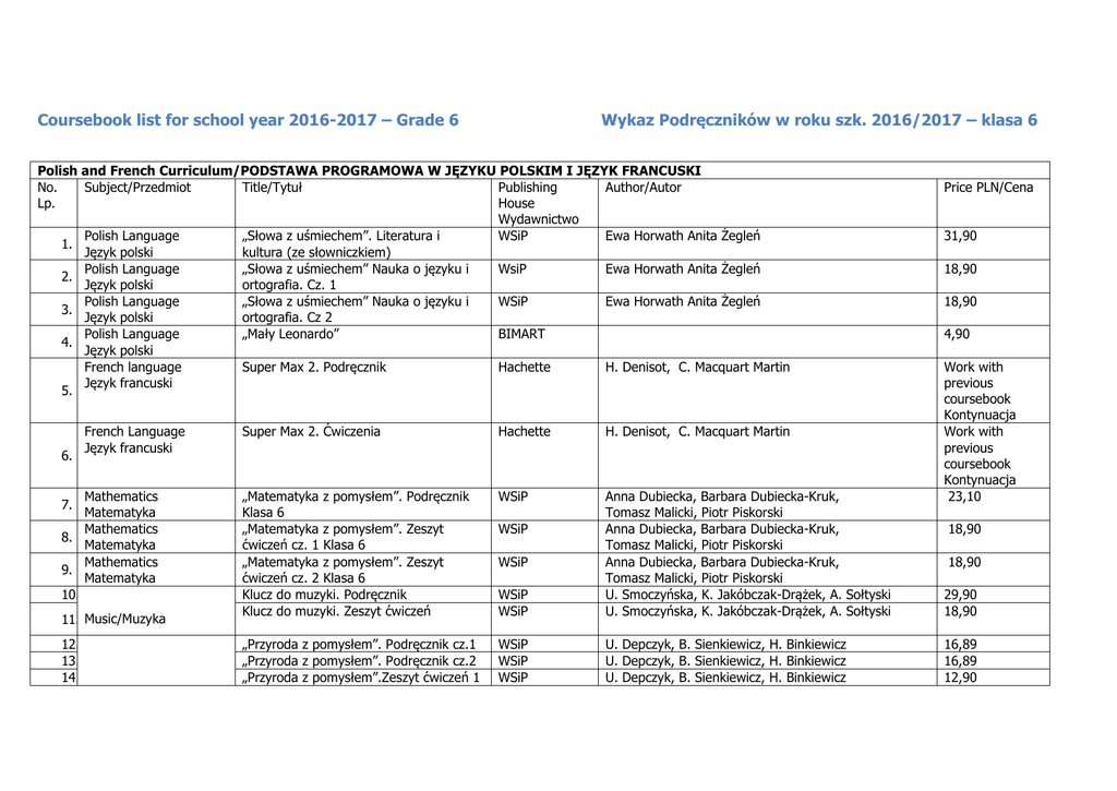 Coursebook list for school year 2016-2017 – Grade 6 Wykaz Podręczników w roku szk. 2016/2017 – klasa 6 Polish and French Curriculum/PODSTAWA PROGRAMOWA W JĘZYKU POLSKIM I JĘZYK FRANCUSKI No. Subject/Przedmiot Title/Tytuł Publishing Author/Autor Lp. House Wydawnictwo Polish Language „Słowa z uśmiechem”. Literatura i WSiP Ewa Horwath Anita Żegleń 1. Język polski kultura (ze słowniczkiem) Polish Language „Słowa z uśmiechem” Nauka o języku i WsiP Ewa Horwath Anita Żegleń 2. Język polski ortografia. Cz. 1 Polish Language „Słowa z uśmiechem” Nauka o języku i WSiP Ewa Horwath Anita Żegleń 3. Język polski ortografia. Cz 2 Polish Language „Mały Leonardo” BIMART 4. Język polski French language Super Max 2. Podręcznik Hachette H. Denisot, C. Macquart Martin Język francuski 5. 6. French Language Język francuski Mathematics Matematyka Mathematics 8. Matematyka Mathematics 9. Matematyka 10. 7. 11. Music/Muzyka 12. 13. 14. Super Max 2. Ćwiczenia Hachette H. Denisot, C. Macquart Martin „Matematyka z pomysłem”. Podręcznik Klasa 6 „Matematyka z pomysłem”. Zeszyt ćwiczeń cz. 1 Klasa 6 „Matematyka z pomysłem”. Zeszyt ćwiczeń cz. 2 Klasa 6 Klucz do muzyki. Podręcznik Klucz do muzyki. Zeszyt ćwiczeń WSiP WSiP WSiP Anna Dubiecka, Barbara Dubiecka-Kruk, Tomasz Malicki, Piotr Piskorski Anna Dubiecka, Barbara Dubiecka-Kruk, Tomasz Malicki, Piotr Piskorski Anna Dubiecka, Barbara Dubiecka-Kruk, Tomasz Malicki, Piotr Piskorski U. Smoczyńska, K. Jakóbczak-Drążek, A. Sołtyski U. Smoczyńska, K. Jakóbczak-Drążek, A. Sołtyski „Przyroda z pomysłem”. Podręcznik cz.1 „Przyroda z pomysłem”. Podręcznik cz.2 „Przyroda z pomysłem”.Zeszyt ćwiczeń 1 WSiP WSiP WSiP U. Depczyk, B. Sienkiewicz, H. Binkiewicz U. Depczyk, B. Sienkiewicz, H. Binkiewicz U. Depczyk, B. Sienkiewicz, H. Binkiewicz WSiP WSiP Price PLN/Cena 31,90 18,90 18,90 4,90 Work with previous coursebook Kontynuacja Work with previous coursebook Kontynuacja 23,10 18,90 18,90 29,90 18,90 16,89 16,89 12,90 15. Science/Przyroda 16. 17. 18. Information technology Informatyka 19. 20. History/Historia 21. 22. Fine Art./Plastyka 23. Craft/Technika 24. 25. 26. Religion/Religia Religion/Religia Canadian Curriculum Program kanadyjski Canadian Curriculum 28. Program kanadyjski 27. 29 Canadian Curriculum Program kanadyjski 30 Canadian Curriculum Program kanadyjski „Przyroda z pomysłem.”Zeszyt ćwiczeń 2 „Przyroda z pomysłem”. Zajęcia warsztatowe. Cz. 1 „Przyroda z pomysłem”. Zajęcia warsztatowe. Cz. 2 „Zajęcia komputerowe – podręcznik multimedialny WSiP WSiP U. Depczyk, B. Sienkiewicz, H. Binkiewicz U. Depczyk, B. Sienkiewicz, H. Binkiewicz 12,90 5,90 WSiP U. Depczyk, B. Sienkiewicz, H. Binkiewicz 5,90 Nowa Era Michał Kęska „Wczoraj i dziś” – podręcznik do historii i społeczeństwa dla kl 6 „Wczoraj i dziś” Zeszyt ucznia klasa 6 cz 1 „Wczoraj i dziś” Zeszyt ucznia klasa 6 cz 2 „Plastyka”. Podręcznik. Kl. 6 „Plastyka”. Zeszyt ćwiczeń. Kl. 6 „Jak to działa” Podręcznik z ćwiczeniami do zajęć technicznych dla kl 4-6 szkoły podstawowej. Nowa Era Grzegorz Wojciechowski Work with previous coursebook Kontynuacja 28,80 Nowa Era Tomasz Maćkowski 17,10 Nowa Era Tomasz Maćkowski 17,10 WSiP WSiP Nowa Era S. Stopczyk, J. Chołacińska B. Neubart Lech Łabecki, Marta Łabecka 27,90 15,90 Work with previous coursebook Kontynuacja 15,90 „Tajemnice BOGAtego życia” Jedność K. Mielnicki, E. Kondrak, E. Parszewska Podręcznik. Zeszyt ćwiczeń. Jedność K. Mielnicki, E. Kondrak, E. Parszewska „Tajemnice BOGAtego życia” Canadian Curriculum/PROGRAM KANADYJSKI Math Makes Sense 6 workbook Pearson Keystone A workbook Pearson Essential Grammar Cambridge University Press Math Makes Sense 6 student book Pearson 9,90 35,00 59,00 Raymond Murphy Work with previous coursebook Kontynuacja From School’s library 31 32 Canadian Curriculum Program kanadyjski Keystone A student book Pearson Canadian Curriculum Program kanadyjski Complete Canadian Curriculum: Grade 6 Popular Book Company (Canada) Limited Z biblioteki szkolnej From School’s library Z biblioteki szkolnej 104,00