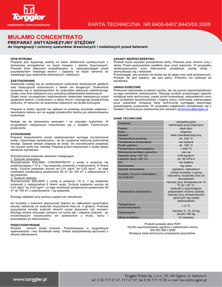 KARTA TECHNICZNA NR 6405-6407,6443/05.2008 MULAMO CONCENTRATO PREPARAT ANTYADHEZYJNY STĘŻONY do impregnacji i ochrony szalunków drewnianych i metalowych przed betonem OPIS WYROBU Preparat jest dyspersją wodną na bazie alkilbenzoli syntetycznych z domieszką emulgatorów na bazie kwasów i eterów tłuszczowych. Posiada silne własności antyadhezyjne, tj. zabezpieczające przed przystawaniem świeżego betonu i zaprawy na bazie cementu do wszelkiego typu szalunków drewnianych i stalowych. ZASTOSOWANIE Doskonale nadaje się do systemowych szalunków drewnianych gładkich oraz tradycyjnych wykonanych z desek nie struganych. Znakomicie sprawdza się w zastosowaniach do szalunków stalowych wielokrotnego użytku oraz form stalowych przy produkcji prefabrykatów betonowych. Dzięki swym szczególnym właściwościom doskonale zabezpiecza przed spojeniem betonu z szalunkiem, a także chroni i impregnuje powierzchnię szalunku. W stosunku do szalunków stalowych nie działa korozyjnie. Preparat w żaden sposób nie wpływa na przebieg procesów wiązania i twardnienia betonu ani na wygląd powierzchni betonu po zdemontowaniu szalunków. ZASADY BEZPIECZEŃSTWA Produkt może wywołać podrażnienia skóry. Podczas prac chronić oczy i skórę. Przed spożywaniem posiłków ręce umyć starannie. W przypadku zanieczyszczenia oczu intensywnie przepłukać czystą wodą i skonsultować się z lekarzem. Przestrzegać, aby produkt nie dostał się do gleby oraz wód podziemnych. Produkt nie jest zapalny, ale jest palny. Produktu nie wylewać do kanalizacji. UWAGI KOŃCOWE Producent odpowiada za jakość wyrobu, ale nie ponosi odpowiedzialności za jego konkretne zastosowania. Stosując produkt przestrzegać zapisów niniejszej karty technicznej, zasad sztuki budowlanej, odpowiednich norm oraz przepisów bezpieczeństwa i higieny pracy. Informacje wykraczające poza zawartość niniejszej karty technicznej wymagają pisemnego potwierdzenia producenta. W przypadku wątpliwości kontaktować się z Działem Technicznym producenta pod adresem [email protected] DANE TECHNICZNE Nadaje się do stosowania wewnątrz i na zewnątrz budynków. W przypadkach nietypowych konsultować się z Działem Technicznym producenta. STOSOWANIE Preparat bezpośrednio przed zastosowaniem wymaga rozcieńczenia wodą i starannego wymieszania - aż do uzyskania mlecznej jednorodnej emulsji. Zawsze wlewać preparat do wody. Do rozcieńczania preparatu nie używać wody tzw. twardej. Preparat przed mieszaniem z wodą należy starannie wymieszać. Rozcieńczenie preparatu stosować następująco: 1. Szalunki drewniane: Rozcieńczenie MULAMO CONCENTRATO z wodą w proporcji nie przekraczającej 1:10 tj. 1 kg preparatu zmieszać z maksymalnie 10 litrami 2 2 wody. Zużycie preparatu wynosi od 0,01 kg/m do 0,02 kg/m , co daje 2 2 możliwość powleczenia powierzchni 50 m do 100 m z zastosowania 1 kg preparatu. 2. Szalunki stalowe: Rozcieńczenie MULAMO z wodą w proporcji 1:6 tj. 1 kg preparatu zmieszać z maksymalnie 6 litrami wody. Zużycie preparatu wynosi od 2 2 0,01 kg/m do 0,02 kg/m , co daje możliwość powleczenia powierzchni 50 2 2 m do 100 m z zastosowania 1 kg preparatu. Działanie: Postać: Kolor: Zapach: Temperatura wrzenia: Temperatura krzepnięcia: Punkt zapłonu: Temperatura samozapłonu: Niebezpieczeństwo wybuchu: o Gęstość (przy +20 C): o Lepkość (przy +20 C): pH: Stosowanie: Sposób stosowania: Kontakt z innymi materiałami niż szalunki: Temperatura stosowania: Emulsję nakładać przy pomocy pędzla lub natryskowo. Do kontaktu z betonem dopuszczać dopiero po całkowitym wyschnięciu emulsji nałożonej na szalunek (wysychanie trwa ok. 2 godzin). Podczas wysychania emulsji szalunki chronić przed deszczem lub mrozem. Emulsję można stosować zarówno na suche jak i wilgotne szalunki - po wcześniejszym oczyszczeniu ich powierzchni z brudu, kurzu i pozostałości po betonowaniu. PRZECHOWYWANIE Produkt chronić przed mrozem. Przechowywać w oryginalnych opakowaniach i bez domieszki wody. Unikać bezpośredniej styczności z silnymi utleniaczami. Temperatura przechowywania: Opakowania: Okres trwałości: antyadhezyjne (eliminacja przyczepności) lepki płyn brązowy lekki charakterystyczny o ok. 330 C nie badana o ok. 160 C o > 400 C nie ma 3 0,90 kg/dcm ok. 50 mPa s nie badany wg opisu pędzlem, natryskiem unikać kontaktu z gumą naturalną i butylową oraz ze styropianem nanosić przy temperaturze +3 o o C do +30 C, szalunki z wyschniętym preparatem można używać również przy temperaturach ujemnych wg zasad betonowania o >0 C kanistry 5, 10, 23 kg beczki 185 kg 12 miesięcy Produkt posiada atest PZH Wyrób wyprodukowano zgodnie z założeniami normy EN ISO 9001:2000 Niniejsza karta techniczna unieważnia poprzednie.