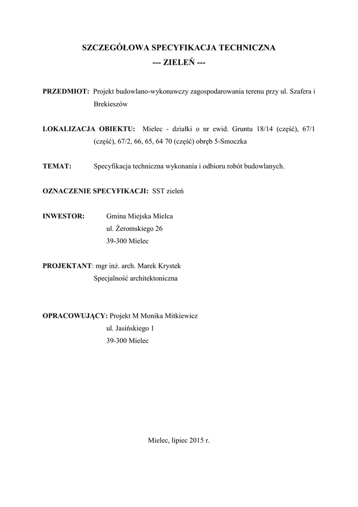 SZCZEGÓŁOWA SPECYFIKACJA TECHNICZNA --- ZIELEŃ --- PRZEDMIOT: Projekt budowlano-wykonawczy zagospodarowania terenu przy ul. Szafera i Brekieszów LOKALIZACJA OBIEKTU: Mielec - działki o nr ewid. Gruntu 18/14 (część), 67/1 (część), 67/2, 66, 65, 64 70 (część) obręb 5-Smoczka TEMAT: Specyfikacja techniczna wykonania i odbioru robót budowlanych. OZNACZENIE SPECYFIKACJI: SST zieleń INWESTOR: Gmina Miejska Mielca ul. Żeromskiego 26 39-300 Mielec PROJEKTANT: mgr inż. arch. Marek Krystek Specjalność architektoniczna OPRACOWUJĄCY: Projekt M Monika Mitkiewicz ul. Jasińskiego 1 39-300 Mielec Mielec, lipiec 2015 r. DZIAŁ: 77000000-0. Usługi rolnicze, leśne, ogrodnicze, hydroponiczne i pszczelarskie. GRUPA: 77300000-3. Usługi ogrodnicze. KLASA: 77310000-6. Usługi sadzenia roślin oraz utrzymania terenów zielonych. KATEGORIA: 77311000-3. Usługi utrzymania ogródków ozdobnych. 2 1. Przedmiot opracowania Przedmiotem opracowania jest szczegółowa specyfikacja techniczna wykonania i odbioru robót budowlanych związanych z wykonaniem zadania pn. Projekt budowlano-wykonawczy zagospodarowania terenu przy ul. Szafera i Brekieszów – działki o nr ewid. gruntu 18/14 (część), 67/1 (część), 67/2, 66, 65, 64 70 (część) obręb 5-Smoczka. Roboty dotyczą zieleni. Podstawą opracowania są: - umowa pomiędzy Zamawiającym a Wykonawcą, - Rozporządzenie Ministra Infrastruktury w sprawie szczegółowego zakresu i formy dokumentacji projektowej, specyfikacji technicznej wykonania i odbioru robót budowlanych oraz programu funkcjonalno-użytkowego (Dz. U. z 2005 nr 2002 poz. 2072), - Wspólny Słownik Zamówień. 2. Przedmiot i zakres robót budowlanych W ramach w/w inwestycji będą wykonywane następujące roboty: • Usunięcie roślin zielnych. • Roboty ziemne związane z przygotowaniem właściwego podłoża dla szaty roślinnej. • Sadzenie szaty roślinnej. • Wykonanie trawnika. • Wyściółkowanie rabat korą. • Pielęgnacja. Szczegółowa Specyfikacja Techniczna jest stosowana jako dokument przetargowy i kontraktowy przy zlecaniu i realizacji robót. 3. Opis prac Roboty towarzyszące i tymczasowe to zabezpieczenie i oznakowanie placu budowy oraz obsługa geodezyjna (wraz z dokumentacją powykonawczą). 4. Informacje o terenie Skwer zlokalizowany jest na działkach o numerach ewidencyjnych 18/14 (część), 67/1 (część), 67/2, 66, 65, 64, 70 (część), obręb 5-Smoczek, w miejscowości Mielec. 3 Teren położony jest u zbiegu ulic Szafera i Brekieszów. Od strony zachodniej graniczy z ciekiem wodnym Trześń Mały, za którym rozciąga się osiedle zabudowy mieszkaniowej jednorodzinnej. Pomiędzy wspomnianym ciekiem a osiedle biegnie linia elektroenergetyczna 110 kV. Od strony wschodniej obszar graniczy z osiedlem zabudowy mieszkaniowej jednorodzinnej, od której oddziela go ulica Szafera. Natomiast po stronie północnej zlokalizowana jest zabudowa usługowo-handlowa, od której teren oddzielony jest ogrodzeniem. 5. Definicje Podstawowe określenia branżowe zawarte w niniejszej ST należy rozumieć następująco: Szata roślinna – ogół roślinności. Drzewo – roślina zdrewniała, z jednym (lub kilkoma) pniem, który rozgałęzia się na pewnej wysokości. Posiada bryłę korzeniową, pień i koronę. Krzew – roślina zdrewniała, wielopędowa. Nie wytwarza pnia ani korony. System korzeniowy – podziemna część rośliny. Forma pienna – forma rośliny z wyraźnie ukształtowanym pniem i koroną. Ziemia urodzajna - w zależności od miejsca pozyskania, powinna posiadać następujące charakterystyki: - ziemia rodzima - powinna być zdjęta przed rozpoczęciem robót budowlanych i zmagazynowana w pryzmach nie przekraczających 1,5 m wysokości, okres jej magazynowania nie powinien przekraczać 2 miesięcy - ziemia pozyskana w innym miejscu i dostarczona na plac budowy - nie może być zagruzowana, przerośnięta korzeniami, zasolona lub zanieczyszczona chemicznie, - dopuszczalna zawartość rozpuszczalnych soli w glebie: maks. 500 ppm. 6. Wymagania ogólne Wykonawca jest odpowiedzialny za jakość wykonywanych robót i ich zgodność z dokumentacją projektową oraz bezpieczeństwo podczas pracy. W przypadku wykrycia błędów lub nieścisłości w dokumentacji projektowej Wykonawca powinien powiadomić Inspektora Nadzoru, który decyduje o poprawkach. W trakcie trwania robót Wykonawca zobowiązany jest do przestrzegania: - przepisów dot. ochrony środowiska, - przepisów dot. ochrony przeciwpożarowej, 4 - ochrony własności prywatnej i publicznej, - przepisów BHP, - ograniczeń obciążeń osi pojazdów przy transporcie materiałów, sprzętu i wyposażenia, - odpowiedniego zabezpieczania terenu budowy, - praw, przepisów i regulaminów związanych z miejscem i czasem wykonywanych robót. W przypadku rozbieżności opis wymiarów ważniejszy jest od odczytu ze skali rysunków. Wyjątkowo dopuszcza się możliwość zastosowania zastępczego materiału roślinnego po wcześniejszej konsultacji z Zamawiającym i Wykonawcą, i ich akceptacji. 7. Wymagania szczegółowe MATERIAŁ ROŚLINNY: Lp. Nazwa łacińska Nazwa polska Rozstawa Ilość D1 Crataegus ×media 'Paul's Scarlet' Głóg pośredni 9 D2 Ginkgo biloba Miłorząb dwuklapowy D3 Betula 'Hoseri' Brzoza 'Hoseri' D4 Malus 'Royalty' Jabłoń 'Royalty' D5 Liriodendron tulipifera 'Aureomarginatum' Liriodendron tulipifera Tulipanowiec amerykański 'Aureomarginatum' Tulipanowiec amerykański K1 Prunus serrulata 'Royal Burgundy' Hamamelis mollis Wiśnia piłkowana 'Royal Burgundy' Oczar omszony K2 Lonicera tatarica 'Arnold Red' Suchodrzew tatarski 'Arnold Red' K3 Kolkwitzia amabilis Kolkwicja chińska K4 Physocarpus opulifolius 'Diabolo' Pęcherznica kalinolistna 'Diabolo' Miejsce docelowe Miejsce docelowe Miejsce docelowe Miejsce docelowe Miejsce docelowe Miejsce docelowe Miejsce docelowe Miejsce docelowe Miejsce docelowe Miejsce docelowe 1,2x1,2m K5 Physocarpus opulifolius 'Nugget' Pęcher