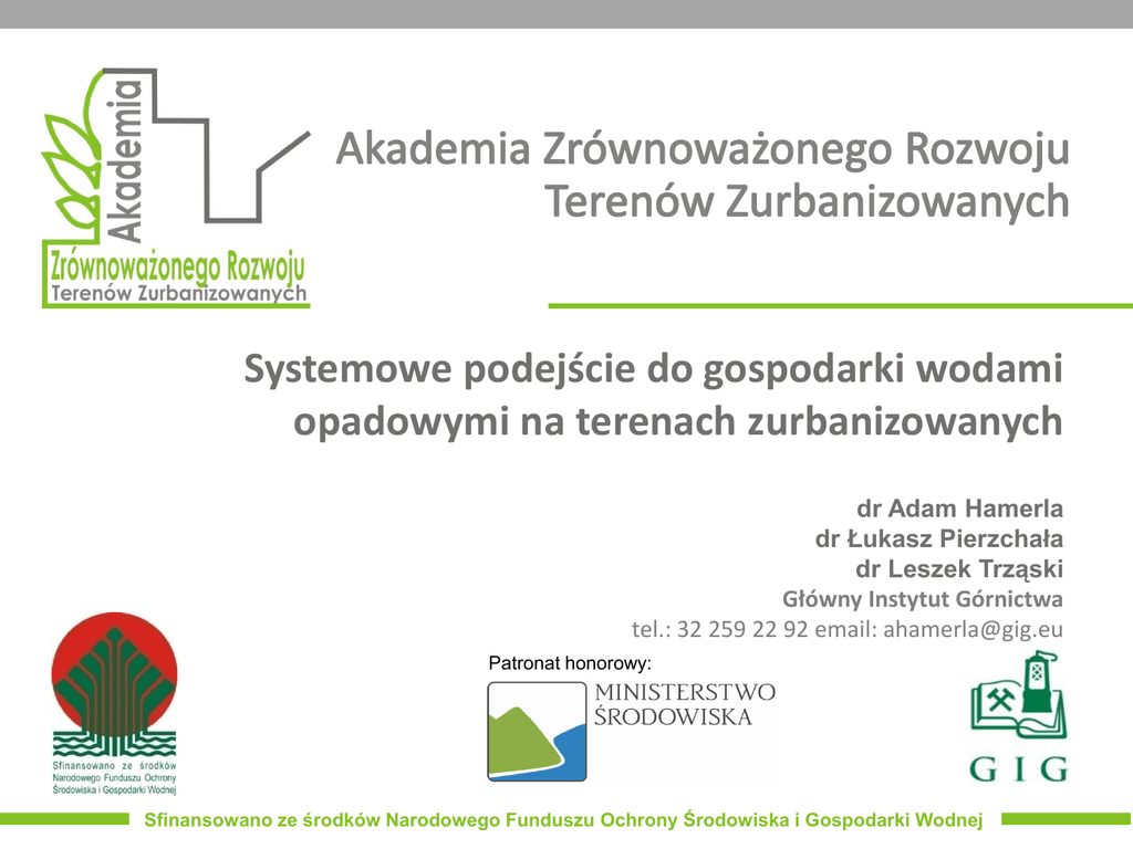 Systemowe podejście do gospodarki wodami opadowymi na terenach zurbanizowanych dr Adam Hamerla dr Łukasz Pierzchała dr Leszek Trząski Główny Instytut Górnictwa tel.: 32 259 22 92 email: [email protected] Patronat honorowy: Sfinansowano ze środków Narodowego Funduszu Ochrony Środowiska i Gospodarki Wodnej Sfinansowano ze środków Narodowego Funduszu Ochrony Środowiska i Gospodarki Wodnej Postępująca miejskich, terenów terenów urbanizacja uszczelnianie retencji wód naturalnych opadowych, objawiające się m.in. wszechobecnym „betonowaniem” obszarów miast (parków, skwerów), często rynków, w ramach pozyskiwanych środków z UE powodują, że zjawiska podtopień i powodzi na terenach miejskich występują coraz częściej. www.azrtz.gig.eu Źródło: wyborcza.pl Istniejące systemy odprowadzania ścieków to często systemy ogólnospławne. W projektowaniu dominuje podejście „oczyszczenia i odprowadzenia”. Cechy charakterystyczne istniejących systemów kanalizacji deszczowej i ogólnospławnej: • • • • duże średnice rurociągów, lokalne podtopienia, napływ znaczących ilości wód do oczyszczalni przelewy burzowe powierzchniowych zanieczyszczeń. www.azrtz.gig.eu ze zrzutem powodujące ich Fot. A. Hamerla bezpośrednio degradację do i wód kumulację SKUTKI: • • • zubożenie zasobów wodnych na skutek odprowadzania wód opadowych systemami rurowymi, przeciążenia hydrauliczne systemów kanalizacyjnych oraz oczyszczalni ścieków, wysokie koszty utrzymania systemu i zapewnienia bezpieczeństwa powodziowego na terenach zurbanizowanych. www.azrtz.gig.eu szerokie partnerstwo multidyscyplinarne zespoły naśladowanie naturalnych procesów DZIAŁANIE NA „POJEMNOŚĆ ZLEWNI” decyzje oparte o konsensus gospodarowanie „deszczówką” zintegrowane z użytkowaniem terenu OCHRONA WŁASNOŚCI I ŚRODOWISKA prewencja (zapobieganie problemom) ekosystemy www.azrtz.gig.eu • holistyczne przestrzenne, (całościowe) społeczne, podejście finansowe, łączące aspekty środowiskowe, techniczne, uwzględniające scenariusze przekształcania zlewni i ich konsekwencje, • odniesienie planowania i gospodarowania do granic zlewni rzecznych, a nie tylko do granic administracyjnych, • powiązanie systemów retencji i infiltracji wód deszczowych ze sferą planowania przestrzennego i planowaniem ochrony przeciwpowodziowej, • dążenie do całkowitego oddzielenia wód deszczowych od ścieków bytowych – eliminacja systemów ogólnospławnych, • eliminowanie „hot-spotów” – zanieczyszczenia wód odpływających z terenów uszczelnionych oraz z terenów intensywnie nawożonych. www.azrtz.gig.eu • Unikanie nadmiernego uszczelnienia powierzchni terenu; • Zwiększanie retencji wód deszczowych zarówno na terenie zlewni, jak w dolinach rzecznych; • Wprowadzanie dostosowanych do lokalnych uwarunkowań systemów łączących sprawność techniczną z walorami estetycznymi, krajobrazowymi i niskimi kosztami utrzymania WDROŻENIE POWYŻSZYCH ZASAD SKŁADA SIĘ NA SYSTEMOWĄ I ZRÓWNOWAŻONĄ GOSPODARKĘ WODAMI OPADOWYMI www.azrtz.gig.eu Współdziałanie w płaszczyźnie WERTYKALNEJ I HORYZONTALNEJ www.azrtz.gig.eu Istniejące już systemy deszczowe można przystosować do nowych wymagań (poprzez retrofityzację); rozwiązania retrofitowe umownie dzieli się na 3 grupy: • • urządzenia retencjonujące wody z obszaru zlewni, retrofity przechwytujące/podczyszczające „on-site” z terenów publicznych, • retrofity przechwytujące/podczyszczające z zabudowy indywidualnej. www.azrtz.gig.eu Źródło: consult.kettering.gov.uk Źródło: england.all.biz www.azrtz.gig.eu Źródło: www.planningresource.co.uk Lokalne rozwiązanie gospodarki wodami deszczowymi – przykład kształtowania zielonej infrastruktury miasta (Portland, Tanner- SpringsPark, USA) Źródło: landperspectives.com • Rozwiązania o funkcji hydrologicznej, ekologicznej i (wykorzystanie wody do poprawy jakości przestrzeni miejskiej) www.azrtz.gig.eu rekreacyjnej W zrównoważonym gospodarowaniu wodami opadowymi ważną role odgrywają rozwiązania bioinżynieryjne, przypominające naturalne zbiorniki/mokradła/zbiorowiska roślinne, często w połączeniu z renaturyzacją koryt rzecznych ZIELONA INFRASTRUKTURA JEST WAŻNĄ CZĘŚCIĄ GOSPODARKI WODAMI OPADOWYMI Kształtowanie zielono-niebeskiej infrastruktury wymaga pełnej integracji gospodarki przestrzennej i zarządzania wodami opadowymi www.azrtz.gig.eu W idei zielonej infrastruktury oraz w zamyśle RDW tkwi świadomość, że zielononiebieska przestrzeń ma być możliwie ciągła Źródło: smithgroupjjr.com www.azrtz.gig.eu Zielona infrastruktura wprowadzona do istniejącej wcześniej zabudowy w ramach nowego podejścia do gospodarki wodami deszczowymi i redukowania efektu wyspy ciepła Philadelphia (USA) Źródło: http://www.phillywatersheds.org/what_were_doing/green_infrastructure www.azrtz.gig.eu Przestrzeń transportu publicznego, elementy tradycyjnej infrastruktury a nawet pojazdy mogą pełnić funkcje zielonej infrastruktury (Nantes, Stuttgart, Filadelfia) Źródło: http://en.wikipedia.org/wiki/Nantes_tramway Źródło: wwww.greenroofs.com www.azrtz.gig.eu Źródło: https://www.flickr.com Zielone dachy są standardowym elementem konstrukcyjnym budynków pasywnych (przedszkole w Staddskogen, Szwecja) www.azrtz.gig.eu • • ponownym urządzaniu terenów porzuconych … (zbiornik i mokradło w dolinie rzeki Ślepiotki, w miejscu po porzuconych ogródkach działkowych. Fot. L. Trząski www.azrtz.gig.eu • … lub przy odsłanianiu „zarurowanych” cieków wodnych • (odsłonięty historyczny kanał w śródmieściu Lipska) Fot. S. Nielsen www.azrtz.gig.eu Działania rewitalizujące w skali zlewni: • Uporządkowanie gospodarki ściekowej w zlewni (redukcją zrzutów biogenów); • Prowadzenie zrównoważonej Fot. Ł Pierzchała produkcji rolniczej (racjonalne nawożenie, ograniczenie erozji). • Zmiana