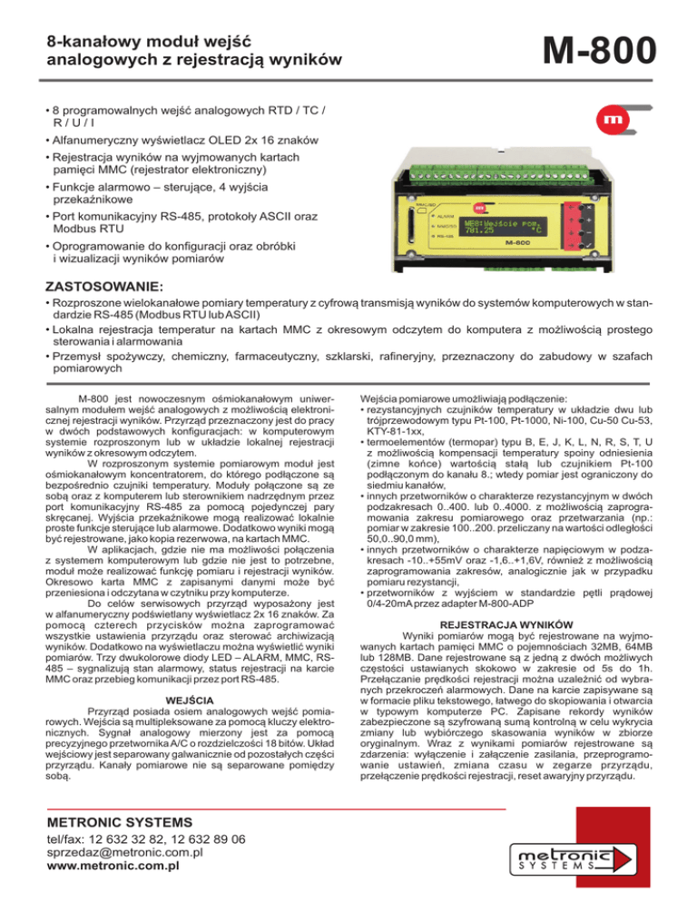 8-kana³owy modu³ wejœæ analogowych z rejestracj¹ wyników M-800 • 8 programowalnych wejœæ analogowych RTD / TC / R/U/I • Alfanumeryczny wyœwietlacz OLED 2x 16 znaków • Rejestracja wyników na wyjmowanych kartach pamiêci MMC (rejestrator elektroniczny) • Funkcje alarmowo – steruj¹ce, 4 wyjœcia przekaŸnikowe • Port komunikacyjny RS-485, protoko³y ASCII oraz Modbus RTU • Oprogramowanie do konfiguracji oraz obróbki i wizualizacji wyników pomiarów ZASTOSOWANIE: • Rozproszone wielokana³owe pomiary temperatury z cyfrow¹ transmisj¹ wyników do systemów komputerowych w standardzie RS-485 (Modbus RTU lub ASCII) • Lokalna rejestracja temperatur na kartach MMC z okresowym odczytem do komputera z mo¿liwoœci¹ prostego sterowania i alarmowania • Przemys³ spo¿ywczy, chemiczny, farmaceutyczny, szklarski, rafineryjny, przeznaczony do zabudowy w szafach pomiarowych M-800 jest nowoczesnym oœmiokana³owym uniwersalnym modu³em wejœæ analogowych z mo¿liwoœci¹ elektronicznej rejestracji wyników. Przyrz¹d przeznaczony jest do pracy w dwóch podstawowych konfiguracjach: w komputerowym systemie rozproszonym lub w uk³adzie lokalnej rejestracji wyników z okresowym odczytem. W rozproszonym systemie pomiarowym modu³ jest oœmiokana³owym koncentratorem, do którego pod³¹czone s¹ bezpoœrednio czujniki temperatury. Modu³y po³¹czone s¹ ze sob¹ oraz z komputerem lub sterownikiem nadrzêdnym przez port komunikacyjny RS-485 za pomoc¹ pojedynczej pary skrêcanej. Wyjœcia przekaŸnikowe mog¹ realizowaæ lokalnie proste funkcje steruj¹ce lub alarmowe. Dodatkowo wyniki mog¹ byæ rejestrowane, jako kopia rezerwowa, na kartach MMC. W aplikacjach, gdzie nie ma mo¿liwoœci po³¹czenia z systemem komputerowym lub gdzie nie jest to potrzebne, modu³ mo¿e realizowaæ funkcjê pomiaru i rejestracji wyników. Okresowo karta MMC z zapisanymi danymi mo¿e byæ przeniesiona i odczytana w czytniku przy komputerze. Do celów serwisowych przyrz¹d wyposa¿ony jest w alfanumeryczny podœwietlany wyœwietlacz 2x 16 znaków. Za pomoc¹ czterech przycisków mo¿na zaprogramowaæ wszystkie ustawienia przyrz¹du oraz sterowaæ archiwizacj¹ wyników. Dodatkowo na wyœwietlaczu mo¿na wyœwietliæ wyniki pomiarów. Trzy dwukolorowe diody LED – ALARM, MMC, RS485 – sygnalizuj¹ stan alarmowy, status rejestracji na karcie MMC oraz przebieg komunikacji przez port RS-485. WEJŒCIA Przyrz¹d posiada osiem analogowych wejœæ pomiarowych. Wejœcia s¹ multipleksowane za pomoc¹ kluczy elektronicznych. Sygna³ analogowy mierzony jest za pomoc¹ precyzyjnego przetwornika A/C o rozdzielczoœci 18 bitów. Uk³ad wejœciowy jest separowany galwanicznie od pozosta³ych czêœci przyrz¹du. Kana³y pomiarowe nie s¹ separowane pomiêdzy sob¹. METRONIC SYSTEMS tel/fax: 12 632 32 82, 12 632 89 06 [email protected] www.metronic.com.pl Wejœcia pomiarowe umo¿liwiaj¹ pod³¹czenie: • rezystancyjnych czujników temperatury w uk³adzie dwu lub trójprzewodowym typu Pt-100, Pt-1000, Ni-100, Cu-50 Cu-53, KTY-81-1xx, • termoelementów (termopar) typu B, E, J, K, L, N, R, S, T, U z mo¿liwoœci¹ kompensacji temperatury spoiny odniesienia (zimne koñce) wartoœci¹ sta³¹ lub czujnikiem Pt-100 pod³¹czonym do kana³u 8.; wtedy pomiar jest ograniczony do siedmiu kana³ów, • innych przetworników o charakterze rezystancyjnym w dwóch podzakresach 0..400. lub 0..4000. z mo¿liwoœci¹ zaprogramowania zakresu pomiarowego oraz przetwarzania (np.: pomiar w zakresie 100..200. przeliczany na wartoœci odleg³oœci 50,0..90,0 mm), • innych przetworników o charakterze napiêciowym w podzakresach -10..+55mV oraz -1,6..+1,6V, równie¿ z mo¿liwoœci¹ zaprogramowania zakresów, analogicznie jak w przypadku pomiaru rezystancji, • przetworników z wyjœciem w standardzie pêtli pr¹dowej 0/4-20mA przez adapter M-800-ADP REJESTRACJA WYNIKÓW Wyniki pomiarów mog¹ byæ rejestrowane na wyjmowanych kartach pamiêci MMC o pojemnoœciach 32MB, 64MB lub 128MB. Dane rejestrowane s¹ z jedn¹ z dwóch mo¿liwych czêstoœci ustawianych skokowo w zakresie od 5s do 1h. Prze³¹czanie prêdkoœci rejestracji mo¿na uzale¿niæ od wybranych przekroczeñ alarmowych. Dane na karcie zapisywane s¹ w formacie pliku tekstowego, ³atwego do skopiowania i otwarcia w typowym komputerze PC. Zapisane rekordy wyników zabezpieczone s¹ szyfrowan¹ sum¹ kontroln¹ w celu wykrycia zmiany lub wybiórczego skasowania wyników w zbiorze oryginalnym. Wraz z wynikami pomiarów rejestrowane s¹ zdarzenia: wy³¹czenie i za³¹czenie zasilania, przeprogramowanie ustawieñ, zmiana czasu w zegarze przyrz¹du, prze³¹czenie prêdkoœci rejestracji, reset awaryjny przyrz¹du. 8-kana³owy modu³ wejœæ analogowych z rejestracj¹ wyników PROGI ALARMOWO – STERUJ¥CE, PRZEKANIKI WYJŒCIOWE Przyrz¹d posiada cztery separowane galwanicznie pó³przewodnikowe przekaŸniki o mo¿liwoœci pod³¹czenia pr¹du sta³ego lub przemiennego. Dla ka¿dego kana³u pomiarowego mog¹ byæ ustawione cztery niezale¿ne progi alarmowo – steruj¹ce. W zale¿noœci od konfiguracji przekaŸników wyjœciowych mo¿e byæ realizowana funkcja sygnalizacji alarmowej lub prostego sterowania dwustanowego. Poprzez ustawienie wartoœci przekroczenia oraz histerezy mo¿na zrealizowaæ lokalne za³¹czenie lub wy³¹czenie elementu wykonawczego (np. wentylator, grza³ka). Stany przekaŸników mog¹ byæ wymuszone przez nadrzêdny system komputerowy. M-800 PORT KOMUNIKACYJNY RS-485 Modu³ posiada separowany od pozosta³ej czêœci uk³adów port komunikacji szeregowej RS-485. Zgodnie ze standardem, do jednej pary przewodów mo¿e byæ pod³¹czonych do 32 urz¹dzeñ, o maksymalnej odleg³oœci linii transmisyjnej do 1300m. Przyrz¹d ma wbudowany protokó³ Modbus RTU (tylko odczyt wyników bie¿¹cych i sterowanie przekaŸnikami wyjœciowymi) oraz ASCII (odczyt wyników bie¿¹cych, programowanie ustawieñ, odczyt archiwum). Prêdkoœæ transmisji ustawia