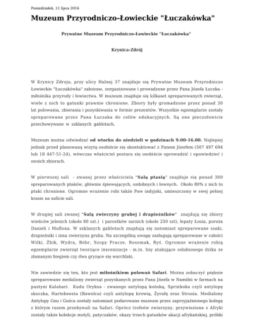 Poniedziałek, 11 lipca 2016 Muzeum Przyrodniczo-Łowieckie "Łuczakówka" Prywatne Muzeum Przyrodniczo-Łowieckie "Łuczakówka" Krynica-Zdrój W Krynicy Zdroju, przy ulicy Halnej 37 znajduje się Prywatne Muzeum Przyrodniczo Łowieckie "Łuczakówka" założone, zorganizowane i prowadzone przez Pana Józefa Łuczka miłośnika przyrody i łowiectwa. W muzeum znajduje się kilkaset spreparowanych zwierząt, wiele z nich to gatunki prawnie chronione. Zbiory były gromadzone przez ponad 30 lat polowania, zbierania i pozyskiwania w formie prezentów. Wszystkie egzemplarze zostały spreparowane przez Pana Łuczaka do celów edukacyjnych. Są one pieczołowicie przechowywane w szklanych gablotach. Muzeum można odwiedzać od wtorku do niedzieli w godzinach 9.00-16.00. Najlepiej jednak przed planowaną wizytą osobiście się skontaktować z Panem Józefem (507 497 694 lub 18 447-51-24), wówczas właściciel postara się osobiście oprowadzić i opowiedzieć i swoich zbiorach. W pierwszej sali - zwanej przez właściciela "Salą ptasią" znajduje się ponad 300 spreparowanych ptaków, głównie śpiewających, ozdobnych i łownych. Około 80% z nich to ptaki chronione. Ogromne wrażenie robi także Paw indyjski, umieszczony w swej pełnej krasie na suficie sali. W drugiej sali zwanej "Salą zwierzyny grubej i drapieżników" znajdują się zbiory wieńców jelenich (około 80 szt.) i parostków sarnich (około 250 szt), łopaty Łosia, poroża Danieli i Muflona. W szklanych gablotach znajdują się natomiast spreparowane ssaki, drapieżniki i inna zwierzyna gruba. Na szczególną uwagę zasługują spreparowane w całości Wilki, Żbik, Wydra, Bóbr, Szopy Pracze, Rosomak, Ryś. Ogromne wrażenie robią egzemplarze zwierząt tworzące inscenizacje - m.in. lisy atakujące osłabionego dzika ze złamanym biegiem czy dwa gryzące się warchlaki. Nie zawiedzie się ten, kto jest miłośnikiem polowań Safari. Można zobaczyć pięknie spreparowane medaliony zwierząt pozyskanych przez Pana Józefa w Namibii w farmach na pustyni Kalahari. Kudu Oryksa - zwanego antylopą końską, Sprinboka czyli antylopę skoczka, Hartebeesta (Bawolca) czyli antylopę krowią, Żyrafę oraz Strusia. Medialony Antylopy Gnu i Guźca zostały natomiast podarowane muzeum przez zaprzyjaźnionego kolegę z którym razem przebywali na Safari. Oprócz trofeów zwierzyny, przywiezione z Afryki zostały także kolekcje motyli, patyczaków, okazy trzech gatunków akacji afrykańskiej, próbki skał z pustyni oraz sól wypiętrzoną z wnętrza ziemi w rejonach pustynnych. Poza kolekcją zwierząt właściciel posiada ogromną kolekcję replik broni palnej, myśliwskiej i wojskowej, wzorce amunicji myśliwskiej szwedzkiej firmy "Norma". Na zakończenie zwiedzania właściciel pokazuje swój unikalny własnoręcznie wykonany karabin, którego kolba w całości pokryta jest masą poroży jeleniowatych i parostków sarnich - robi ogromne wrażenie.
