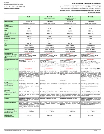 FIN-PRO ul. Nabycińska 19; 53-677 Wrocław Oferta: kredyt mieszkaniowy MDM Cel: zakup | Wartość zabezpieczenia: 310.000,00 | Zabezpieczenie: Mariusz Bedryj; Tel.: +48 509 202 930 E-Mail: [email protected] mieszkanie - pierwotny (przedmiot kredytowania) 75,00 mkw. | Wiek: 25 | Wiek najmłodszego kredytobiorcy (lata): 25 | Ilość dzieci: 1 | Lokalizacja: Wrocław | Dochód: Zatrudnienie na czas nieokreślony (od 24 m.; 4.000, 00 PLN netto; w PLN); Bank 1 Bank 2 Bank 2 ważna do 31.07.2015 ważna do 31.07.2015 Bank 3 bez prowizji Kwota kredytu 274.675,00 274.675,00 274.675,00 274.675,00 (dopłata MDM 35.325,00) (dopłata MDM 35.325,00) (dopłata MDM 35.325,00) (dopłata MDM 35.325,00) 310.000,00 310.000,00 310.000,00 310.000,00 PLN PLN PLN PLN 88,60 % 88,60 % 88,60 % 88,60 % 360 (m-ce) 360 (m-ce) 360 (m-ce) 360 (m-ce) 1,75 % 2,00 % 0,00 % 0,00 % Wartość zabezpieczenia Waluta LTV Okres kredytowania (m-ce) Prowizja Wysokość prowizji 4.806,81 5.493,50 0,00 0,00 Marża 1,74 % 1,75 % 2,05 % 1,80 % Oprocentowanie 3,39 % 3,40 % 3,70 % 3,46 % Rata równa: 1.216,61 równa: 1.218,13 równa: 1.264,28 równa: 1.227,29 malejąca: 1.538,94 malejąca: 1.541,23 malejąca: 1.609,90 malejąca: 1.554,97 Odsetki równa: 163.304,45 równa: 163.852,55 równa: 180.466,62 równa: 167.148,91 malejąca: 140.060,22 malejąca: 140.473,37 malejąca: 152.868,08 malejąca: 142.952,31 ubezpieczenie pomostowe (do czasu wpisania hipoteki do KW) obowiązkowe podwyższenie raty o: równa: 157,23 malejąca: 228,90 podwyższenie marży o: 1 % obowiązkowe podwyższenie raty o: równa: 133,10 malejąca: 194,56 podwyższenie marży o: 0,85 % obowiązkowe podwyższenie raty o: równa: 135,63 malejąca: 194,56 podwyższenie marży o: 0,85 % obowiązkowe podwyższenie raty o: równa: 240,52 malejąca: 343,34 podwyższenie marży o: 1,5 % ubezpieczenie niskiego wkładu obowiązkowe koszt: 896,28 stawka: 0,06 % okres: 1 (m-ce) obowiązkowe podwyższenie raty o: równa: 22,96 malejąca: 34,33 podwyższenie marży o: 0,15 % do czasu osiągnięcia zadłużenia 248.000, 00 (80 % LTV, przez: równa 57 m-cy, malejąca 35 m-cy) obowiązkowe podwyższenie raty o: równa: 23,42 malejąca: 34,33 podwyższenie marży o: 0,15 % do czasu osiągnięcia zadłużenia 248.000, 00 (80 % LTV, przez: równa 59 m-cy, malejąca 35 m-cy) obowiązkowe koszt: 800,25 stawka: 3 % okres: 36 (m-ce) składka liczona od kwoty powyżej 248. 000,00 (80 % LTV, przez: równa 57 m-cy, malejąca 35 m-cy) ubezpieczenie na życie obowiązkowe koszt: 824,03 stawka: 0,3 % okres: 12 (m-ce) składka liczona od salda zadłużenia, suma ubezpieczenia 25% kwoty kredytu; wymagane w przypadku jednego kredytobiorcy lub jedynego żywiciela lub gdy wiek kredytobiorcy w okresie kredytowania przekracza 65 lat obowiązkowe koszt: 98,88 stawka: 0,036 % okres: 1 (m-ce) składka liczona od kwoty udzielonego kredytu, utrzymanie ubezpieczenia przez min. 10 lat obowiązkowe koszt: 98,88 stawka: 0,036 % okres: 1 (m-ce) składka liczona od kwoty udzielonego kredytu, utrzymanie ubezpieczenia przez min. 10 lat koszt: 1.373,38 obniża marżę o: 0,5 % stawka: 0,5 % okres: 12 (m-ce) obniża prowizję o: 2 % składka liczona od kwoty udzielonego kredytu, po 12 miesiącach stawka 0,045 % liczona od rocznicowego salda zadłużenia naliczana co miesiąc, ; obowiązkowe gdy jest jedyny żywiciel rodziny lub dochody każdego z pozostałych są niższe niż 500PLN netto opcjonalne opcjonalne opcjonalne ubezpieczenie od utraty opcjonalne pracy ubezpieczenie nieruchomości koszt: 310,00 obniża marżę o: 0,05 % obowiązkowa polisa stawka: 0,1 % okres: 12 (m-ce) oferta bankowa składka liczona od wartości zabezpieczenia ubezpieczenie pozostałe opcjonalne Wcześniejsza spłata 2% min 200 PLN w całym okresie 3% do 3 lat po tym okresie bez opłat kredytowania Nadpłata 2% min 200 PLN w całym okresie w pierwszych 3 latach bezpłatnie do 30% w pierwszych 3 latach bezpłatnie do 30% 1,5% min 500 PLN przez pierwsze 5 lat, kredytowania aktualnego zadłużenia, po tym okresie aktualnego zadłużenia, po tym okresie potem bezpłatnie bezpłatnie bezpłatnie Wycena mieszkanie - pierwotny: 168 PLN, dla mieszkanie - pierwotny: bez opłat kredytu pow. 300.000 PLN 832 PLN, inspekcja 200PLN Dodatkowe wymogi Eurokonto z wpływami wynagrodzenia i konto Prestige lub kartą debetową, karta kredytowa deklaracją przelewu (rezygnacja podwyższa marżę o 0,1%), kredytowa ubezpieczenie nieruchomości od ognia i innych zdarzeń losowych oferowane przez Bank miesięczna rata z ubezpieczeniami (bez pomostowego) Koszt uruchomienia (bez wyceny nieruchomości) zewnętrzna brak lub obowiązkowa polisa oferta bankowa zewnętrzna lub koszt: 23,35 obniża marżę o: 0,1 % stawka: 0,0085 % okres: 1 (m-ce) składka liczona od salda zadłużenia brak opcjonalne 3% do 3 lat po tym okresie bez opłat 1,5% min 500 PLN przez pierwsze 5 lat, potem bezpłatnie mieszkanie - pierwotny: bez opłat Online/Active, z konto Prestige lub dochodu, karta deklaracją przelewu kredytowa mieszkanie - pierwotny: 450 PLN lub operat z bankowej listy rzeczoznawców, inspekcja 200 PLN Online/Active, z konto z deklarowanymi wpływami 2500 dochodu, karta PLN oraz karta kredytowa (rezygnacja z karty zwiększa marżę o 0,1%) równa: 1.216,61 równa: 1.339,98 równa: 1.386,58 równa: 1.250,64 malejąca: 1.538,94 malejąca: 1.674,45 malejąca: 1.743,12 malejąca: 1.578,31 6.837,12 5.493,50 0,00 2.173,63 Porównanie wygenerowane 08.05.2015 23:43:10 przez qls.com.pl Strona 1 / 2 FIN-PRO ul. Nabycińska 19; 53-677 Wrocław Oferta: kredyt mieszkaniowy MDM Cel: zakup | Wartość zabezpieczenia: 310.000,00 | Zabezpieczenie: Mariusz Bedryj; Tel.: +48 509 202 930 E-Mail: [email protected] mieszkanie - pierwotny (przedmiot kredytowania) 75,00 mkw. | Wiek: 25 | Wiek najmłodszego kredytobiorcy (lata): 25 | Ilość dzieci: 1 | Lokalizacja: Wrocław | Dochód: Zatrudnienie na czas nieokreślony (od 24 m.; 4.000, 00 PLN netto; w PLN); Bank 4 ważna do 30.06.2015 Kwota kre