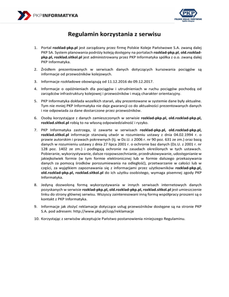 Regulamin korzystania z serwisu 1. Portal rozklad‐pkp.pl jest zarządzany przez firmę Polskie Koleje Państwowe S.A. zwaną dalej PKP SA. System planowania podróży koleją dostępny na portalach rozklad-pkp.pl, old.rozkladpkp.pl, rozklad.sitkol.pl jest administrowany przez PKP Informatyka spółka z o.o. zwaną dalej PKP Informatyka. 2. Źródłem prezentowanych w serwisach danych dotyczących kursowania pociągów są informacje od przewoźników kolejowych. 3. Informacje rozkładowe obowiązują od 11.12.2016 do 09.12.2017. 4. Informacje o opóźnieniach dla pociągów i utrudnieniach w ruchu pociągów pochodzą od zarządców infrastruktury kolejowej i przewoźników i mają charakter orientacyjny. 5. PKP Informatyka dokłada wszelkich starań, aby prezentowane w systemie dane były aktualne. Tym nie mniej PKP Informatyka nie daje gwarancji co do aktualności prezentowanych danych i nie odpowiada za dane dostarczone przez przewoźników. 6. Osoby korzystające z danych zamieszczonych w serwisie rozklad‐pkp.pl, old.rozklad-pkp.pl, rozklad.sitkol.pl robią to na własną odpowiedzialność i ryzyko. 7. PKP Informatyka zastrzega, iż zawarte w serwisach rozklad‐pkp.pl, old.rozklad-pkp.pl, rozklad.sitkol.pl informacje stanowią utwór w rozumieniu ustawy z dnia 04.02.1994 r. o prawie autorskim i prawach pokrewnych (tj. w Dz.U. z 2006 r. nr 90 poz. 631 ze zm.) oraz bazą danych w rozumieniu ustawy z dnia 27 lipca 2001 r. o ochronie baz danych (Dz.U. z 2001 r. nr 128 poz. 1402 ze zm.) i podlegają ochronie na zasadach określonych w tych ustawach. Pobieranie, wykorzystywanie, dalsze rozpowszechnianie, przedrukowywanie, udostępnianie w jakiejkolwiek formie (w tym formie elektronicznej lub w formie dalszego przekazywania danych za pomocą środków porozumiewania na odległość), przetwarzanie w całości lub w części, za wyjątkiem zapoznawania się z informacjami przez użytkowników rozklad‐pkp.pl, old.rozklad-pkp.pl, rozklad.sitkol.pl do ich użytku osobistego, wymaga pisemnej zgody PKP Informatyka. 8. Jedyną dozwoloną formą wykorzystywania w innych serwisach internetowych danych pozyskanych w serwisie rozklad‐pkp.pl, old.rozklad-pkp.pl, rozklad.sitkol.pl jest umieszczenie linku do strony głównej serwisu. Wszyscy zainteresowani inną formą współpracy proszeni są o kontakt z PKP Informatyka. 9. Informacje jak złożyć reklamacje dotyczące usług przewoźników dostępne są na stronie PKP S.A. pod adresem: http://www.pkp.pl/cop/reklamacje 10. Korzystając z serwisów akceptujcie Państwo postanowienia niniejszego Regulaminu. Polityka plików cookies Podmiotami zamieszczającymi informacje w formie plików cookies (tzw. ciasteczek) i innych podobnych technologii w urządzeniu końcowym użytkownika oraz uzyskującym do nich dostęp są: • PKP Informatyka spółka z o.o. z siedzibą w Warszawie przy Al. Jerozolimskich 140. • Polskie Koleje Państwowe S.A. z siedzibą w Warszawie przy ul. Szczęśliwickiej 62 Pliki cookies nie służą identyfikacji użytkownika i na ich podstawie nie jest ustalana tożsamość użytkownika. Pliki typu cookies wykorzystywane są przez PKP SA oraz PKP Informatyka szczególności dla potrzeb: • udostępniania Portali rozklad-pkp.pl, old.rozklad-pkp.pl, rozklad.sitkol.pl użytkownikom, • dostosowywania Portali do potrzeb użytkowników, • tworzenia statystyk oglądalności podstron Portali. • tworzenia statystyk pracy serwisów i odwiedzin użytkowników do celów wewnętrznych i kontrahentów, • prezentacji reklam na serwisach - w szczególności dla określenia treści reklam wyświetlanych na danym urządzeniu końcowym. Użytkownik może w każdej chwili usunąć umieszczone pliki cookie lub zablokować umieszczanie plików cookie za pomocą opcji dostępnych w jego przeglądarce internetowej. PKP Informatyka oraz PKP SA uprzedzają, że usunięcie lub zablokowanie umieszczania plików cookie może spowodować utrudnienia korzystania z Portalu, a nawet uniemożliwić korzystanie z niektórych jego funkcjonalności.
