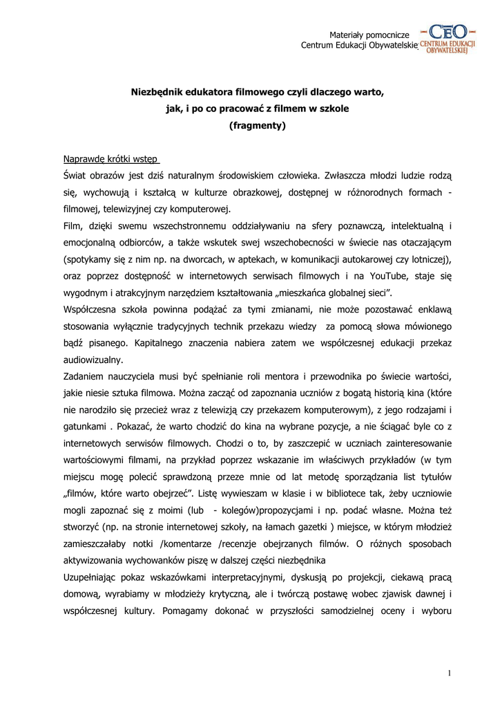 Materiały pomocnicze Centrum Edukacji Obywatelskiej Niezbędnik edukatora filmowego czyli dlaczego warto, jak, i po co pracować z filmem w szkole (fragmenty) Naprawdę krótki wstęp Świat obrazów jest dziś naturalnym środowiskiem człowieka. Zwłaszcza młodzi ludzie rodzą się, wychowują i kształcą w kulturze obrazkowej, dostępnej w różnorodnych formach filmowej, telewizyjnej czy komputerowej. Film, dzięki swemu wszechstronnemu oddziaływaniu na sfery poznawczą, intelektualną i emocjonalną odbiorców, a także wskutek swej wszechobecności w świecie nas otaczającym (spotykamy się z nim np. na dworcach, w aptekach, w komunikacji autokarowej czy lotniczej), oraz poprzez dostępność w internetowych serwisach filmowych i na YouTube, staje się wygodnym i atrakcyjnym narzędziem kształtowania „mieszkańca globalnej sieci”. Współczesna szkoła powinna podążać za tymi zmianami, nie może pozostawać enklawą stosowania wyłącznie tradycyjnych technik przekazu wiedzy za pomocą słowa mówionego bądź pisanego. Kapitalnego znaczenia nabiera zatem we współczesnej edukacji przekaz audiowizualny. Zadaniem nauczyciela musi być spełnianie roli mentora i przewodnika po świecie wartości, jakie niesie sztuka filmowa. Można zacząć od zapoznania uczniów z bogatą historią kina (które nie narodziło się przecież wraz z telewizją czy przekazem komputerowym), z jego rodzajami i gatunkami . Pokazać, że warto chodzić do kina na wybrane pozycje, a nie ściągać byle co z internetowych serwisów filmowych. Chodzi o to, by zaszczepić w uczniach zainteresowanie wartościowymi filmami, na przykład poprzez wskazanie im właściwych przykładów (w tym miejscu mogę polecić sprawdzoną przeze mnie od lat metodę sporządzania list tytułów „filmów, które warto obejrzeć”. Listę wywieszam w klasie i w bibliotece tak, żeby uczniowie mogli zapoznać się z moimi (lub - kolegów)propozycjami i np. podać własne. Można też stworzyć (np. na stronie internetowej szkoły, na łamach gazetki ) miejsce, w którym młodzież zamieszczałaby notki /komentarze /recenzje obejrzanych filmów. O różnych sposobach aktywizowania wychowanków piszę w dalszej części niezbędnika Uzupełniając pokaz wskazówkami interpretacyjnymi, dyskusją po projekcji, ciekawą pracą domową, wyrabiamy w młodzieży krytyczną, ale i twórczą postawę wobec zjawisk dawnej i współczesnej kultury. Pomagamy dokonać w przyszłości samodzielnej oceny i wyboru 1 Materiały pomocnicze Centrum Edukacji Obywatelskiej wartościowej pozycji. Wyzwalamy twórcze inicjatywy, dzięki którym, być może, odkryją własne pasje i talenty. Dlaczego warto wprowadzać film do szkolnej edukacji? Odpowiedź jest prosta. Zgodnie z całościową koncepcją nauczania należy w uczniach rozwijać w sposób spójny obszary intelektualne, emocjonalne, społeczne i kreatywne. Przekaz słowny nauczyciela /autora tekstu lektury lub podręcznika, wkomponowany w tradycyjne metody podawcze nastawione na recepcję i zapamiętywanie, będzie w stanie zaktywizować jedynie intelekt odbiorcy, pozostawiając nienaruszone pozostałe sfery odbioru. Film zaś, dostarczając wiedzy za pomocą słowa, obrazu (a więc koloru, kształtu, ruchu) i dźwięku, odnosi się zarówno do rozumu, jak i do wszystkich zmysłów człowieka. Zapewnia komfort "dotyku rzeczywistości" i znalezienia się w jej centrum. Oraz jej poznania, a nawet zrozumienia. Kino oferuje sam świat, który jest zarazem naszym światem, tym, w którym żyjemy. Szczególnym "oknem na świat" rzeczywisty są, nieocenione jako pomoc dydaktyczna, filmy dokumentalne. Pozwalają "dotknąć" i poznać drugiego człowieka, inne kultury i obyczaje oraz sposób myślenia, wniknąć w świat odległych i egzotycznych dla nas lokalnych społeczności, wreszcie zrozumieć swoje miejsce i miejsce własnej kultury w systemie globalnych współzależności. (…) 3. Jak pracować efektywnie z filmem? - wskazówki praktyczne − • praca z filmem na lekcji i w szkole Proponuję zacząć od wpisania filmu/ filmów, które Państwo znaleźli w ofercie edukacyjnej, do rozkładu materiału. Każdy z nas przygotowuje co roku taki rozkład, warto więc zastanowić się, które zagadnienia programowe można zaprezentować uczniom w postaci przekazu filmowego, mając oczywiście na względzie nie tylko walory artystyczne dzieła, ale i korzyści dydaktyczne, jak i wychowawcze. Wiem z doświadczenia, że trudne i bolesne problemy nietolerancji, wynikającej z uprzedzeń i stereotypów kulturowych, najlepiej omawia się na lekcji np. języka polskiego (przy okazji noweli Mendel Gdański Konopnickiej) czy WOS-u lub nawet na godzinie wychowawczej przy wykorzystaniu filmu jako pretekstu do dyskusji, lub uzupełnienia lektury. (…) Film okazuje się przydatnym materiałem w pracy wychowawcy. Proponuję Państwu umieścić wybrany film/ filmy w planie pracy wychowawczej klasy, ale także całej szkoły. Na początku roku proszę moich wychowanków o wypełnienie anonimowej ankiety, w której pytam o 2 Materiały pomocnicze Centrum Edukacji Obywatelskiej zagadnienia, jakie chcieliby poruszać na lekcjach wychowawczych, oraz proponuję kilka form i metod ich realizacji. W odpowiedziach zawsze pojawia się "film", często nawet konkretny tytuł jako klucz do dyskusji na lekcji. (…) • Drugim krokiem powinno być zbudowanie międzyprzedmiotowej ścieżki filmowej / medialnej, w której znajdą się wybrane (pod kątem programów kilku pokrewnych przedmiotów, oraz nauczycielskich rozkładów materiału) pozycje filmowe. Widzę możliwość współpracy między wykładowcami jęz. polskiego, historii, WOS-u i geografii przy budowaniu szkolnego programu filmowego. Jak to zrobić? Zacząć od ułożenia listy filmów, które mogą wzbogacić (poszerzyć/ pogłębić) lub wręcz zastąpić treści programowe, a następnie wpisać je do swoich rozkładów tak, żeby się nie dublowa