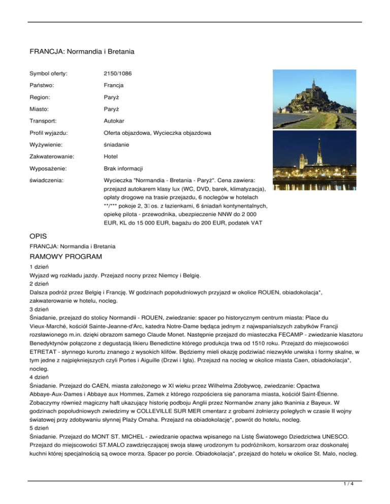 FRANCJA: Normandia i Bretania Symbol oferty: 2150/1086 Państwo: Francja Region: Paryż Miasto: Paryż Transport: Autokar Profil wyjazdu: Oferta objazdowa, Wycieczka objazdowa Wyżywienie: śniadanie Zakwaterowanie: Hotel Wyposażenie: Brak informacji świadczenia: Wycieczka "Normandia - Bretania - Paryż". Cena zawiera: przejazd autokarem klasy lux (WC, DVD, barek, klimatyzacja), opłaty drogowe na trasie przejazdu, 6 noclegów w hotelach **/*** pokoje 2, 3os. z łazienkami, 6 śniadań kontynentalnych, opiekę pilota - przewodnika, ubezpieczenie NNW do 2 000 EUR, KL do 15 000 EUR, bagażu do 200 EUR, podatek VAT OPIS FRANCJA: Normandia i Bretania RAMOWY PROGRAM 1 dzień Wyjazd wg rozkładu jazdy. Przejazd nocny przez Niemcy i Belgię. 2 dzień Dalsza podróż przez Belgię i Francję. W godzinach popołudniowych przyjazd w okolice ROUEN, obiadokolacja*, zakwaterowanie w hotelu, nocleg. 3 dzień Śniadanie, przejazd do stolicy Normandii - ROUEN, zwiedzanie: spacer po historycznym centrum miasta: Place du Vieux-Marché, kościół Sainte-Jeanne-d'Arc, katedra Notre-Dame będąca jednym z najwspanialszych zabytków Francji rozsławionego m.in. dzięki obrazom samego Claude Monet. Następnie przejazd do miasteczka FECAMP - zwiedzanie klasztoru Benedyktynów połączone z degustacją likieru Benedictine którego produkcja trwa od 1510 roku. Przejazd do miejscowości ETRETAT - słynnego kurortu znanego z wysokich klifów. Będziemy mieli okazję podziwiać niezwykłe urwiska i formy skalne, w tym jedne z najpiękniejszych czyli Portes i Aiguille (Drzwi i Igła). Przejazd na nocleg w okolice miasta Caen, obiadokolacja*, nocleg. 4 dzień Śniadanie. Przejazd do CAEN, miasta założonego w XI wieku przez Wilhelma Zdobywcę, zwiedzanie: Opactwa Abbaye-Aux-Dames i Abbaye aux Hommes, Zamek z którego rozpościera się panorama miasta, kościół Saint-Étienne. Zobaczymy również magiczny haft ukazujący historię podboju Anglii przez Normanów znany jako tkaninia z Bayeux. W godzinach popołudniowych zwiedzimy w COLLEVILLE SUR MER cmentarz z grobami żołnierzy poległych w czasie II wojny światowej przy zdobywaniu słynnej Plaży Omaha. Przejazd na obiadokolację*, powrót do hotelu, nocleg. 5 dzień Śniadanie. Przejazd do MONT ST. MICHEL - zwiedzanie opactwa wpisanego na Listę Światowego Dziedzictwa UNESCO. Przejazd do miejscowości ST.MALO zawdzięczającej swoja sławę urodzonym tu podróżnikom, korsarzom oraz doskonałej kuchni której specjalnością są owoce morza. Spacer po porcie. Obiadokolacja*, przejazd do hotelu w okolice St. Malo, nocleg. 1/4 6 dzień Śniadanie. Przejazd do malowniczego FORT LA LATTE i przylądka CAP FREHEL do jednej z najwspanialszych atrakcji przyrodniczych Bretanii - wznoszących się na około 70 m n.p.m. majestatycznych klifów, następnie wejście na taras widokowy latarni. W godzinach popołudniowych przejazd w okolice miasta CARNAC, obiadokolacja*, nocleg. 7 dzień Śniadanie. Przejazd do jednego z najbardziej tajemniczych miejsc w Europie - słynnych megalitów Carnac, zwiedzanie strefy archeologicznej Alignements du Menec i Kermario. Wyjazd z Bretanii w kierunku stolicy Francji. Przyjazd do PARYŻA w godzinach wieczornych, obiadokolacja*, przejazd na Montmartre: zwiedzanie Bazyliki Sacré - Cour wzniesionej na szczycie wzgórza Montmartre, Place du Tertre - jeden z najbardziej malowniczych zakątków Paryża. Przejazd do hotelu na obrzeżach miasta, nocleg. 8 dzień Śniadanie. Zwiedzanie PARYŻA, zwiedzanie: Katedra Notre-Dame, spacer po Dzielnicy Łacińskiej: najstarsza świątynia miasta romański kościół Saint-Germain-des-Prés, Ogrody Luksemburskie, Sorbona, Panteon - miejsce spoczynku m.in. Marii Skłodowskiej-Curie. Następnie Spacer po Polach Elizejskich cieszących się sławą najpiękniejszej ulicy świata. Łuk Triumfalny symbol Francji. Obiadokolacja*. Na pożegnanie z Paryżem wieczorny rejs statkiem po Sekwanie - Paryż by night. Późnym wieczorem wyjazd w drogę powrotną do Polski. Przejazd nocny przez Francję. 9 dzień Dalsza podróż przez Niemcy. Powrót do kraju w godzinach wieczornych. *dopłata do 7 obiadokolacji +480zł WAŻNE INFORMACJE Cena nie zawiera biletów wstępu do zwiedzanych obiektów, rejsu po Sekwanie, biletów na metro w Paryżu, taxy hotelowej, opłat lokalnych przewodników: + ok. 80 EUR. Dopłata do pokoju 1-osobowego: + 480 zł. Cena nie zawiera świadczeń nie wymienionych w ofercie. TRANSPORT 1/ Autobusy podstawowe wyjeżdżają z Katowic lub Krakowa. Z pozostałych miast realizowane są tzw. połączenia antenowe przy min. 6 osobach, realizowane różnymi środkami transportu: samochód osobowy, bus, pociąg, autobusy liniowe. Połączenia antenowe potwierdzane są na 72 godziny przed datą wyjazdu. Linia zachodnia: KATOWICE - Gliwice - Opole - Wrocław Linia północna A: Łódź - Piotrków Tryb. - Częstochowa - KATOWICE Linia północna B: Warszawa - Radom - Skarżysko-Kamienna - Kielce - KRAKÓW - KATOWICE Linia wschodnia: Rzeszów - Dębica - Tarnów - KRAKÓW - KATOWICE Linia południowa: Tychy - KATOWICE 2/ Przewozy antenowe są skomunikowane ze sobą co może powodować oczekiwanie w miejscach przesiadkowych, zwłaszcza w terminach powrotu. 3/ Każdy pasażer może zabrać ze sobą 1 szt. bagażu podstawowego do 20 kg i bagażu podręcznego o wadze do 5 kg. 4/ Istnieje możliwość wyjazdu z innych miejscowości po uzgodnieniu z Biurem ARION. TERMINY: od: 2017-04-06 do: 2017-04-14 (9 dni), miejsca: sprawdź miejsca cena od: 1755 PLN od: 2017-07-15 do: 2017-07-23 (9 dni), miejsca: sprawdź miejsca cena od: 1905 PLN od: 2017-09-02 do: 2017-09-10 (9 dni), miejsca: sprawdź miejsca cena od: 1905 PLN CENNIK: Długość pobytu: 9 dni 9 dni Grupa cenowa: A B (-) (-) Ubezpieczenie (obligatoryjne) (*) ubezpieczenie KL i NNW 2/4 Transport (obligatoryjny) (*) przejazd autokarem klasy lux lub busem Pakiet (obligatoryjny) (*) pakiet świadczeń wg oferty Miasto wyjazdowe (do wyboru) (-) (-) (-) (-) wyj