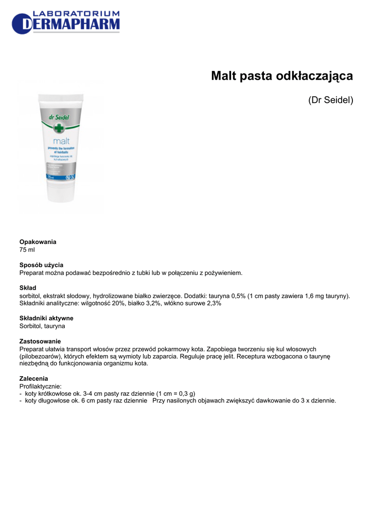 Malt pasta odkłaczająca (Dr Seidel) Opakowania 75 ml Sposób użycia Preparat można podawać bezpośrednio z tubki lub w połączeniu z pożywieniem. Skład sorbitol, ekstrakt słodowy, hydrolizowane białko zwierzęce. Dodatki: tauryna 0,5% (1 cm pasty zawiera 1,6 mg tauryny). Składniki analityczne: wilgotność 20%, białko 3,2%, włókno surowe 2,3% Składniki aktywne Sorbitol, tauryna Zastosowanie Preparat ułatwia transport włosów przez przewód pokarmowy kota. Zapobiega tworzeniu się kul włosowych (pilobezoarów), których efektem są wymioty lub zaparcia. Reguluje pracę jelit. Receptura wzbogacona o taurynę niezbędną do funkcjonowania organizmu kota. Zalecenia Profilaktycznie: - koty krótkowłose ok. 3-4 cm pasty raz dziennie (1 cm = 0,3 g) - koty długowłose ok. 6 cm pasty raz dziennie Przy nasilonych objawach zwiększyć dawkowanie do 3 x dziennie.
