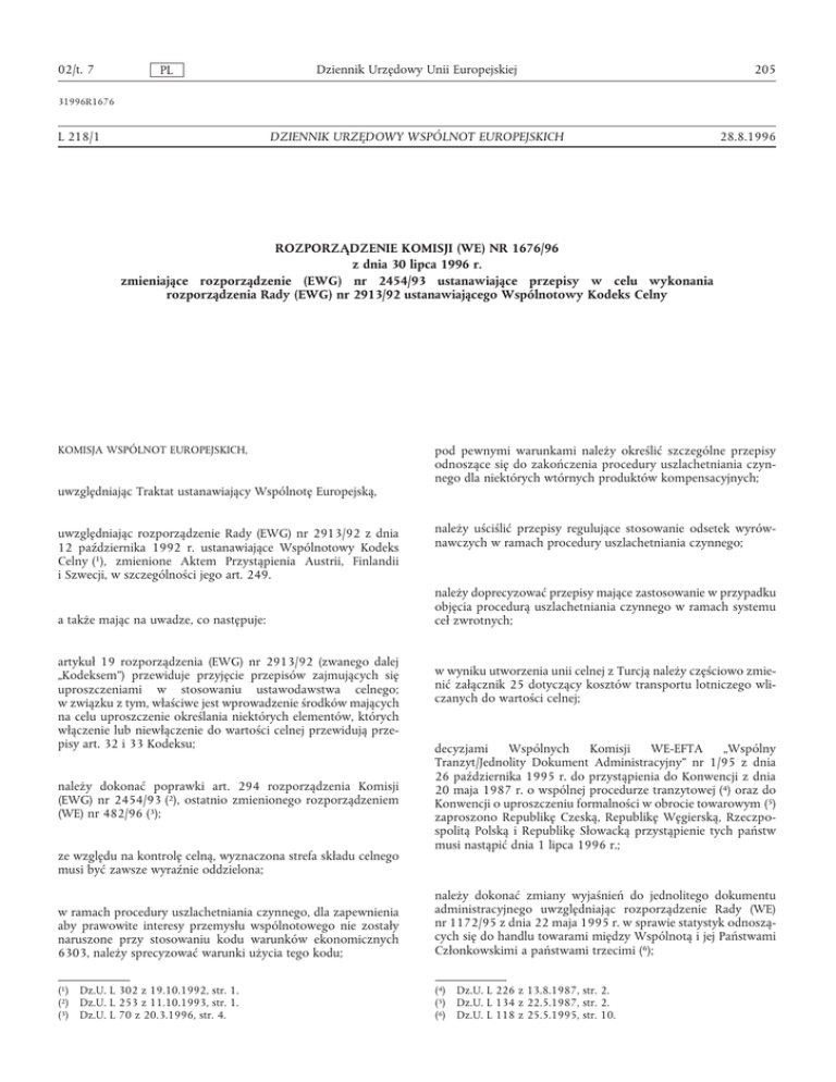 02/t. 7 PL Dziennik Urzędowy Unii Europejskiej 205 31996R1676 L 218/1 DZIENNIK URZĘDOWY WSPÓLNOT EUROPEJSKICH 28.8.1996 ROZPORZĄDZENIE KOMISJI (WE) NR 1676/96 z dnia 30 lipca 1996 r. zmieniające rozporządzenie (EWG) nr 2454/93 ustanawiające przepisy w celu wykonania rozporządzenia Rady (EWG) nr 2913/92 ustanawiającego Wspólnotowy Kodeks Celny KOMISJA WSPÓLNOT EUROPEJSKICH, pod pewnymi warunkami należy określić szczególne przepisy odnoszące się do zakończenia procedury uszlachetniania czynnego dla niektórych wtórnych produktów kompensacyjnych; uwzględniając Traktat ustanawiający Wspólnotę Europejską, uwzględniając rozporządzenie Rady (EWG) nr 2913/92 z dnia 12 października 1992 r. ustanawiające Wspólnotowy Kodeks Celny (1), zmienione Aktem Przystąpienia Austrii, Finlandii i Szwecji, w szczególności jego art. 249. a także mając na uwadze, co następuje: artykuł 19 rozporządzenia (EWG) nr 2913/92 (zwanego dalej „Kodeksem”) przewiduje przyjęcie przepisów zajmujących się uproszczeniami w stosowaniu ustawodawstwa celnego; w związku z tym, właściwe jest wprowadzenie środków mających na celu uproszczenie określania niektórych elementów, których włączenie lub niewłączenie do wartości celnej przewidują przepisy art. 32 i 33 Kodeksu; należy dokonać poprawki art. 294 rozporządzenia Komisji (EWG) nr 2454/93 (2), ostatnio zmienionego rozporządzeniem (WE) nr 482/96 (3); ze względu na kontrolę celną, wyznaczona strefa składu celnego musi być zawsze wyraźnie oddzielona; należy uściślić przepisy regulujące stosowanie odsetek wyrównawczych w ramach procedury uszlachetniania czynnego; należy doprecyzować przepisy mające zastosowanie w przypadku objęcia procedurą uszlachetniania czynnego w ramach systemu ceł zwrotnych; w wyniku utworzenia unii celnej z Turcją należy częściowo zmienić załącznik 25 dotyczący kosztów transportu lotniczego wliczanych do wartości celnej; decyzjami Wspólnych Komisji WE-EFTA „Wspólny Tranzyt/Jednolity Dokument Administracyjny” nr 1/95 z dnia 26 października 1995 r. do przystąpienia do Konwencji z dnia 20 maja 1987 r. o wspólnej procedurze tranzytowej (4) oraz do Konwencji o uproszczeniu formalności w obrocie towarowym (5) zaproszono Republikę Czeską, Republikę Węgierską, Rzeczpospolitą Polską i Republikę Słowacką przystąpienie tych państw musi nastąpić dnia 1 lipca 1996 r.; w ramach procedury uszlachetniania czynnego, dla zapewnienia aby prawowite interesy przemysłu wspólnotowego nie zostały naruszone przy stosowaniu kodu warunków ekonomicznych 6303, należy sprecyzować warunki użycia tego kodu; należy dokonać zmiany wyjaśnień do jednolitego dokumentu administracyjnego uwzględniając rozporządzenie Rady (WE) nr 1172/95 z dnia 22 maja 1995 r. w sprawie statystyk odnoszących się do handlu towarami między Wspólnotą i jej Państwami Członkowskimi a państwami trzecimi (6); (1) Dz.U. L 302 z 19.10.1992, str. 1. (2) Dz.U. L 253 z 11.10.1993, str. 1. (3) Dz.U. L 70 z 20.3.1996, str. 4. (4) Dz.U. L 226 z 13.8.1987, str. 2. (5) Dz.U. L 134 z 22.5.1987, str. 2. (6) Dz.U. L 118 z 25.5.1995, str. 10. 206 Dziennik Urzędowy Unii Europejskiej PL uwzględniając zmiany, które nastąpiły w dziedzinie klasyfikacji taryfowej należy dostosować przepisy dotyczące uszlachetniania czynnego; należy dostosować terminologię załącznika 78 do pojęć używanych w Kodeksie; ze względów natury gospodarczej, związanych z błędną transpozycją kodu CN, właściwe wydaje się dokonanie zmian w wykazie załącznika 87; 02/t. 7 a) przeprowadzenie procedury przewidzianej w art. 259 wiąże się w tych okolicznościach z poniesieniem nieproporcjonalnych kosztów administracyjnych; b) zastosowanie art. 30 i 31 Kodeksu okaże się nieuzasadnione w szczególnych okolicznościach; c) istnieją uzasadnione powody by uznać, że kwota należności przywozowych do pobrania w okresie objętym pozwoleniem nie będzie niższa od kwoty, której by zażądano w przypadku braku pozwolenia; d) nie prowadzi to do naruszenia warunków konkurencji między podmiotami gospodarczymi.”; 2) w art. 294 ust. 2 otrzymuje brzmienie: środki przewidziane w niniejszym rozporządzeniu są zgodne z opinią Komitetu Kodeksu Celnego, „2. W przypadku towarów wymienionych w załączniku 40, termin określony w ust. 1 wynosi pięć lat.”; 3) w art. 504 ust. 4 otrzymuje brzmienie: „4. To samo miejsce nie może być jednocześnie zatwierdzone dla więcej niż jednego składu celnego.”; PRZYJMUJE NINIEJSZE ROZPORZĄDZENIE: Artykuł 1 W rozporządzeniu (EWG) nr 2454/93 wprowadza się następujące zmiany: 1) dodaje się art. 156a w brzmieniu: 4) w art. 552 ust. 1 lit. a), dodaje się pkt (vii) w brzmieniu: „vii) kolejne procesy uszlachetniania określone w art. 557, inne niż te wymienione w pkt i)–vi) (kod 6303).”; 5) w art. 557 skreśla się zdanie drugie; 6) w art. 557 ust. 2 dodaje się lit. f) w brzmieniu: „f) „Artykuł 156a 1. Organy celne mogą, na wniosek osoby zainteresowanej, zezwolić, aby: — — w drodze odstępstwa od art. 32 ust. 2 Kodeksu, niektóre elementy wliczane do ceny faktycznie zapłaconej lub należnej, których nie można oszacować w chwili powstania długu celnego, w drodze odstępstwa od art. 33 Kodeksu, niektóre elementy niewliczane do wartości celnej, w przypadku, gdy kwoty odnoszące się do tych elementów nie są wyodrębnione z ceny zapłaconej lub należnej w chwili powstania długu celnego, W tym celu konieczne jest udowodnienie, że zakończenie procedury na zwykłych zasadach nie jest możliwe lub jest niemożliwe ekonomicznie.”; 7) w art. 589 wprowadza się następujące zmiany: a) 2. Zezwolenie może zostać udzielone tylko w oparciu o następujące warunki: w ust. 2 tiret pierwsze otrzymuje brzmienie: „— w przypadku powstania długu celnego w celu zastosowania preferencji taryfowych przewidzianych w umowach zawartych między Wspólnot