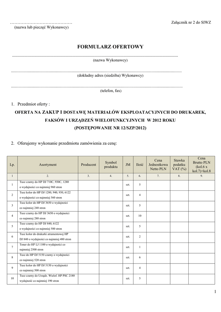 …………………………………… Załącznik nr 2 do SIWZ (nazwa lub pieczęć Wykonawcy) FORMULARZ OFERTOWY ..................................................................................................................................................... (nazwa Wykonawcy) ........................................................................................................................................................................................ (dokładny adres (siedziba) Wykonawcy) ......................................................................................................................................................................................... (telefon, fax) 1. Przedmiot oferty : OFERTA NA ZAKUP I DOSTAWĘ MATERIAŁÓW EKSPLOATACYJNYCH DO DRUKAREK, FAKSÓW I URZĄDZEŃ WIELOFUNKCYJNYCH W 2012 ROKU (POSTĘPOWANIE NR 12/SZP/2012) 2. Oferujemy wykonanie przedmiotu zamówienia za cenę: Lp. Asortyment Producent Symbol produktu 1 2. 3. 4. 1 2 3 4 5 6 7 8 9 10 Tusz czarny do HP DJ 710C, 930C, 1280 o wydajności co najmniej 960 stron Tusz kolor do HP DJ 1280, 940, 930, 6122 o wydajności co najmniej 560 stron Tusz kolor do HP DJ 3650 o wydajności co najmniej 240 stron Tusz czarny do HP DJ 3650 o wydajności co najmniej 280 stron Tusz czarny do HP DJ 840, 6122 o wydajności co najmniej 500 stron Tusz kolor do drukarki atramentowej HP DJ 840 o wydajności co najmniej 480 stron Toner do HP LJ 1100 o wydajności co najmniej 2500 stron Tusz do HP DJ 5150 czarny o wydajności co najmniej 520 stron Tusz kolor do HP DJ 5150 o wydajności co najmniej 500 stron Tusz czarny do Urządz. Wielof. HP PSC 2180 wydajność co najmniej 190 stron Ilość Cena Jednostkowa Netto PLN Stawka podatku VAT (%) Cena Brutto PLN (kol.6 x kol.7)+kol.8 5. 6. 7. 8. 9. szt. 5 szt. 4 szt. 5 szt. 10 szt. 5 szt. 2 szt. 1 szt. 6 szt. 4 szt. 5 JM 1 11 Tusz kolor do Urządz. Wielof. HP PSC 2180 szt. 5 12 Bęben do telefaksu Panasonic KX-FL 613 szt. 8 13 Toner do telefaksu Panasonic KX-FL 613 szt. 16 szt. 40 szt. 4 szt. 4 szt. 4 szt. 4 szt. 1 szt. 1 szt. 5 szt. 1 szt. 64 szt. 5 szt. 8 szt. 2 szt. 2 szt. 10 szt. 30 szt. 2 szt. 6 szt. 6 szt. 6 szt. 6 14 15 Toner do drukarki laserowej A4 Lexmark E 460DN Laser Printer o wydajności co najmniej 15000 stron Toner do drukarki HP Color LJ 2600n o wydajności co najmniej 2500 stron Toner do drukarki HP Color LJ 2600n 16 niebieski o wydajności co najmniej 2000 stron 17 Toner do drukarki HP Color LJ 2600n żółty o wydajności co najmniej 2000 stron Toner do drukarki HP Color LJ 2600n 18 Magenta o wydajności co najmniej 2000 stron 19 20 21 22 23 24 Toner do drukarki laserowej LEXMARK E232 Toner do drukarki HP LJ 1000/1200 o wydajności co najmniej 2500 stron Toner do drukarki HP LJ 1320/1160 o wydajności co najmniej 6000 stron Toner do drukarki HP LJ 1300 o wydajności co najmniej 2500 stron Toner do drukarki HP LJ 1010 /1018/1020/3015/3030 o wydajności co najmniej 2000 stron Toner do drukarki laserowej KYOCERA FS1030/1030DN o wydajności co najmniej 7200 stron Toner do drukarki laserowej KYOCERA 25 FS 2000 DN o wydajności co najmniej 12000 stron Toner do drukarki laserowej KYOCERA 26 FS 1320D o wydajności co najmniej 7200 stron Toner do Urządzenia Wielofunkcyjnego 27 Brother MFC-8370DN o wydajności co najmniej 8000 stron 28 29 30 31 32 33 34 Toner do drukarki laserowej Xerox Phaser 3435 Taśma do drukarki igłowej Epson FX 2190 o wydajności co najmniej 12.000000 znaków Bęben do drukarki laserowej KYOCERA FS 1030 DN Toner do Urz. Wielof. Konica MINOLTA BIZHUB C220 czarny Toner do Urz. Wielof. Konica MINOLTA BIZHUB C220 Yellow Toner do Urz. Wielof. Konica MINOLTA BIZHUB C220 niebieski Toner do Urz. Wielof. Konica MINOLTA BIZHUB C220 czerwony 2 Toner do drukarki laserowej KYOCERA 35 FS 4020 DN o wydajności co najmniej szt. 23 szt. 2 szt. 6 szt. 4 szt. 7 szt. 3 szt. 3 szt. 3 szt. 3 szt. 20 szt. 14 szt. 14 szt. 14 szt. 2 szt. 5 szt. 8 szt. 8 szt. 8 szt. 8 szt. 8 szt. 2 szt. 2 20000 stron 36 37 38 39 Bęben do drukarki laserowej KYOCERA FS 2000 DN Toner do drukarki laserowej Lexmark W850DN o wydajności co najmniej 35000 str. Toner do Urz. Wielof. Kyocera FS-1028MFP o wydajność co najmniej 7200 stron Toner do Urz. Wielof. KM FS-1118MFP o wydajności co najmniej 7200 stron Toner do Urz. Wielof. Kyocera TASK alfa 40 3050CI czarny o wydajności co najmniej 25000 stron Toner do Urz. Wielof. Kyocera TASK alfa 41 3050CI żółty o wydajności co najmniej 15000 stron Toner do Urz. Wielof. Kyocera TASK alfa 42 3050CI magenta o wydajności co najmniej 15000 stron Toner do Urz. Wielof. Kyocera TASK alfa 43 3050CI cyan o wydajności co najmniej 15000 stron 44 45 46 47 48 49 50 Toner czarny do drukarki Samsung CLP 320 o wydajności co najmniej 1500 stron Toner cyan do drukarki Samsung CLP 320 o wydajności co najmniej 1000 stron Toner magenta do drukarki Samsung CLP 320 o wydajności co najmniej 1000 stron Toner żółty do drukarki Samsung CLP 320 o wydajności co najmniej 1000 stron Bęben do BROTHER FAX-2920 o wydajności co najmniej 12000 stron Toner/Czarny do BROTHER FAX-2920 o wydajności co najmniej 2500 stron Tusz/Czarny do drukarki CANON PIXMA iP 4200 o pojemności co najmniej 13ml Tusz/Czarny do drukarki CANON PIXMA 51 iP 4200 PGI-5BK o pojemności co najmniej 26ml 52 53 54 Tusz/Niebieski do drukarki CANON PIXMA iP 4200 o pojemności co najmniej 15,5ml Tusz/Czerwony do drukarki CANON PIXMA iP 4200 o pojemności co najmniej 15,5ml Tusz/Żółty do drukarki CANON PIXMA iP 4200 o pojemności co najmniej 15,5ml Tusz/Czarny do drukarki CANON PIXMA 55 iP 4500 CLI-8BK o pojemności co najmniej 13ml Tusz/Czarny do drukarki CANON PIXMA 56 iP 4500 PGI-5BK o pojemności co najmniej 26ml 3 57 58 59 60 61 62 63 64 65 66 67 68 69 70 71 72 73 74 75 Tusz/Niebieski do drukarki CANON PIXMA iP 4500 o wydajności co najmniej 15,5 ml Tusz/Czerwony do drukarki CANON PIXMA iP 4500 o wydajności co najmniej 15,5 ml Tusz/Żółty do drukarki CANON PIXMA iP 4500 o wy