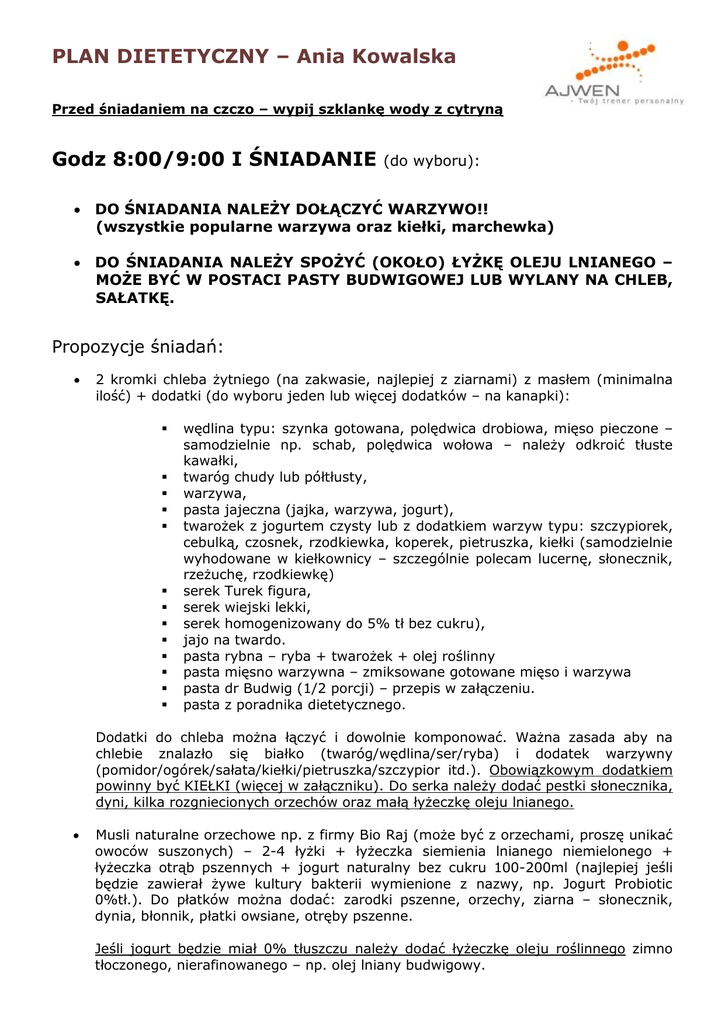 PLAN DIETETYCZNY – Ania Kowalska Przed śniadaniem na czczo – wypij szklankę wody z cytryną Godz 8:00/9:00 I ŚNIADANIE (do wyboru): DO ŚNIADANIA NALEŻY DOŁĄCZYĆ WARZYWO!! (wszystkie popularne warzywa oraz kiełki, marchewka) DO ŚNIADANIA NALEŻY SPOŻYĆ (OKOŁO) ŁYŻKĘ OLEJU LNIANEGO – MOŻE BYĆ W POSTACI PASTY BUDWIGOWEJ LUB WYLANY NA CHLEB, SAŁATKĘ. Propozycje śniadań: 2 kromki chleba żytniego (na zakwasie, najlepiej z ziarnami) z masłem (minimalna ilość) + dodatki (do wyboru jeden lub więcej dodatków – na kanapki): wędlina typu: szynka gotowana, polędwica drobiowa, mięso pieczone – samodzielnie np. schab, polędwica wołowa – należy odkroić tłuste kawałki, twaróg chudy lub półtłusty, warzywa, pasta jajeczna (jajka, warzywa, jogurt), twarożek z jogurtem czysty lub z dodatkiem warzyw typu: szczypiorek, cebulką, czosnek, rzodkiewka, koperek, pietruszka, kiełki (samodzielnie wyhodowane w kiełkownicy – szczególnie polecam lucernę, słonecznik, rzeżuchę, rzodkiewkę) serek Turek figura, serek wiejski lekki, serek homogenizowany do 5% tł bez cukru), jajo na twardo. pasta rybna – ryba + twarożek + olej roślinny pasta mięsno warzywna – zmiksowane gotowane mięso i warzywa pasta dr Budwig (1/2 porcji) – przepis w załączeniu. pasta z poradnika dietetycznego. Dodatki do chleba można łączyć i dowolnie komponować. Ważna zasada aby na chlebie znalazło się białko (twaróg/wędlina/ser/ryba) i dodatek warzywny (pomidor/ogórek/sałata/kiełki/pietruszka/szczypior itd.). Obowiązkowym dodatkiem powinny być KIEŁKI (więcej w załączniku). Do serka należy dodać pestki słonecznika, dyni, kilka rozgniecionych orzechów oraz małą łyżeczkę oleju lnianego. Musli naturalne orzechowe np. z firmy Bio Raj (może być z orzechami, proszę unikać owoców suszonych) – 2-4 łyżki + łyżeczka siemienia lnianego niemielonego + łyżeczka otrąb pszennych + jogurt naturalny bez cukru 100-200ml (najlepiej jeśli będzie zawierał żywe kultury bakterii wymienione z nazwy, np. Jogurt Probiotic 0%tł.). Do płatków można dodać: zarodki pszenne, orzechy, ziarna – słonecznik, dynia, błonnik, płatki owsiane, otręby pszenne. Jeśli jogurt będzie miał 0% tłuszczu należy dodać łyżeczkę oleju roślinnego zimno tłoczonego, nierafinowanego – np. olej lniany budwigowy. propozycja propozycja propozycja propozycja Pomiędzy I i II śniadaniem przynajmniej 3 szklanki wody mineralnej Godz 12:00 II ŚNIADANIE (do wyboru): – do zabrania ze sobą do pracy w pojemniczku hermetycznym: sałatka warzywna z kawałkami kurczaka, cielęciny lub tuńczyka w sosie własnym + pół paczki (50g) brązowego ryżu lub kaszy gryczanej. sałatka warzywna z wędzoną rybą + pół paczki (50g) brązowego ryżu lub kaszy gryczanej. propozycja propozycja propozycja INNE PROPOZYCJE SAŁATEK - w załączeniu kilka przepisów z kaszy i ryżu. W DNI BEZ AKTYWNOŚCI FIZYCZNEJ LEPIEJ JEST WYBRAĆ TAKI WARIANT II ŚNIADANIA: propozycja Pomiędzy II śniadaniem a obiadem przynajmniej 3 szklanki wody mineralnej. Godz 15:00 OBIAD – jednodaniowy Drugie danie: Chude, białe mięso, najlepiej pierś kurczaka, indyka, cielęcina lub królik. 2 x tygodniowo może być czerwone mięso lub wątróbka (należy zrezygnować z karczku). Ryby powinny być spożywane 2-3 x tygodniowo (łosoś, dorsz, śledź, makrela sporadycznie halibut). Info Info info Do mięsa: warzywa surowe, duszone lub gotowane + 2-4łyżki ryżu brązowego lub …… W dni bez aktywności ruchowej zamiast dodatku kasza/ryż lepiej wybrać same warzywa. Warzywa – do woli, jako dodatek do każdego obiadu, najlepiej surowe warzywa sezonowe, a poza sezonem mogą to być ugotowane warzywa z mrożonek. Unikać dodatków tłustych sosów sałatkowych lub śmietany. Warzywa należy skropić odrobiną oliwy z oliwek/olejem lnianym/olejem rzepakowym lub słonecznikowym i cytryną (cytryna powinna zastąpić solenie potraw, można ją użyć zamiast soli do skropienia sałatek warzywnych, do skropienia ryby czy sztuki mięsa). Przyprawiać można również ziołami prowansalskimi czy innymi typu: bazylia, tymianek, koper, pietruszka, majeranek, kminek. Warzywa jeśli będą gotowanie – to najlepiej na parze – wtedy nie ma potrzeby przyprawiania. POMYSŁY NA DIETETYCZNE OBIADY: Link…. PORCJA MIĘSA/RYBY – OK. XXg Przykładowy obiad: Gulasz wołowy z sosem nie zabielanym mąką lecz jogurtem naturalnym + warzywa + ryż/kasza Kotlety rybne z jajkiem + sałatka jarzynowa + warzywa na parze + ryż/kasza Potrawka z mięsa drobiowego z warzywami + ryż/kasza Wątróbka z duszoną cebulą i dodatkiem warzy + ryż/kasza Steki grillowane + warzywa + ryż/kasza Propozycja Propozycja Propozycja Można korzystać z przepisów z poradnika - należy unikać dodatku białej mąki, do obiadu należy zawsze dodać warzywa, olej lniany oraz jedną z kasz: ryż brązowy, ryż dziki, amarantus, komosa ryżowa, kasza gryczana niepalona (można zrezygnować z kaszy w przypadku dużego dodatku warzywnego). OBIAD – co do picia: WODA MINERALNA Bardzo wartościowymi warzywami są …. Z dodatków warzywnych – zamiast sałatek, surówek czy jarzyn na parze mogą być takie dodatki jak: ….. Sos do sałatki: łyżeczka dozwolonego oleju + …. UWAGA TECHNOLOGICZNA: przygotowując mięso, rybę lub warzywa … Dużo przepisów na sałaki jest na stronie: Ciekawe propozycje obiadów można znaleźć na stronie: Pomiędzy obiadem a kolacją przynajmniej 3 szklanki wody mineralnej. Godz 18:00 KOLACJA (do wyboru): Warzywa na patelnię – duszone Propozycja Propozycja Propozycja W RAZIE KŁADZENIA SIĘ SPAĆ O 24:00 KONIECZNY DODATKOWY POSIŁEK O 21:00: Propozycja Propozycja opracowała: Iwona Wierzbicka Ajwen – Dietetyk i Trener Personalny mgr Iwona Wierzbicka tel. 0 502 214 828 www.ajwen.pl Gabinet: Opole (Kolonia Gosławicka), ul. Broniewskiego 26