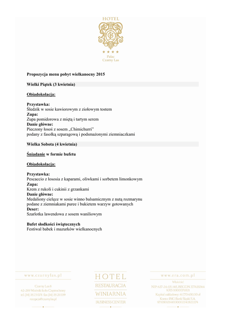 Propozycja menu pobyt wielkanocny 2015 Wielki Piątek (3 kwietnia) Obiadokolacja: Przystawka: Śledzik w sosie kawiorowym z ziołowym tostem Zupa: Zupa pomidorowa z miętą i tartym serem Danie główne: Pieczony łosoś z sosem „Chimichurri” podany z fasolką szparagową i podsmażonymi ziemniaczkami Wielka Sobota (4 kwietnia) Śniadanie w formie bufetu Obiadokolacja: Przystawka: Pescaccio z łososia z kaparami, oliwkami i sorbetem limonkowym Zupa: Krem z rukoli i cukinii z grzankami Danie główne: Medaliony cielęce w sosie winno balsamicznym z nutą rozmarynu podane z ziemniakami puree i bukietem warzyw gotowanych Deser: Szarlotka lawendowa z sosem waniliowym Bufet słodkości świątecznych Festiwal babek i mazurków wielkanocnych Niedziela Wielkanocna (5 kwietnia) Uroczyste śniadanie świąteczne z pokazem kulinarnym na żywo (live station) Uroczysty świąteczny obiad Przystawka: Roladka z kurczaka z szynką parmeńską na pesto z zielonego groszku i bazylii Zupa: Krem chrzanowo ziemniaczany z chrustem z szynki Danie główne: Filet z gęsi faszerowany leśnymi grzybami Roladki wieprzowe po staropolsku Kluski, ziemniaki Kapusta czerwona Buraczki glazurowane Deser: Tiramisu bananowo cytrynowe Bufet słodkości świątecznych Festiwal babek i mazurków wielkanocnych Poniedziałek Wielkanocny (6 kwietnia) Śniadanie świąteczne w formie bufetu Uroczysty świąteczny obiad (za dodatkową opłatą 85 PLN) Przystawka: Marynowana pierś kaczki na sałacie radicchio z balsamicznym sosem Zupa: Krem z białych warzyw z bekonem Danie główne; Polędwiczka wieprzowa owinięta plastrami grillowanej cukinii z sosem z podgrzybka Skoki z królika z sosem musztardowym Kluski, ziemniaki Kolorowe surówki Warzywa gotowane Deser: Ciasto „Leśny Mech” z granatem i sosem brzoskwiniowym