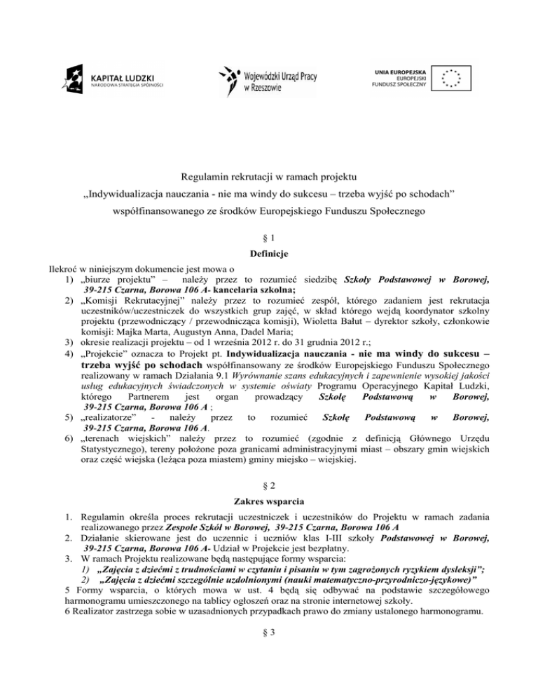 Regulamin rekrutacji w ramach projektu „Indywidualizacja nauczania - nie ma windy do sukcesu – trzeba wyjść po schodach” współfinansowanego ze środków Europejskiego Funduszu Społecznego §1 Definicje Ilekroć w niniejszym dokumencie jest mowa o 1) „biurze projektu” – naleŜy przez to rozumieć siedzibę Szkoły Podstawowej w Borowej, 39-215 Czarna, Borowa 106 A- kancelaria szkolna; 2) „Komisji Rekrutacyjnej” naleŜy przez to rozumieć zespół, którego zadaniem jest rekrutacja uczestników/uczestniczek do wszystkich grup zajęć, w skład którego wejdą koordynator szkolny projektu (przewodniczący / przewodnicząca komisji), Wioletta Bałut – dyrektor szkoły, członkowie komisji: Majka Marta, Augustyn Anna, Dadel Maria; 3) okresie realizacji projektu – od 1 września 2012 r. do 31 grudnia 2012 r.; 4) „Projekcie” oznacza to Projekt pt. Indywidualizacja nauczania - nie ma windy do sukcesu – trzeba wyjść po schodach współfinansowany ze środków Europejskiego Funduszu Społecznego realizowany w ramach Działania 9.1 Wyrównanie szans edukacyjnych i zapewnienie wysokiej jakości usług edukacyjnych świadczonych w systemie oświaty Programu Operacyjnego Kapitał Ludzki, którego Partnerem jest organ prowadzący Szkołę Podstawową w Borowej, 39-215 Czarna, Borowa 106 A ; 5) „realizatorze” naleŜy przez to rozumieć Szkołę Podstawową w Borowej, 39-215 Czarna, Borowa 106 A. 6) „terenach wiejskich” naleŜy przez to rozumieć (zgodnie z definicją Głównego Urzędu Statystycznego), tereny połoŜone poza granicami administracyjnymi miast – obszary gmin wiejskich oraz część wiejska (leŜąca poza miastem) gminy miejsko – wiejskiej. §2 Zakres wsparcia 1. Regulamin określa proces rekrutacji uczestniczek i uczestników do Projektu w ramach zadania realizowanego przez Zespole Szkół w Borowej, 39-215 Czarna, Borowa 106 A 2. Działanie skierowane jest do uczennic i uczniów klas I-III szkoły Podstawowej w Borowej, 39-215 Czarna, Borowa 106 A- Udział w Projekcie jest bezpłatny. 3. W ramach Projektu realizowane będą następujące formy wsparcia: 1) „Zajęcia z dziećmi z trudnościami w czytaniu i pisaniu w tym zagroŜonych ryzykiem dysleksji”; 2) „Zajęcia z dziećmi szczególnie uzdolnionymi (nauki matematyczno-przyrodniczo-językowe)” 5 Formy wsparcia, o których mowa w ust. 4 będą się odbywać na podstawie szczegółowego harmonogramu umieszczonego na tablicy ogłoszeń oraz na stronie internetowej szkoły. 6 Realizator zastrzega sobie w uzasadnionych przypadkach prawo do zmiany ustalonego harmonogramu. §3 Uczestniczki i uczestnicy Projektu 1. W Projekcie uczestniczyć mogą uczennice i uczniowie klas I-III Szkoły Podstawowej w Borowej, 39-215 Czarna, Borowa 106 A, którzy złoŜyli formularz zgłoszeniowy wraz z wymaganymi załącznikami i zostaną zakwalifikowani do udziału w Projekcie przez Komisję Rekrutacyjną. 2. Uczestniczki i uczestnicy Projektu zostaną wybrane/-ni na podstawie złoŜonych formularzy zgłoszeniowych. 3. Liczba osób uczestniczących w zajęciach jest uzaleŜniona od charakteru zajęć: • w Zajęciach z dziećmi z trudnościami w czytaniu i pisaniu w tym zagroŜonych ryzykiem dysleksji liczba uczestników/uczestniczek jednej grupy wynosi do 15 osób, • w Zajęciach z dziećmi szczególnie uzdolnionymi (nauki matematyczno-przyrodniczojęzykowe)” liczba uczestników/uczestniczek jednej grupy wynosi do 14 osób, 4. Przy wyborze uczestniczek i uczestników Projektu Komisja Rekrutacyjna kierować będzie się, oprócz wymogów określonych w ust.1, następującymi preferencjami dla poszczególnych działań: (przykłady) I. zajęcia wyrównawcze dla dzieci z trudnościami w czytaniu i pisaniu: uczniowie i uczennice z orzeczeniem lub opinią poradni psychologiczno-pedagogicznej (moŜna oceniać na podstawie wagi punktowej) i na podstawie obserwacji nauczyciela II. zajęcia z dziećmi szczególnie uzdolnionymi (mauki matematyczno-przyrodniczojęzykowe): na podstawie obserwacji nauczyciela 5. Uczennice i uczniowie mają prawo do udziału w więcej niŜ jednym rodzaju zajęć (z zastrzeŜeniem braku moŜliwości dwukrotnego udziału w takich samych zajęciach). 6. Dopuszcza się zmianę przez uczennicę/ucznia danej formy zajęć podczas ich trwania, z zastrzeŜeniem § 3 pkt 3. §4 Proces rekrutacji 1. 2. 3. 4. 5. 6. 7. 8. 9. 10. 11. Rekrutacja prowadzona jest w sposób bezstronny, z poszanowaniem zasady równości płci. Rekrutacja do Projektu przeprowadzana będzie od 10.09.2012 r. do 14.09.2012 r. września Dopuszcza się rekrutację uzupełniającą w trakcie roku szkolnego. Informacje o terminie rekrutacji dostępne będą na tablicy ogłoszeń w siedzibie szkoły, na stronie internetowej szkoły, przekazywane będą w formie ustnej przez wychowawców klas. Uczniowie ubiegający się o uczestnictwo w Projekcie składają formularz zgłoszeniowy (wzór załącznik nr 1 do niniejszego regulaminu) wraz z wymaganymi załącznikami, o których mowa w formularzu, do koordynatora/ koordynatorki z ramienia szkoły(w biurze Projektu) w terminie do dnia 14.09.2012 r. września 2012 r. W przypadku uchybień formalnych wymagań rekrutacji uczennica/uczeń bądź opiekun prawny moŜe zostać poproszony bezpośrednio lub drogą telefoniczną lub pisemnie o uzupełnienie braków w dokumentacji w ciągu trzech dni roboczych. Zgłoszenia, które wpłyną po terminie lub będą miały braki formalne, które nie zostały uzupełnione w ciągu 3 dni roboczych od wezwania do uzupełnienia nie będą rozpatrywane. Dane zawarte w formularzu weryfikuje pod względem formalnym osoba odpowiedzialna za rekrutację. O zakwalifikowaniu uczniów/uczennic do danej formy zajęć decyduje Komisja Rekrutacyjna na podstawie niniejszego regulaminu. Komisja Rekrutacyjna w terminie do 14 września kaŜdego roku podejmuje decyzję o zakwalifikowaniu do Projektu uczniów i uczennic spełniających wymogi formalne. Komisja ustala