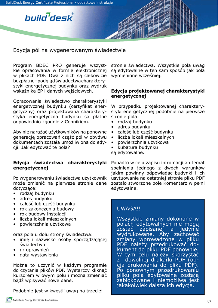 BuildDesk Energy Certificate Professional - dodatkowe instrukcje Edycja pól na wygenerowanym świadectwie Program BDEC PRO generuje wszystkie opracowania w formie elektronicznej w plikach PDF. Dwa z nich są całkowicie bezpłatne - podgląd świadectwa charakterystyki energetycznej budynku oraz wydruk wskaźnika EP i danych wejściowych. Opracowania świadectwo charakterystyki energetycznej budynku (certyfikat energetyczny) oraz projektowana charakterystyka energetyczna budynku sa płatne odpowiednio zgodnie z Cennikiem. Aby nie narażać użytkowników na ponowne generację opracowań część pól w obydwu dokumentach została umożliwiona do edycji. Jak edytować te pola? Edycja świadectwa energetycznej stronie świadectwa. Wszystkie pola uwag są edytowalne w ten sam sposób jak pola wymienione wcześniej. Edycja projektowanej charakterystyki energetycznej W przypadku projektowanej charakterystyki energetycznej podobnie na pierwsze stronie pola: • rodzaj budynku • adres budynku • całość lub część budynku • liczba lokali mieszkalnych • powierzchnia użytkowa • kubatura budynku są edytowalne. charakterystyki Ponadto w celu zapisu infromacji an temat spełnienia jednego z dwóch warunków jakim powinny odpowiadac budynki i ich Po wygenerowaniu świadectwa użytkownik usytuowanie na ostatniej stronie pliku PDF może zmienić na pierwsze stronie dane zostało stworzone pole Komentarz w pełni dotyczące: edytowalne. • rodzaj budynku • adres budynku • całość lub część budynku UWAGA!! • rok zakończenia budowy • rok budowy instalacji Wszystkie zmiany dokonane w • liczba lokali mieszkalnych polach edytowalnych nie mogą • powierzchnia użytkowa oraz pola u dołu strony świadectwa: • imię i nazwisko osoby sporządzającej świadectwo • nr uprawnień • data wystawienia Można to uczynić w każdym programie do czytania plików PDF. Wystarczy kliknąć kursorem w owym polu i można zmieniać bądź wpisywać nowe dane. Podobnie jest w kwestii uwag na trzeciej BuildDesk Energy Certificate Professional zostać zapisane, a jedynie wydrukowane. Aby zachować zmiany wprowadzone w pliku PDF należy przedrukować dokument do pliku PDF ponownie. W tym celu należy skorzystać z dowolnej drukarki PDF (opcja drukowania do pliku PDF). Po ponownym przedrukowaniu pliku pola edytowalne zostają zablokowane i niemożliwa jest jakakolwiek dalsza ich edycja. 1/5 BuildDesk Energy Certificate Professional - dodatkowe instrukcje BuildDesk Energy Certificate Professional 2/5 BuildDesk Energy Certificate Professional - dodatkowe instrukcje BuildDesk Energy Certificate Professional 3/5 BuildDesk Energy Certificate Professional - dodatkowe instrukcje BuildDesk Energy Certificate Professional 4/5 BuildDesk Energy Certificate Professional - dodatkowe instrukcje BuildDesk Energy Certificate Professional 5/5